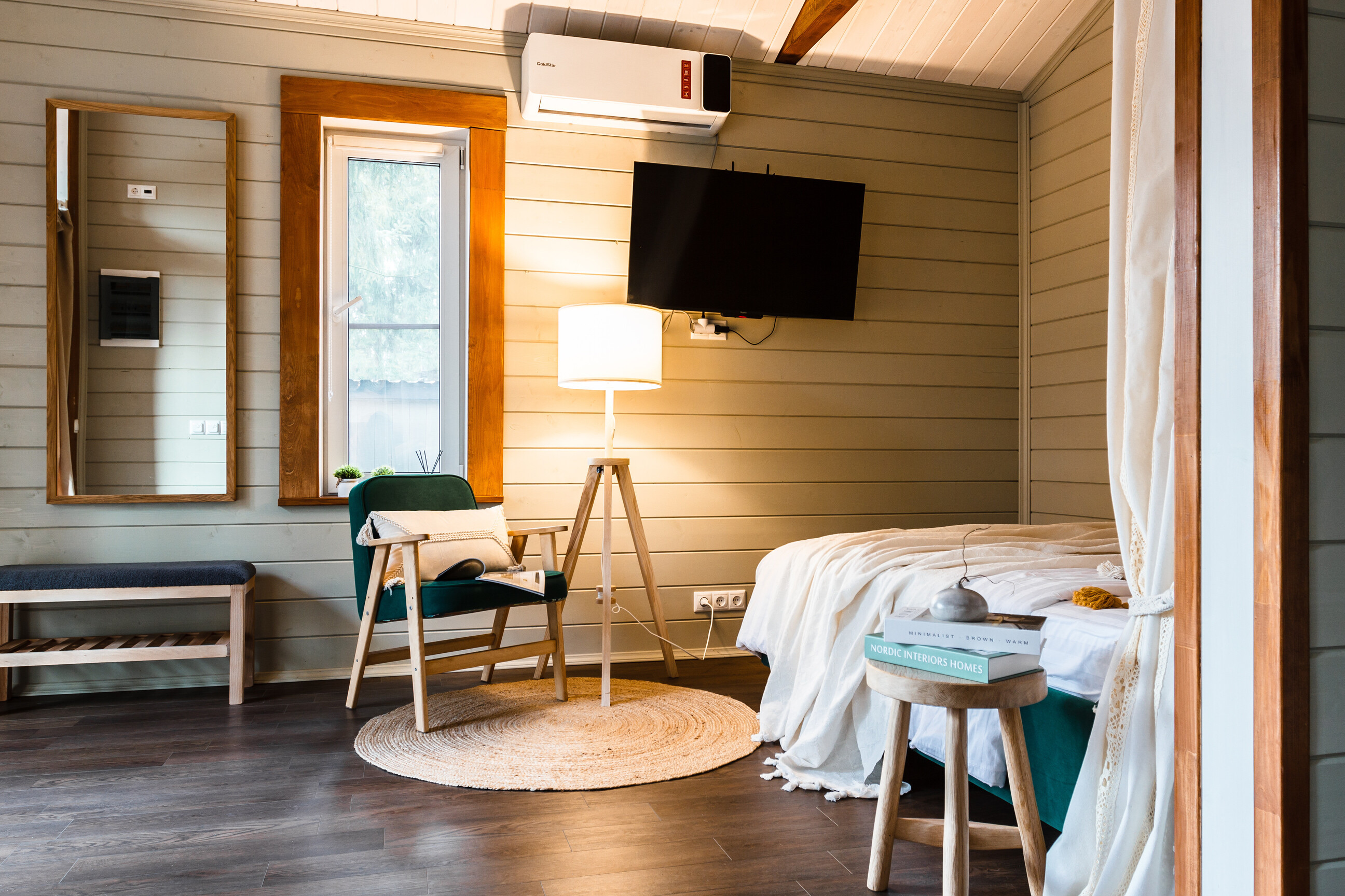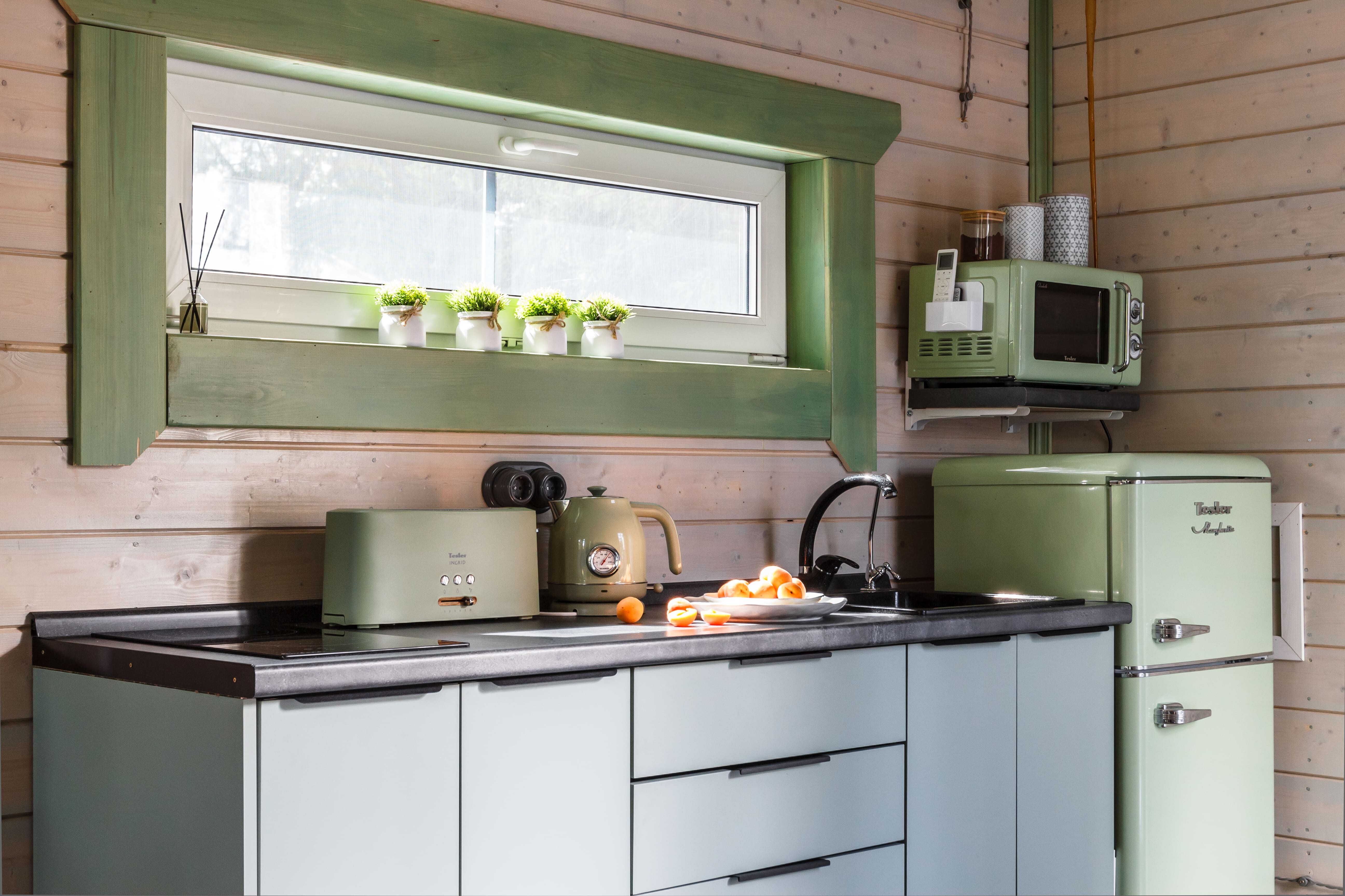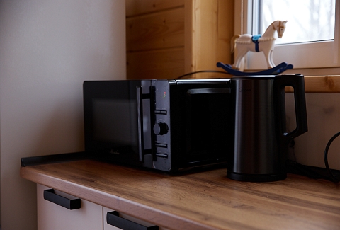 В номере: зеркало, кровать двуспальная, стол, стулья, шкаф, микроволновая печь, мини-холодильник, набор посуды, чайный набор посуды, электрочайник