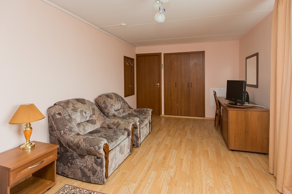 В номере: вешалка, диван, комод, кровать двуспальная, прикроватные тумбочки, стол, стулья, шкаф, кондиционер, набор посуды, телевизор, телефон, холодильник, электрочайник