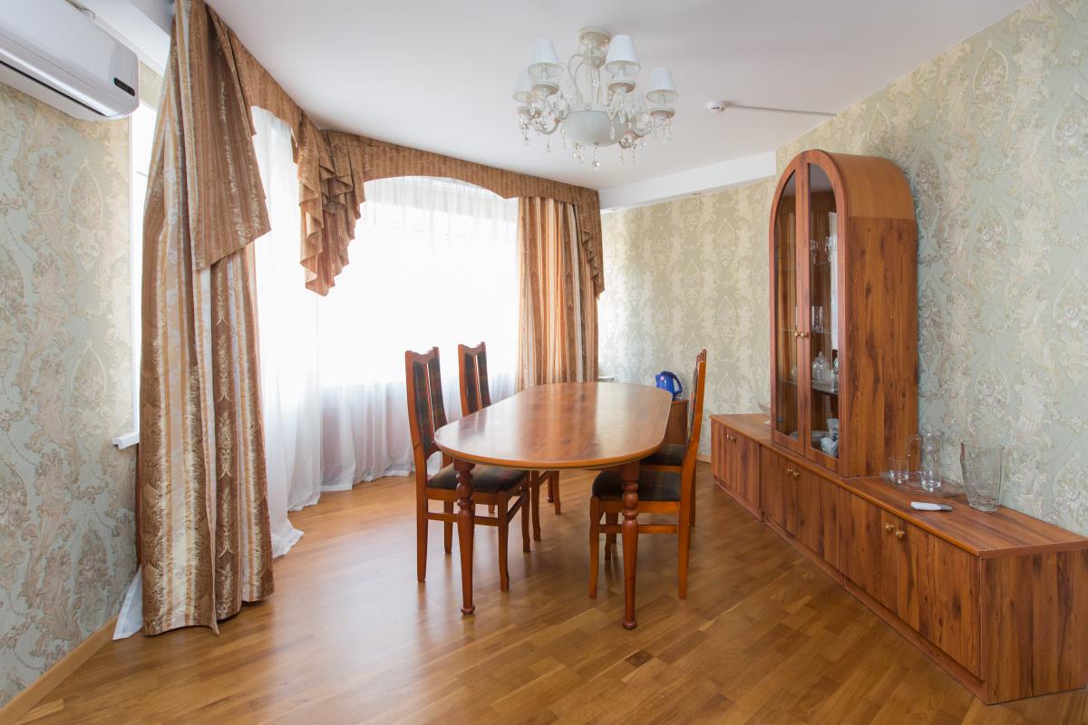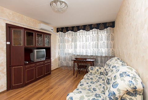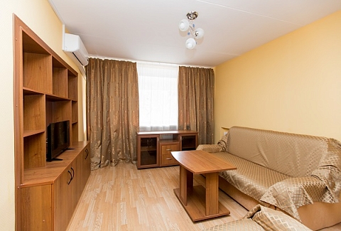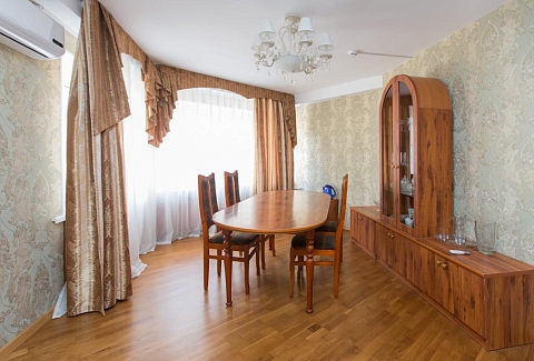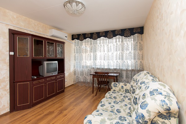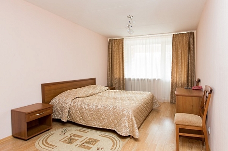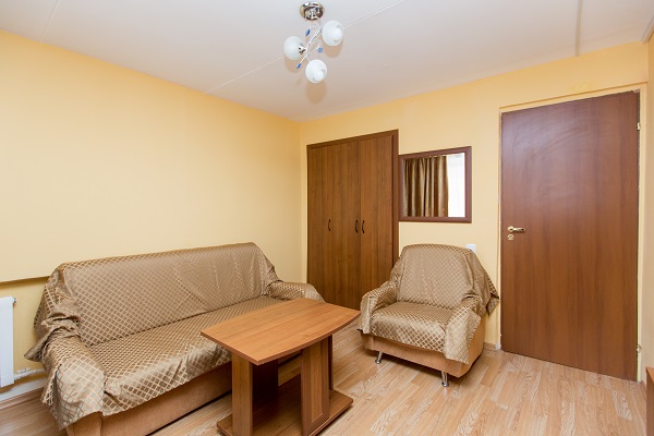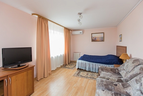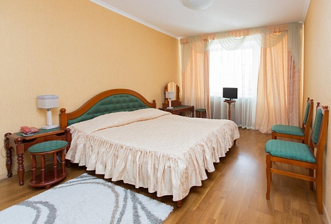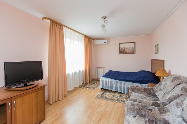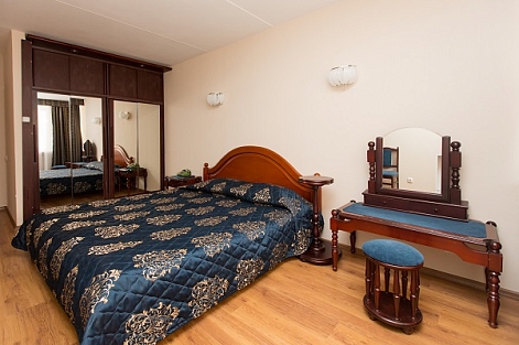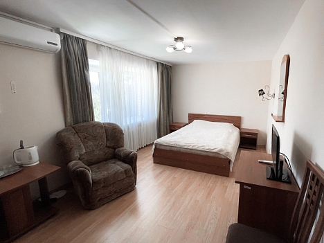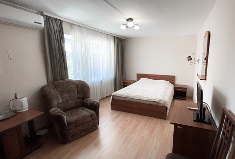В номере: вешалка, диван, зеркало, кровать двуспальная, прикроватные тумбочки, стол, стулья, шкаф, кондиционер, набор посуды, телевизор, телефон, холодильник, электрочайник