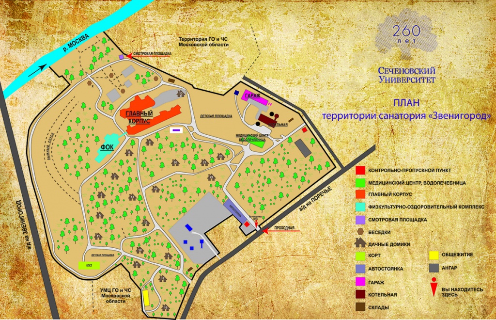 до ж/д вокзала Белорусский, на электричке до станции «Звенигород», от станции на бесплатном автобусе (с эмблемой Сеченовского университета) до санатория.