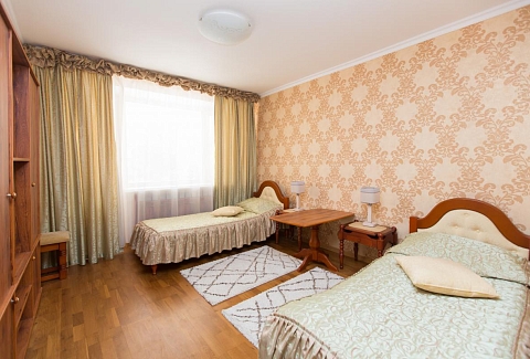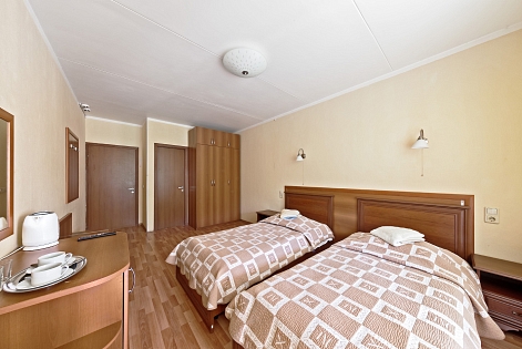 В номере: вешалка, кровати односпальные, прикроватные тумбочки, стол, стулья, шкаф, набор посуды, телевизор, холодильник
