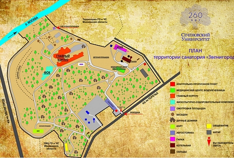 - по Новорижскому шоссе — до развязки по указателю на г. Звенигород, далее по главной дороге (около 13 км.) до Т-образного перекрёстка, на светофоре налево, после моста через р. Москва на первом светофоре налево, через 500 м. будет КПП и въезд на территорию санатория