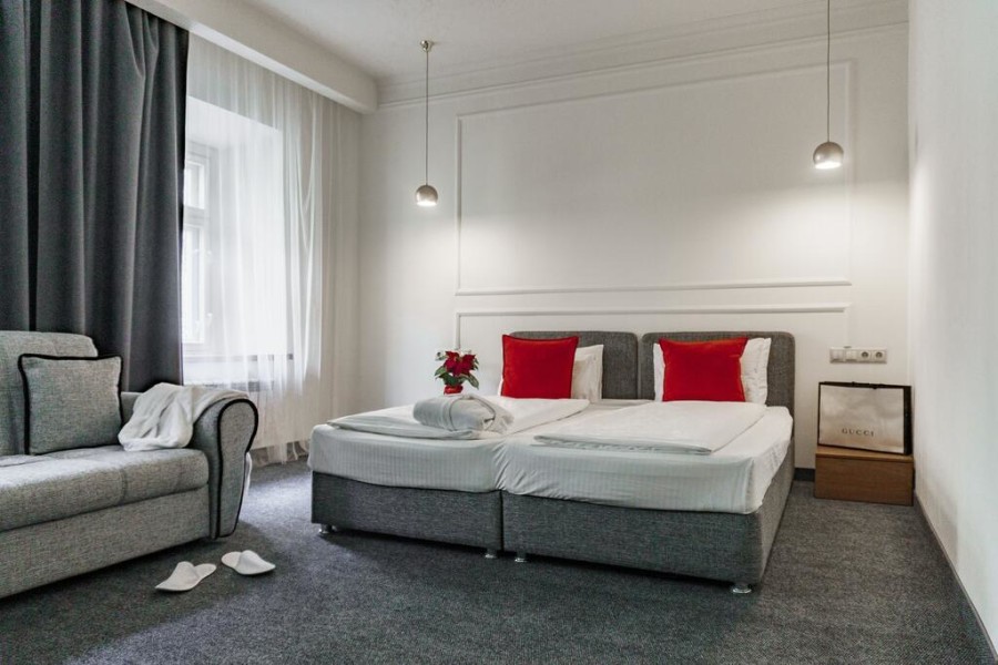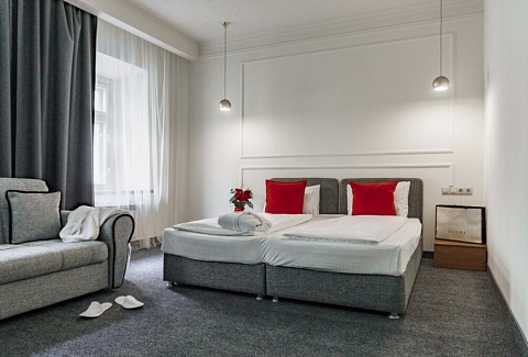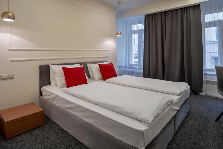Номерной фонд разного уровня комфорта и вместимости расположился в 3-этажном здании. Каждая комната оснащена всем необходимым для комфортного проживания: удобной мебелью, кондиционером, телевизором с плоским экраном, мини-холодильником, электрическим чайником и Wi-Fi доступом в интернет. В номерах есть санузел с душем, полотенца и туалетные принадлежности, а также фен для сушки волос. На территории гостиницы располагается комфортабельное кафе, где гости могут насладиться вкусным и разнообразным завтраком. Также можно заказать еду и напитки в номер, что очень удобно для тех, кто не хочет покидать комнату. Для гостей, которые приехали на личном транспорте, предусмотрена парковка, а стойка регистрации работает круглосуточно.