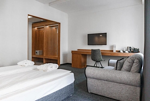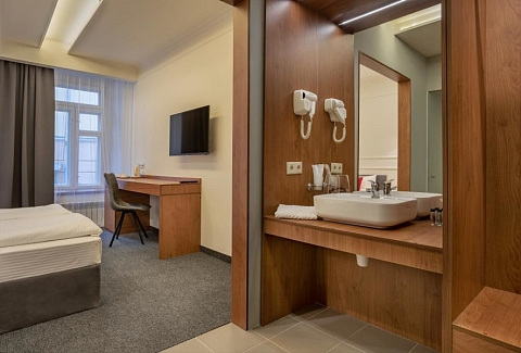 В номере: вешалка, зеркало, кровати односпальные /одна двуспальная кровать, прикроватные тумбочки, стол, стулья, шкаф, гладильная доска, мини-холодильник, сейф, телевизор, телефон, утюг, чайный набор посуды, электрочайник