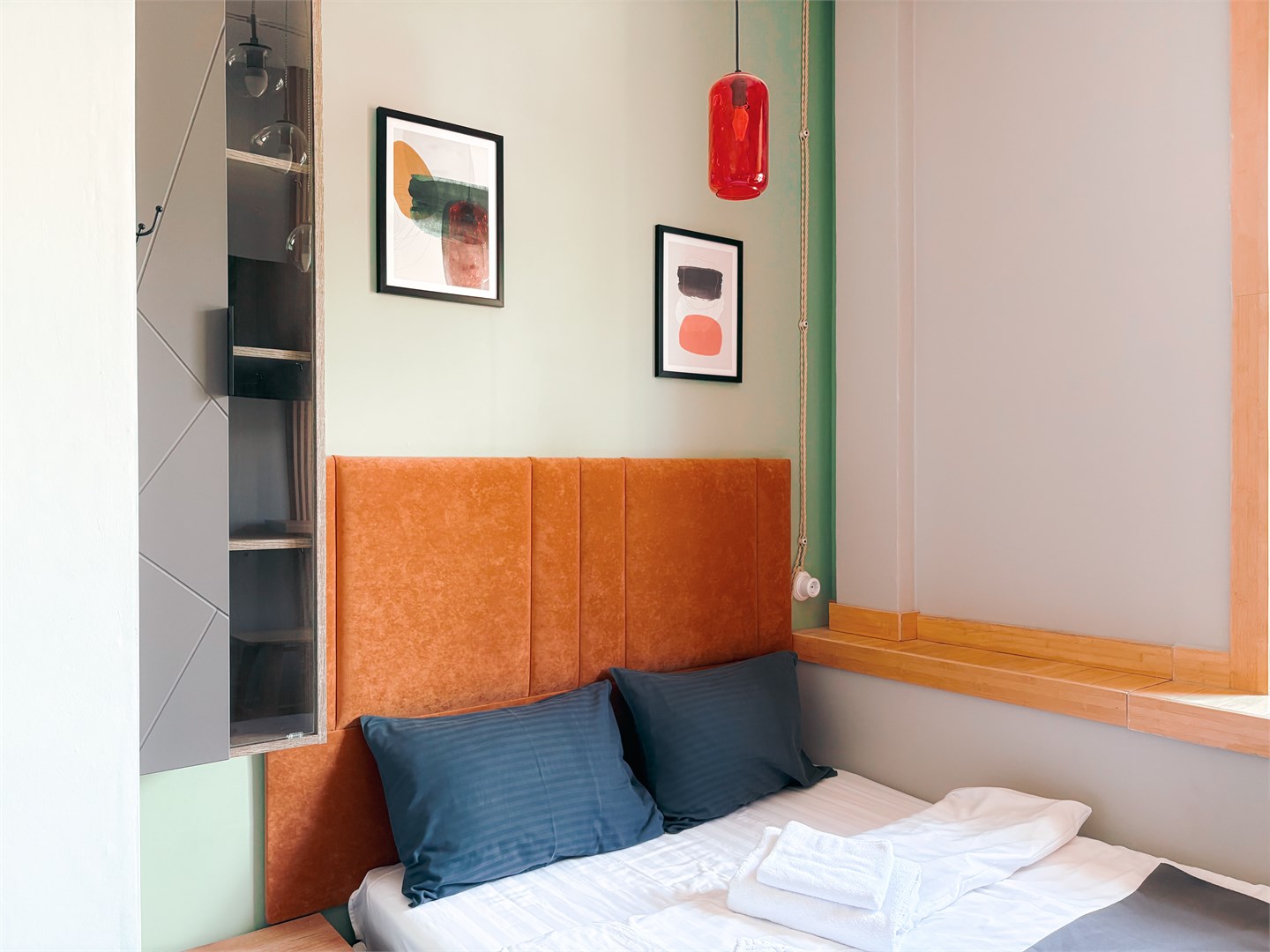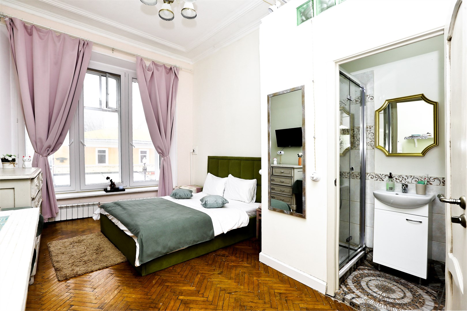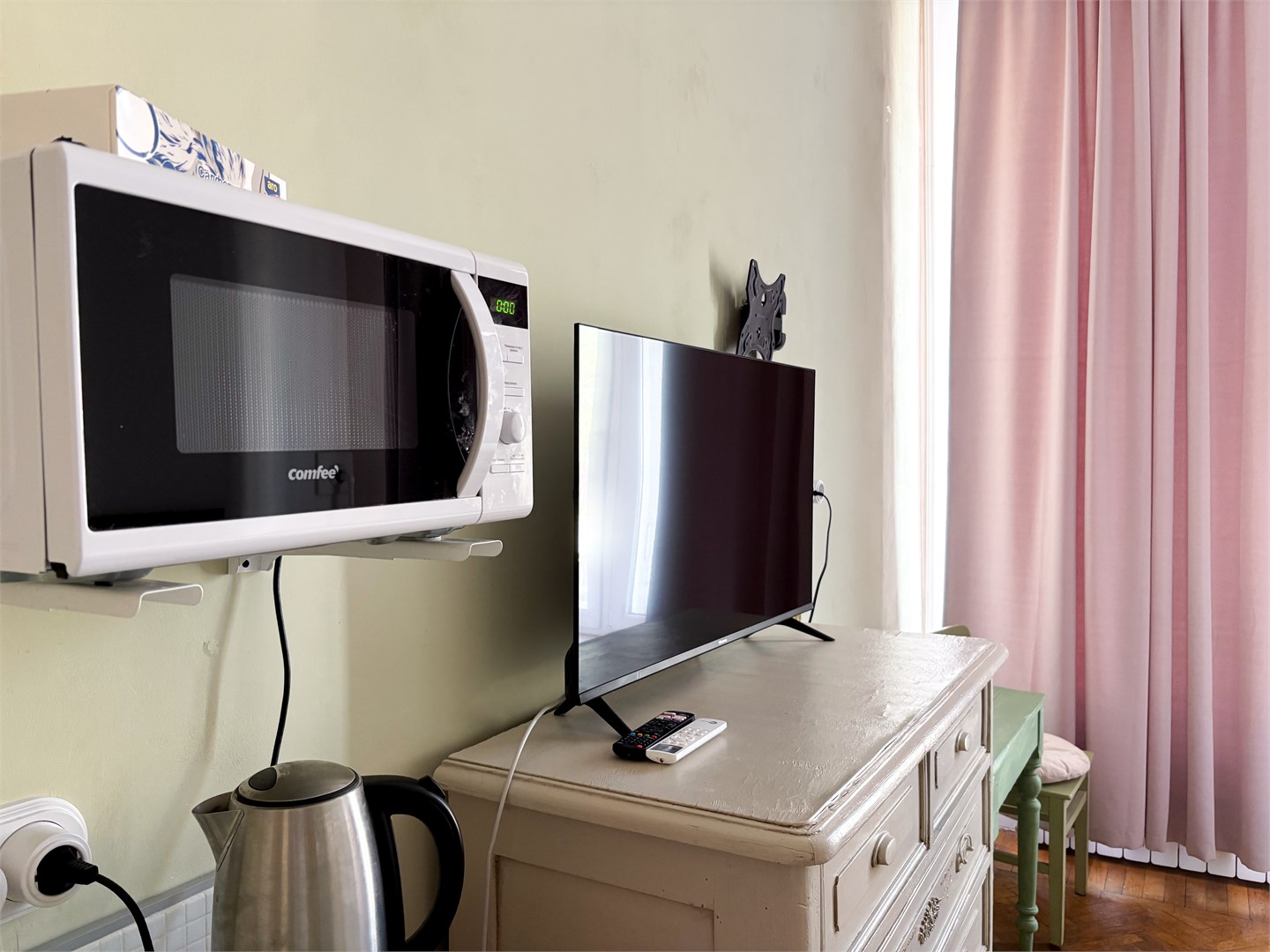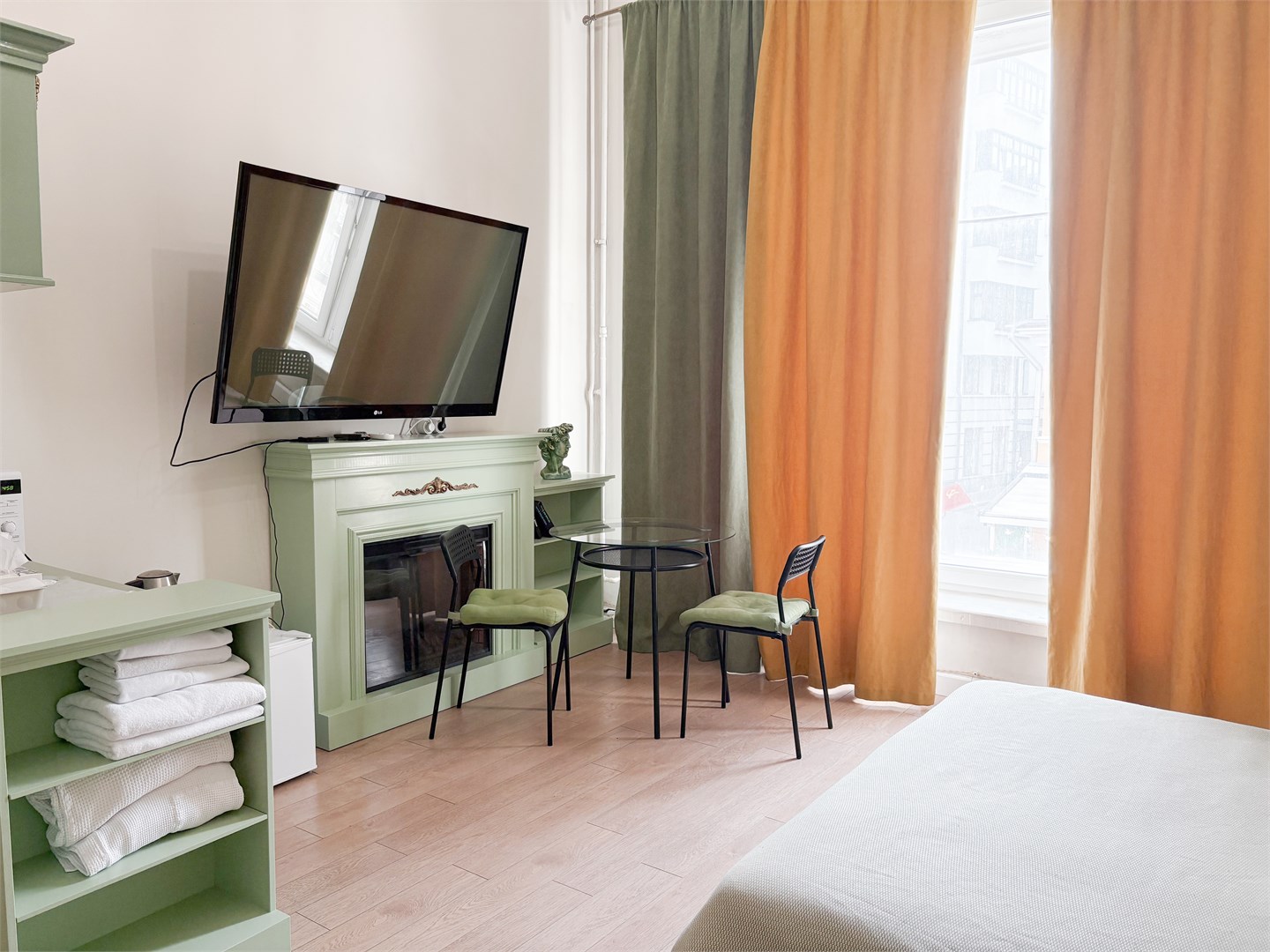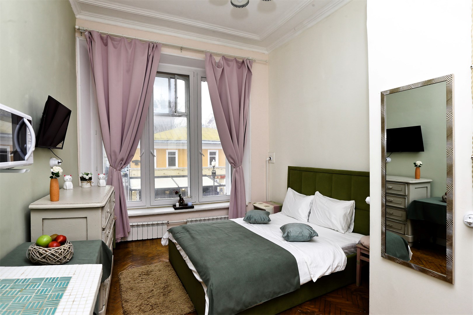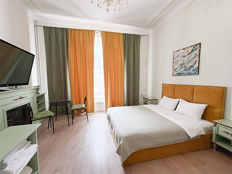 В номере: вешалка, диван раскладной, зеркало, кровать двуспальная, прикроватные тумбочки, стол, стулья, шкаф, микроволновая печь, мини-холодильник, телевизор, чайный набор посуды, электрочайник