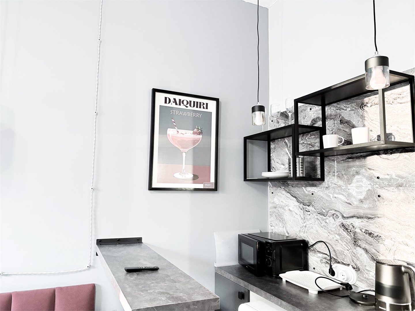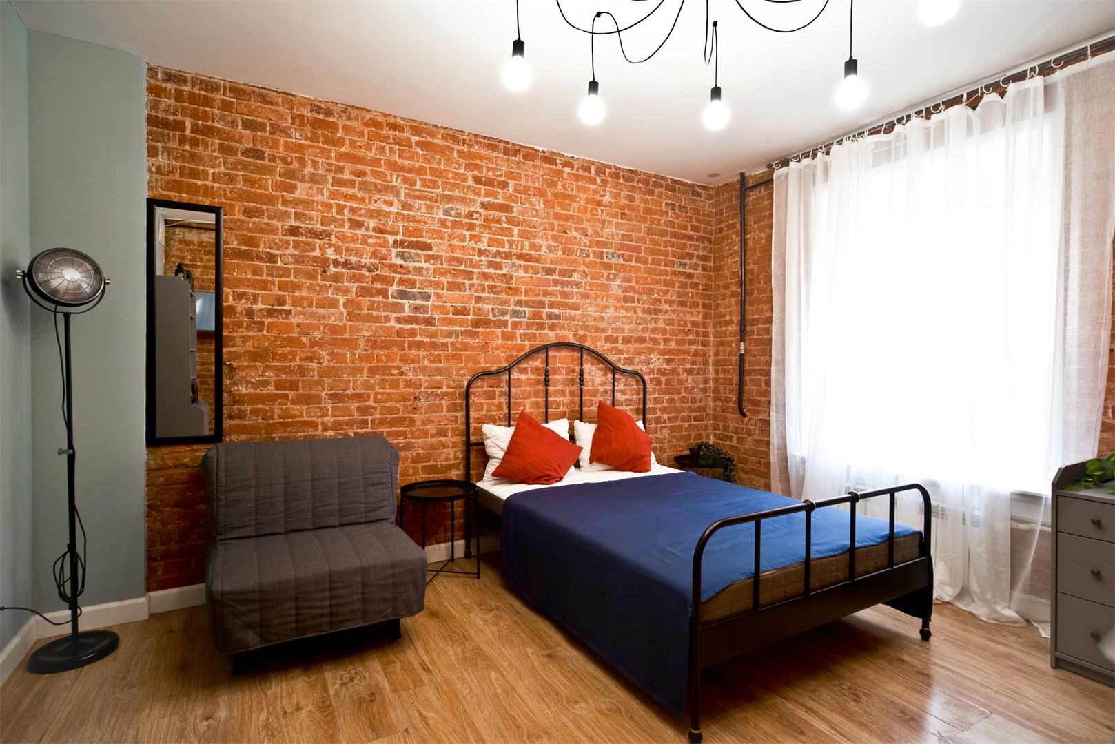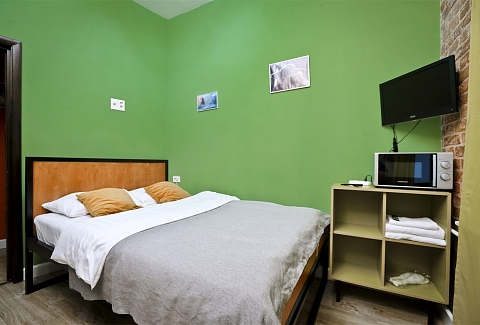 В номере: вешалка, зеркало, кресло-кровать, кровать двуспальная, прикроватные тумбочки, стол, стулья, шкаф, микроволновая печь, мини-холодильник, набор посуды, плита электрическая, стиральная машина, телевизор, электрочайник