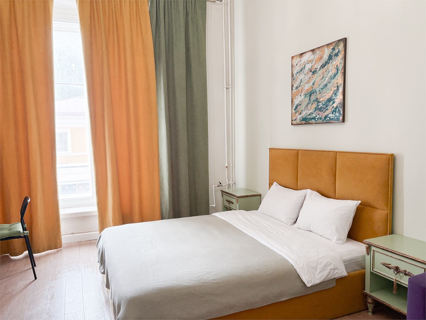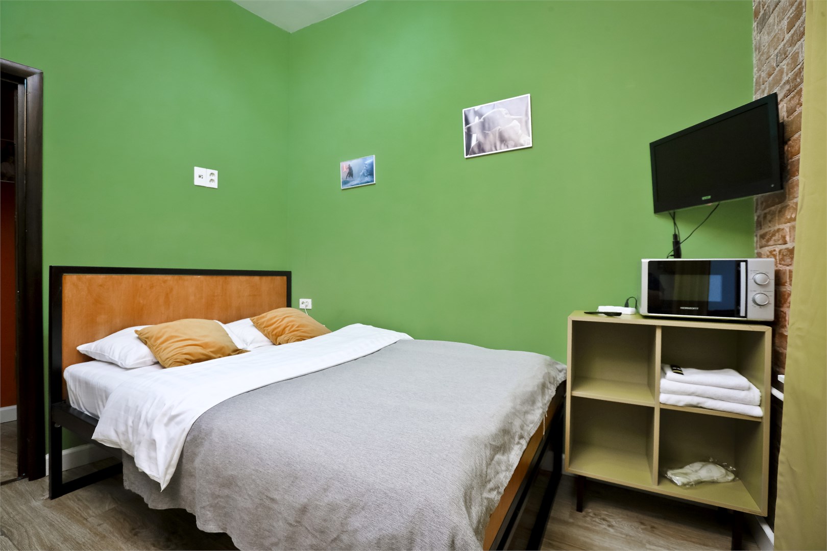 В номере: вешалка, зеркало, кровать двуспальная, прикроватные тумбочки, стол, стулья, шкаф, микроволновая печь, мини-холодильник, телевизор
