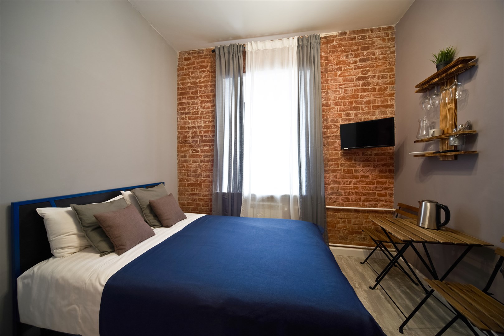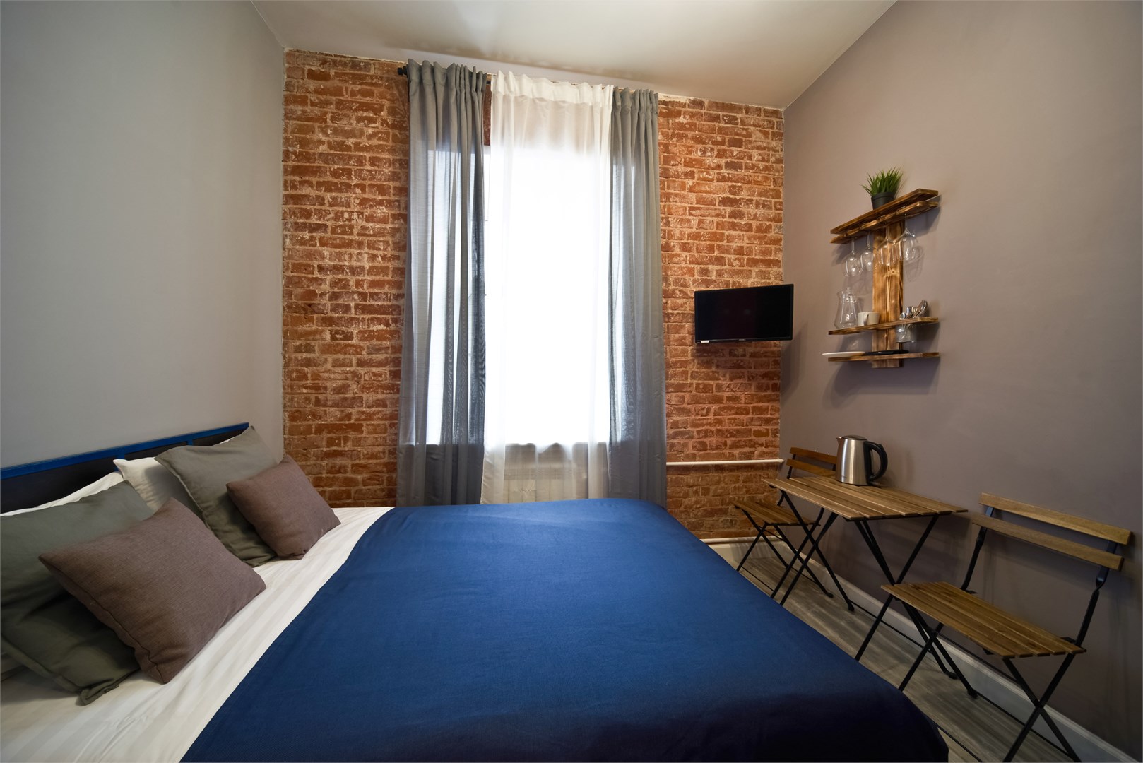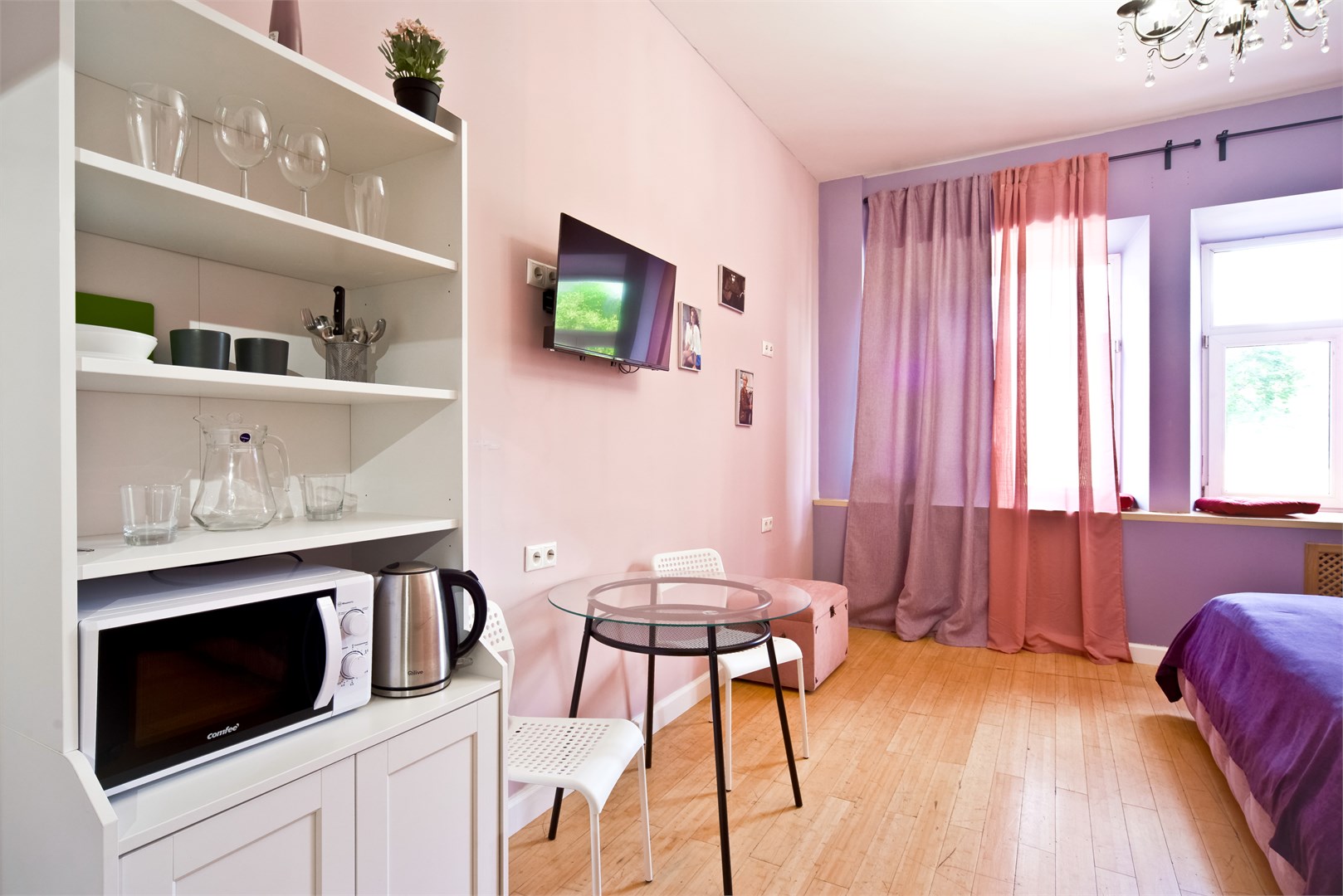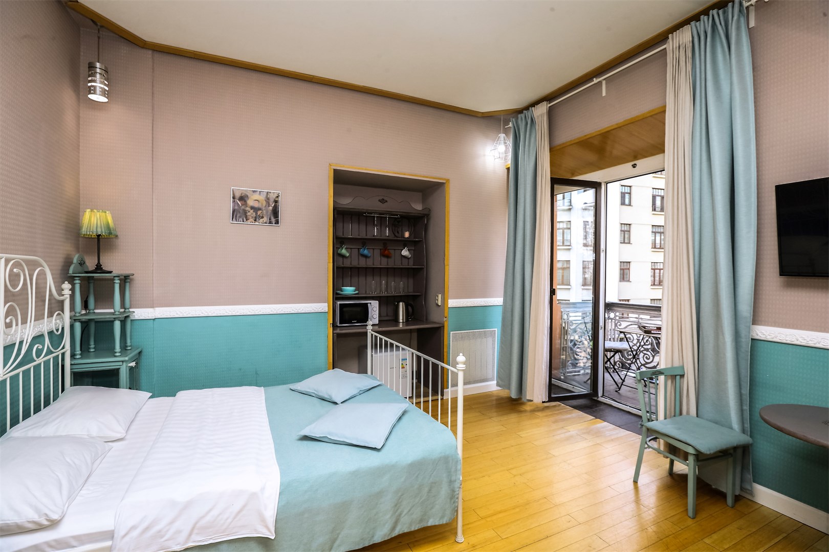 В номере: вешалка, зеркало, кровать двуспальная, прикроватные тумбочки, стол, стулья, шкаф, микроволновая печь, мини-холодильник, телевизор, чайный набор посуды, электрочайник