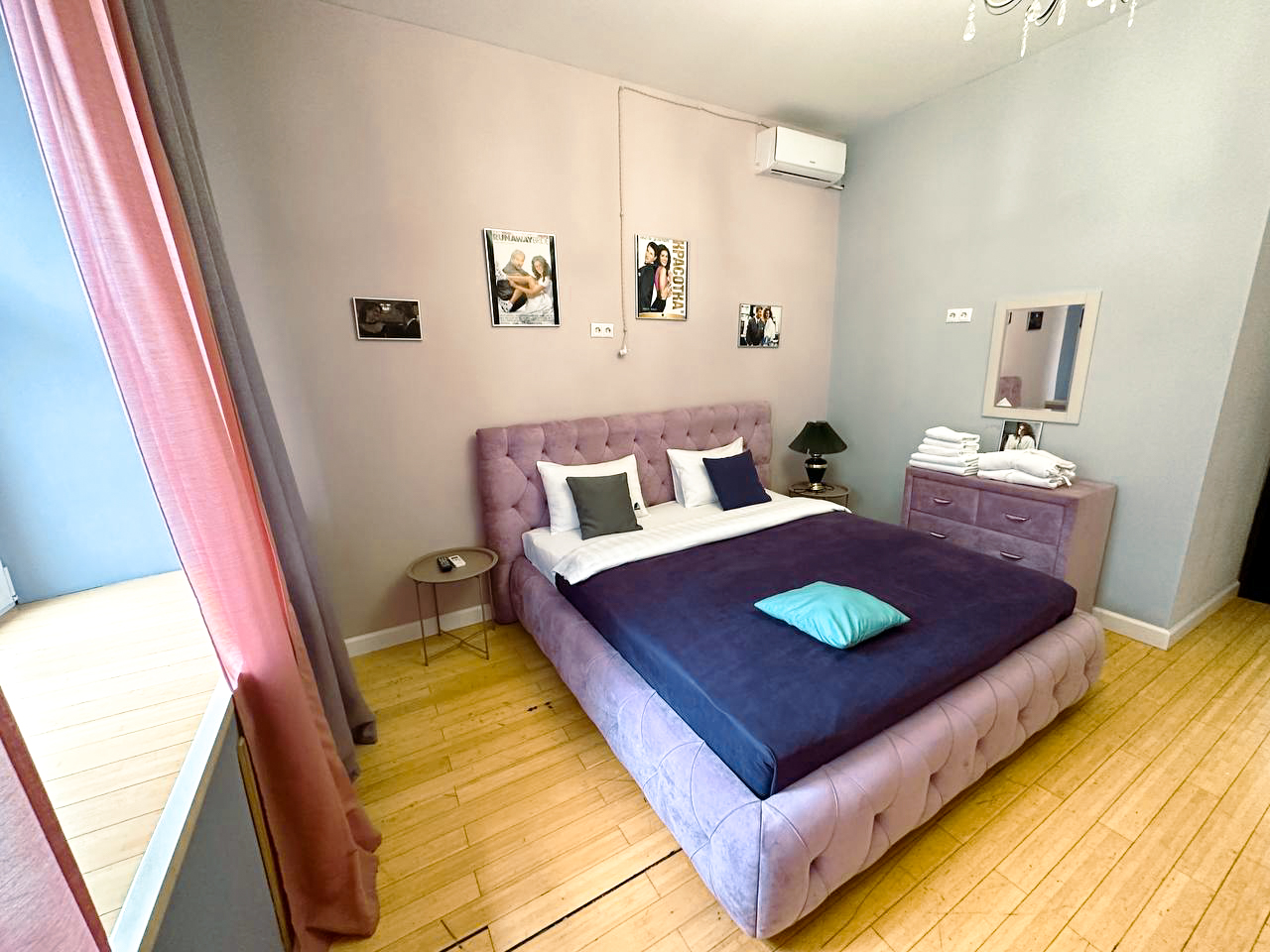 В номере: вешалка, зеркало, кровать двуспальная, прикроватные тумбочки, стол, стулья, шкаф, кондиционер, микроволновая печь, мини-холодильник, набор посуды, стиральная машина, телевизор, чайный набор посуды, электрочайник