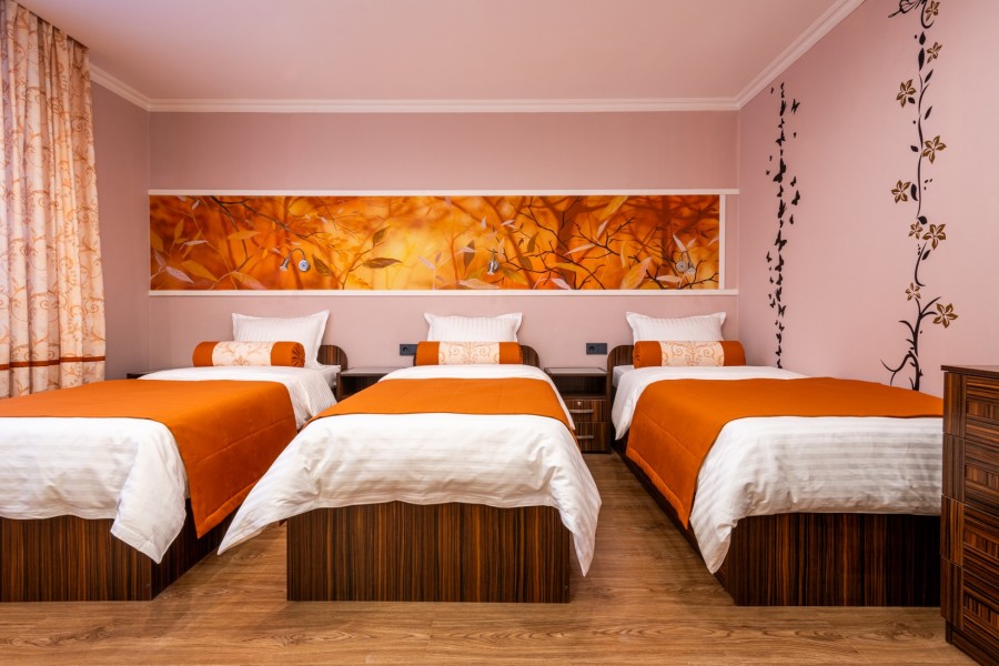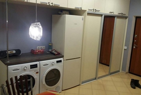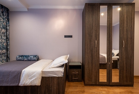 В номере: кровати односпальные, кровать двуспальная, прикроватные тумбочки, стол, стулья, шкаф, гладильная доска, кондиционер, набор посуды, плита электрическая, стиральная машина, телевизор, утюг, холодильник, чайник