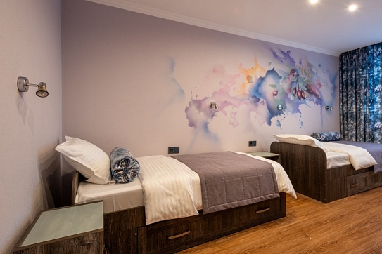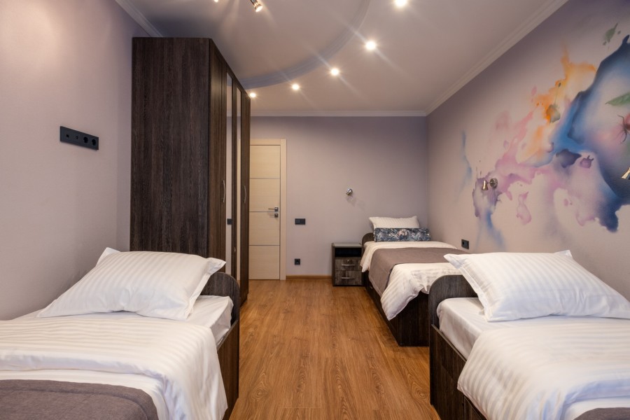 Просторные четырехкомнатные апартаменты общей площадью 83 квадратных метров расположены вдали от шума городских улиц, открывая прекрасный вид на тихий внутренний двор. Идеально подходят для семейного отдыха или путешествий большой компанией до десяти человек. Четыре уютные спальни с комфортным интерьером дополнены просторной гостиной, создающей атмосферу домашнего тепла и уюта.Номер оборудован восемью односпальными кроватями и одной двуспальной, обеспечивая комфорт каждому гостю.