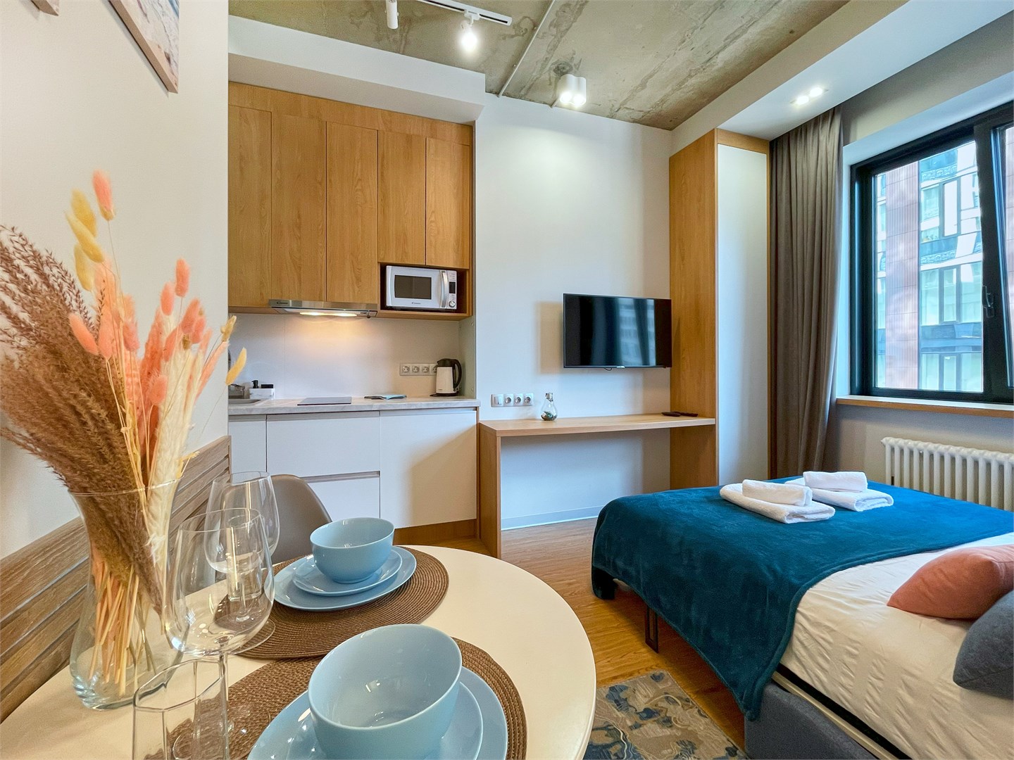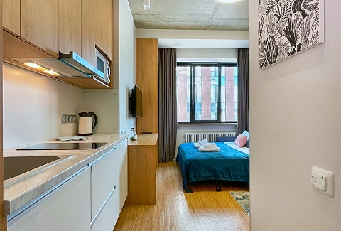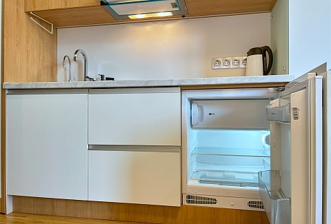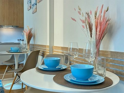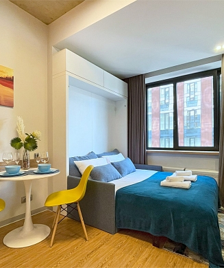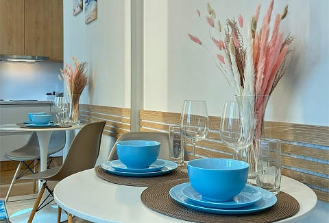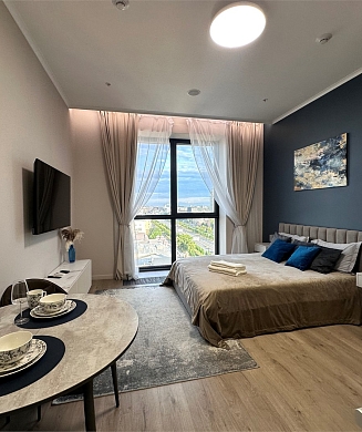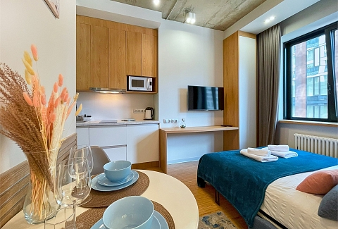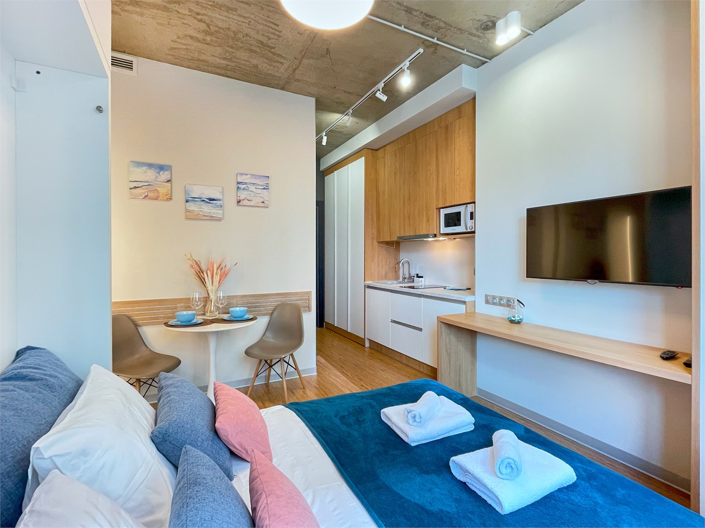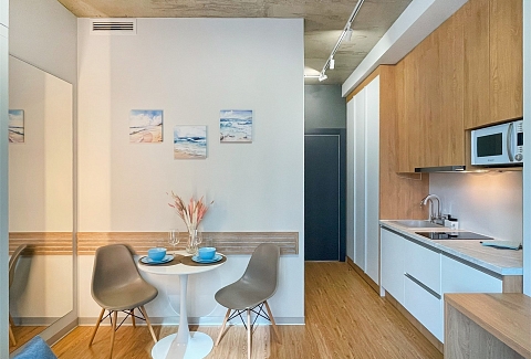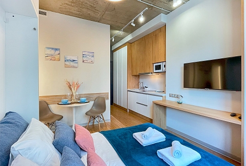В номере: вешалка, диван раскладной, зеркало, стол, стулья, шкаф, гладильная доска, кондиционер, микроволновая печь, мини-холодильник, набор посуды, плита электрическая, стиральная машина, сушилка для белья, телевизор, утюг, электрочайник