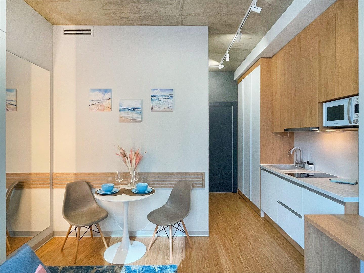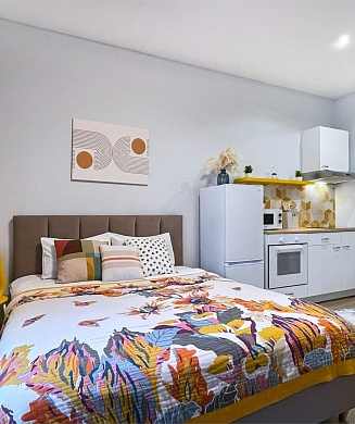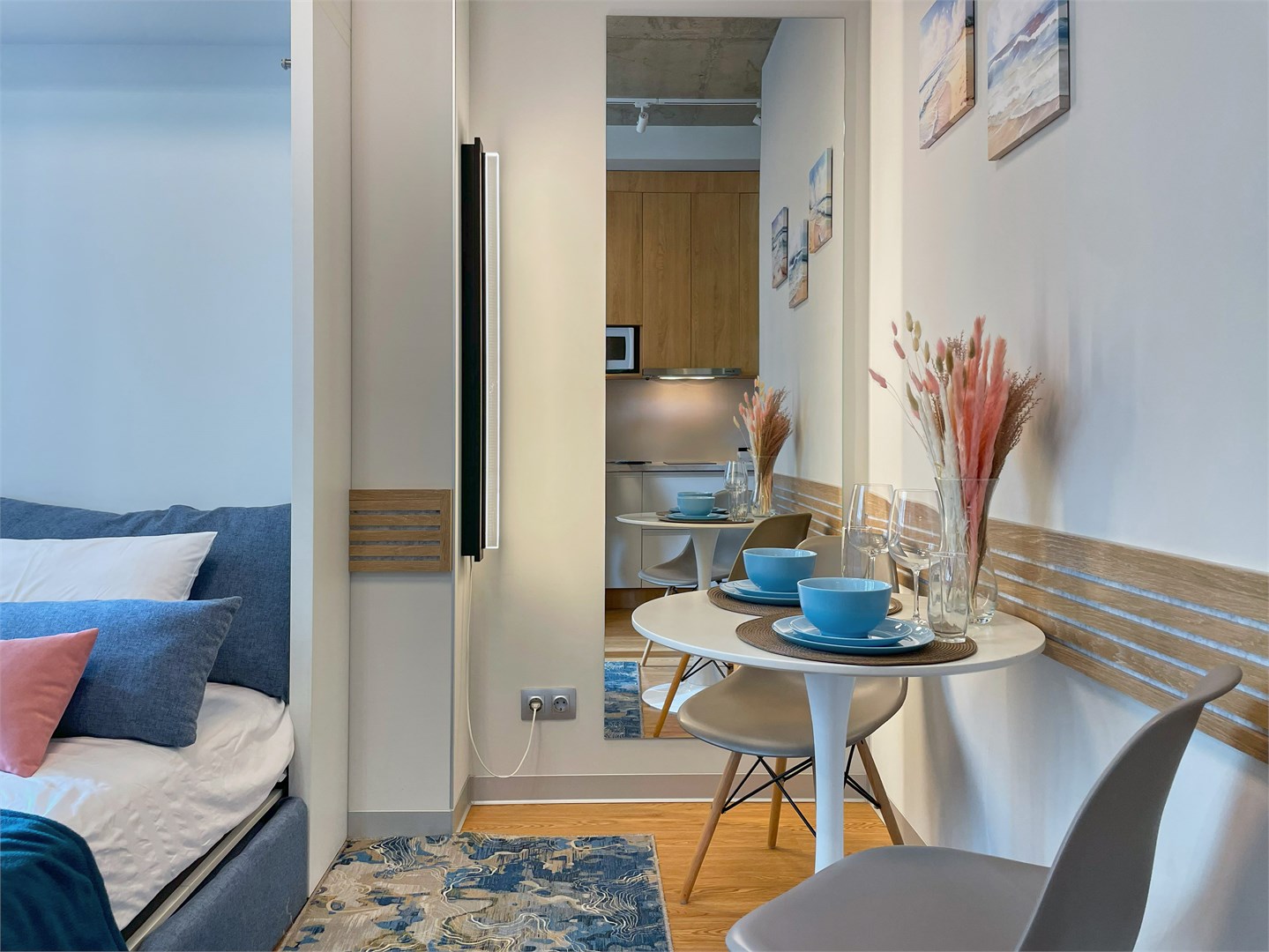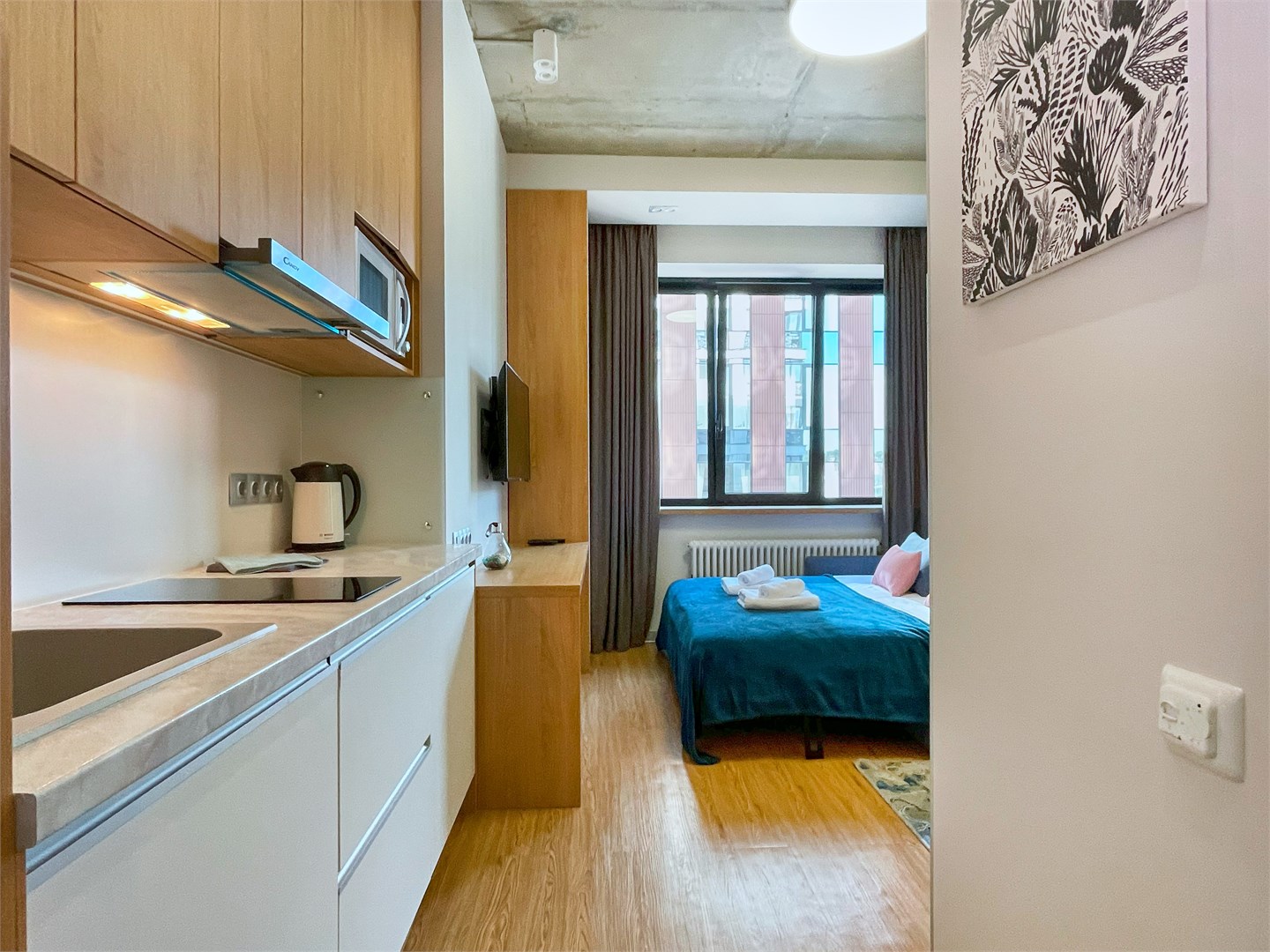 В номере: вешалка, диван раскладной, зеркало, стол, стулья, шкаф, гладильная доска, кондиционер, микроволновая печь, мини-холодильник, набор посуды, плита электрическая, стиральная машина, сушилка для белья, телевизор, утюг, электрочайник