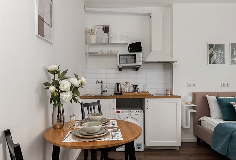 В номере: вешалка, диван раскладной, зеркало, стол, стулья, шкаф, гладильная доска, духовой шкаф, кондиционер, микроволновая печь, набор посуды, плита электрическая, стиральная машина, сушилка для белья, телевизор, утюг, холодильник, электрочайник