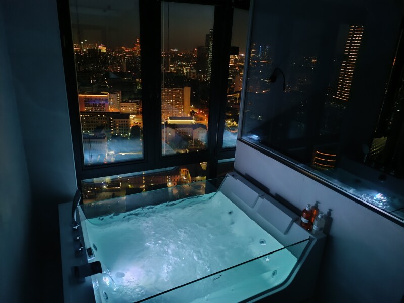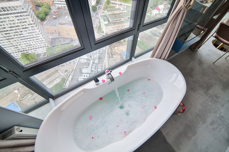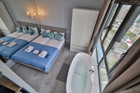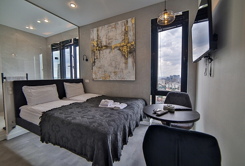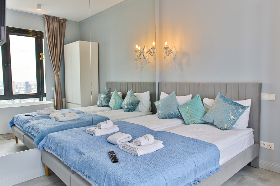 В номере: вешалка, зеркало, кровать двуспальная, стол, стулья, шкаф, гладильная доска, кондиционер, кофемашина, микроволновая печь, набор посуды, плита индукционная, стиральная машина, сушилка для белья, телевизор ЖК, утюг, холодильник, чайный набор посуды, электрочайник