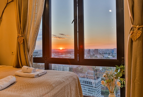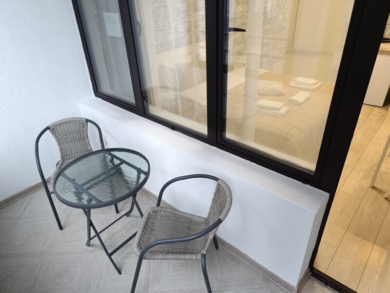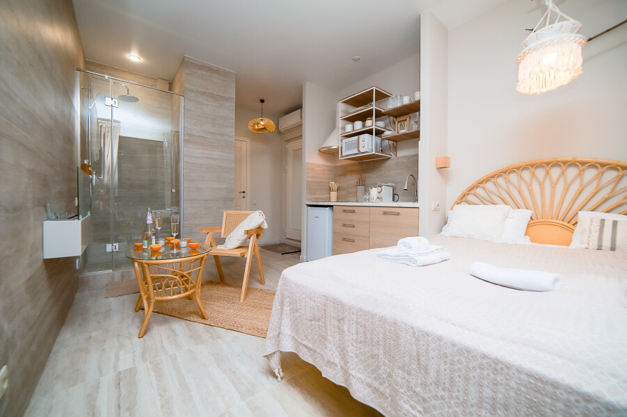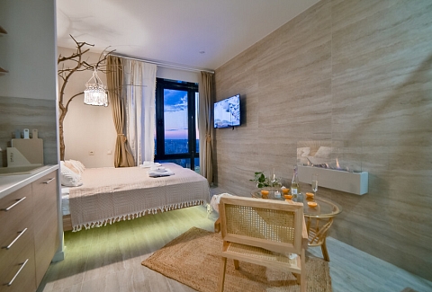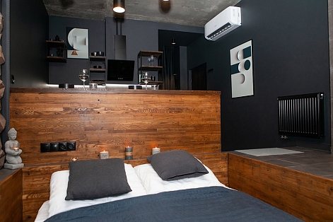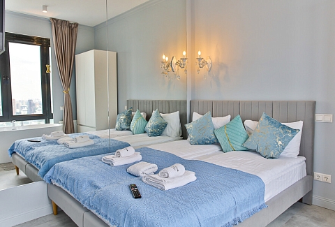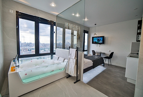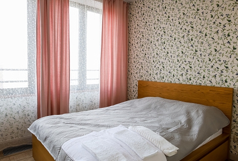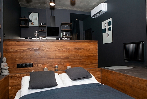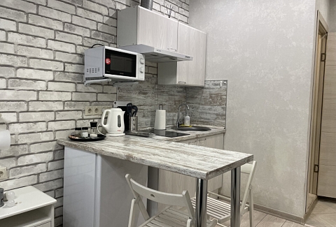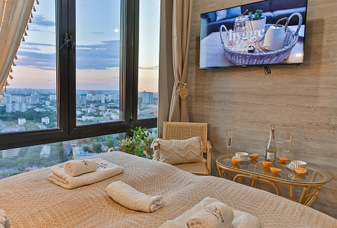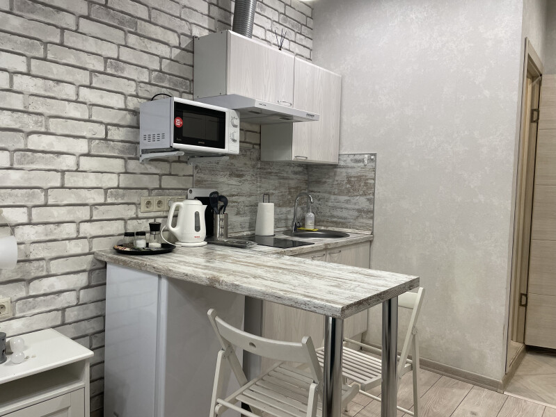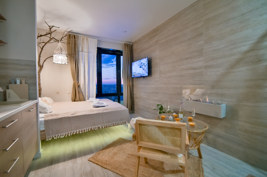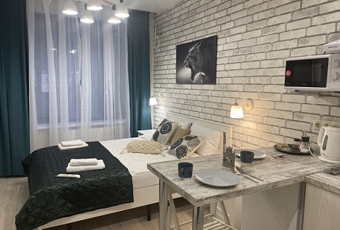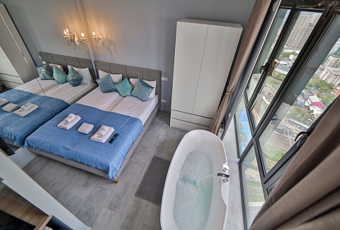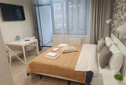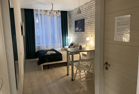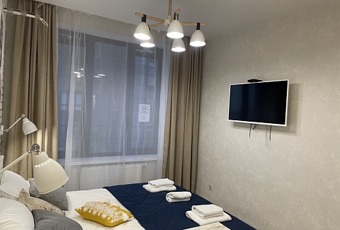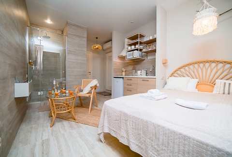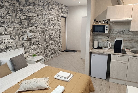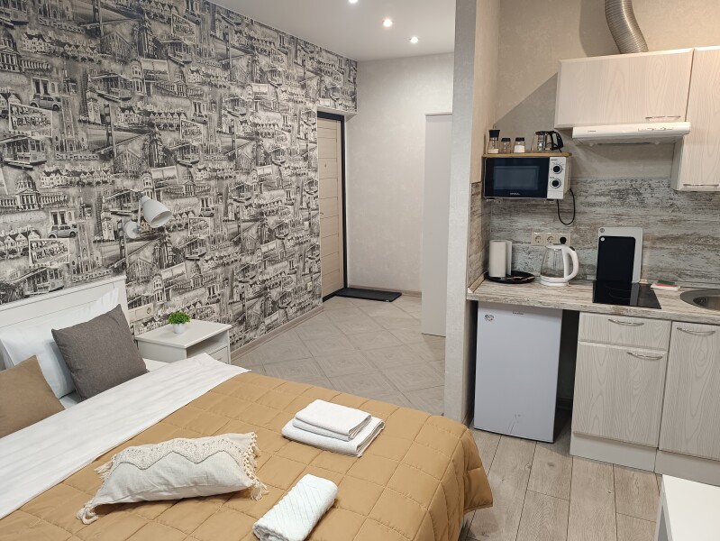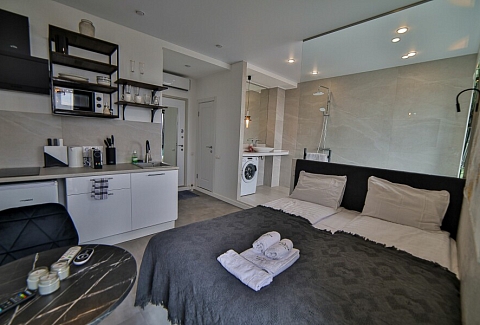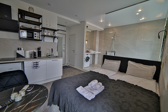 В номере: вешалка, зеркало, кровать двуспальная, стол, стул, шкаф встроенный, климатическая система, кофемашина, микроволновая печь, набор посуды, плита индукционная, стиральная машина, сушилка для белья, телевизор ЖК, утюг, холодильник, чайный набор посуды, электрочайник