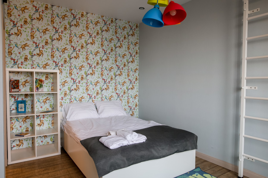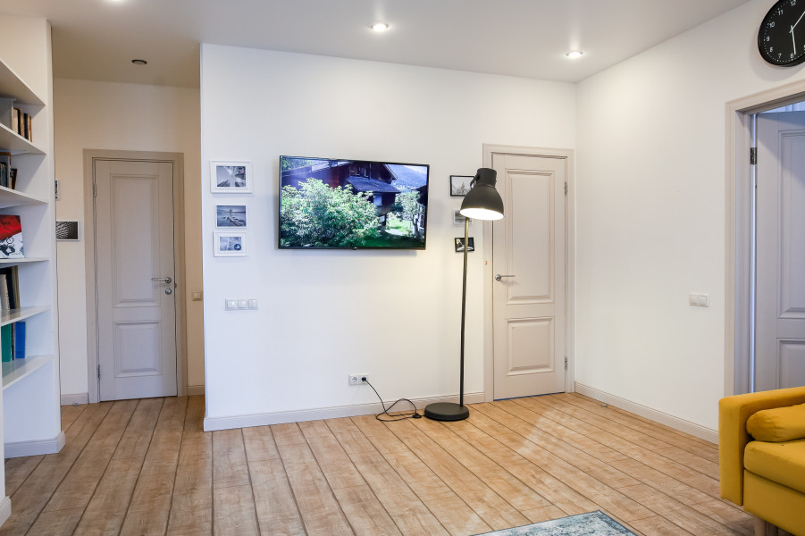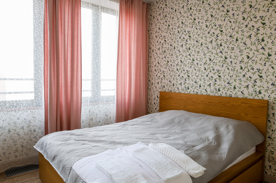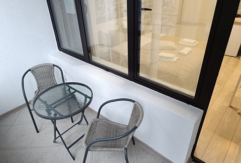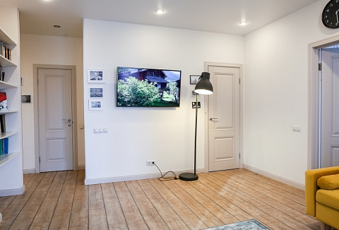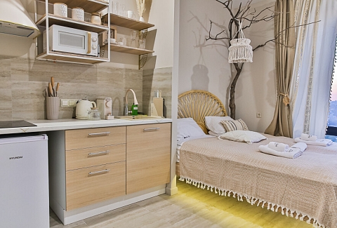 В номере: вешалка, зеркало, кровать двуспальная, стол, стулья, климатическая система, кофемашина, микроволновая печь, набор посуды, плита электрическая, стиральная машина, сушилка для белья, телевизор ЖК, утюг, холодильник, чайный набор посуды, электрочайник