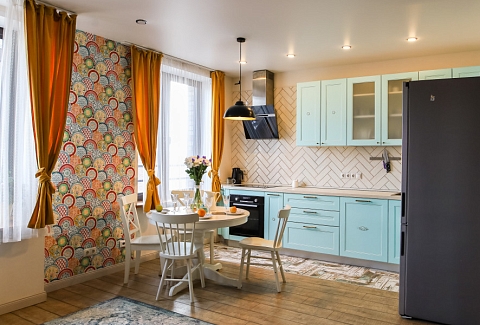В номере: диван раскладной, кровать двуспальная, кухонная мебель, прикроватные тумбочки, стол обеденный, стулья, шкаф, гладильная доска, духовой шкаф, микроволновая печь, набор посуды, плита индукционная, стиральная машина, сушилка для белья, телевизор ЖК, утюг, холодильник, чайный набор посуды, электрочайник