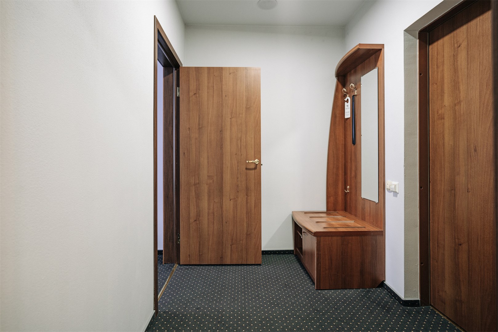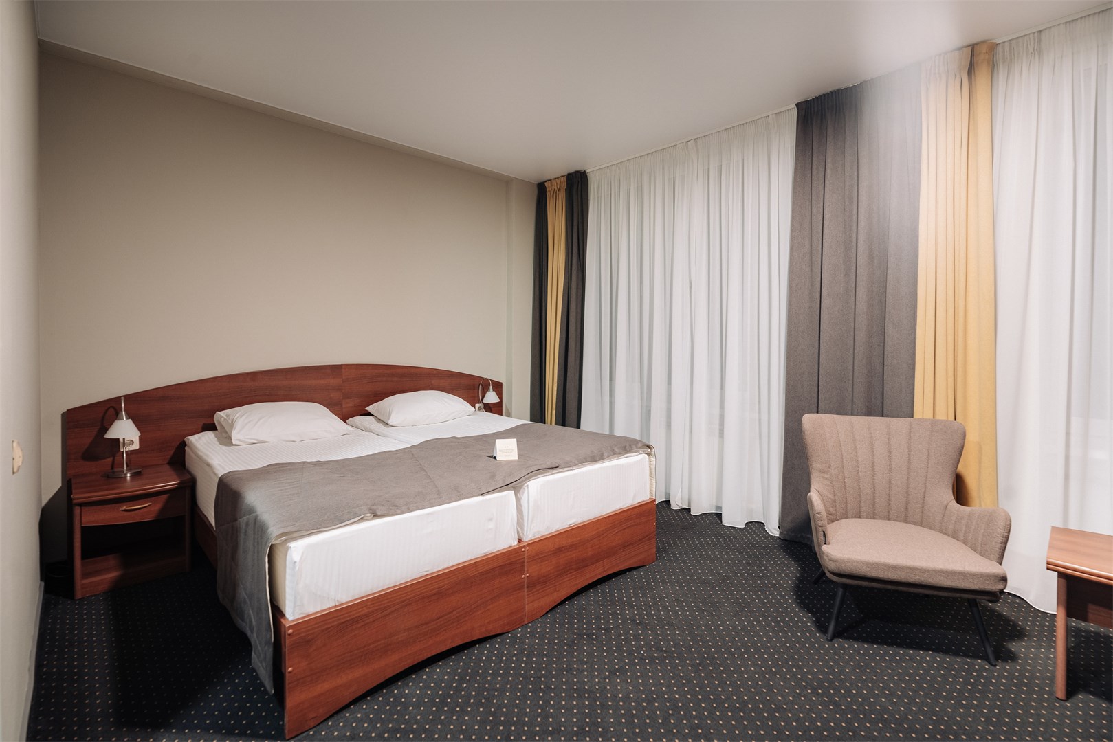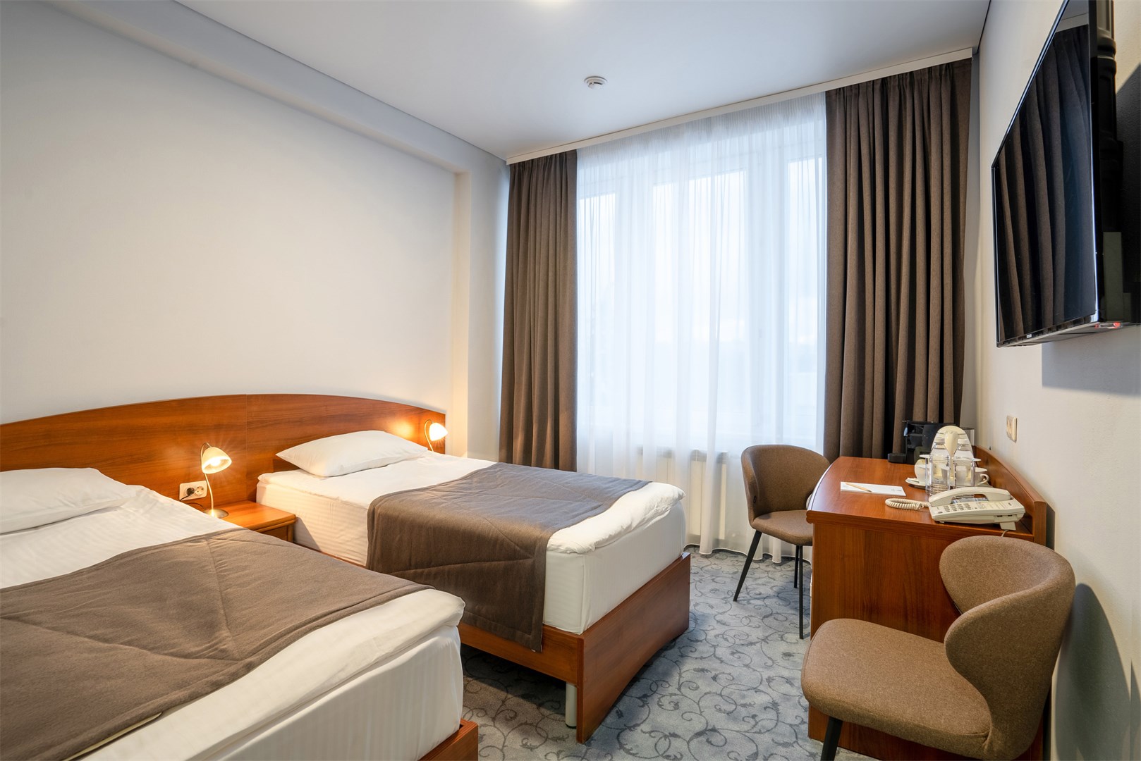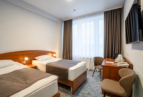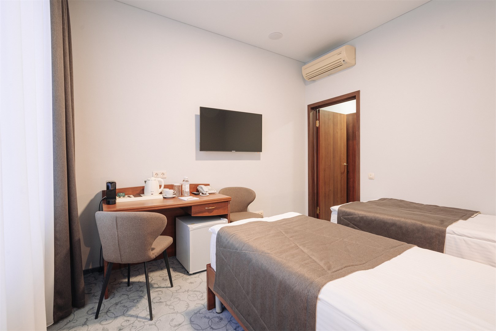 В номере: вешалка, зеркало, кровати односпальные, прикроватные тумбочки, стол, стулья, шкаф, кондиционер, телевизор, телефон, холодильник