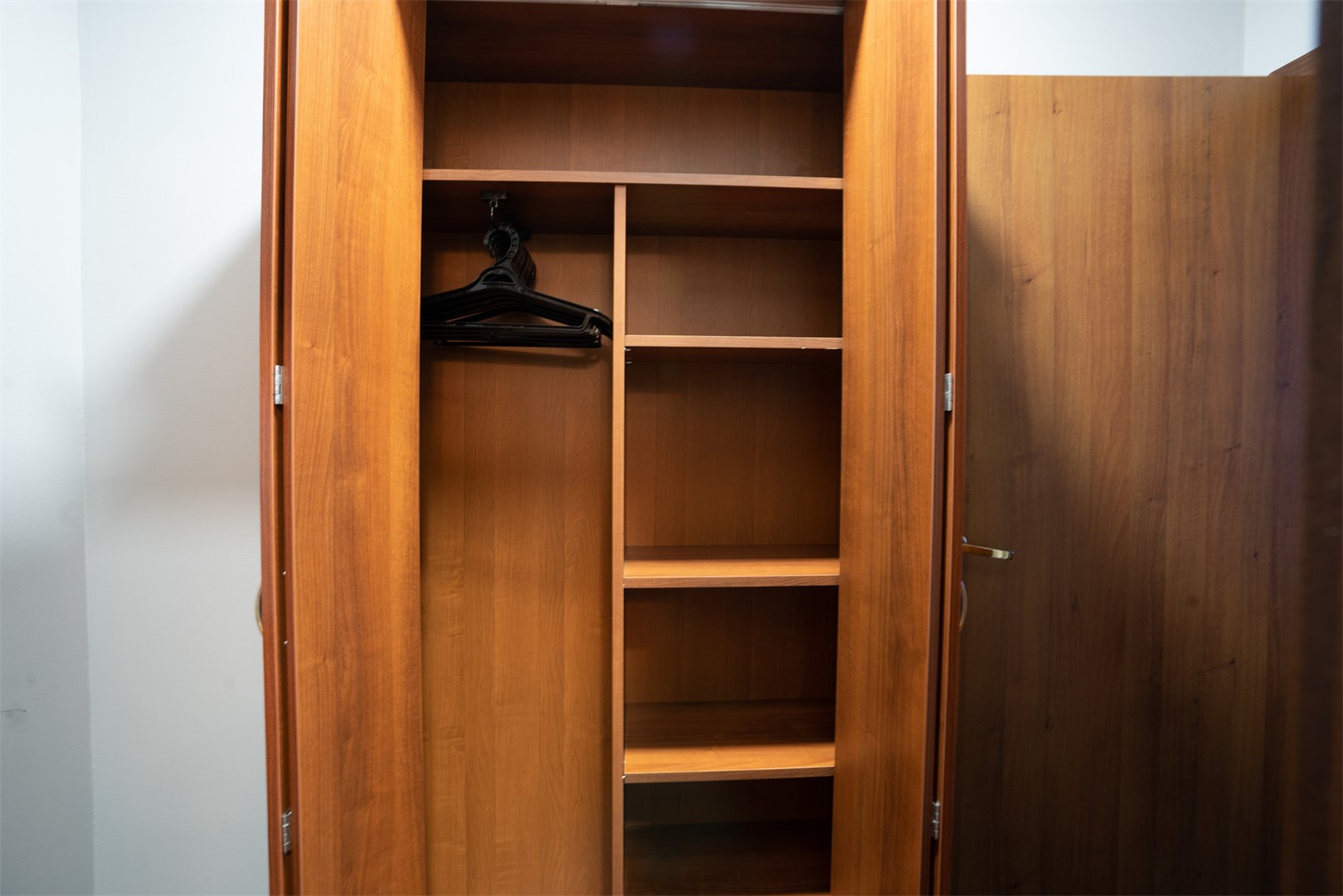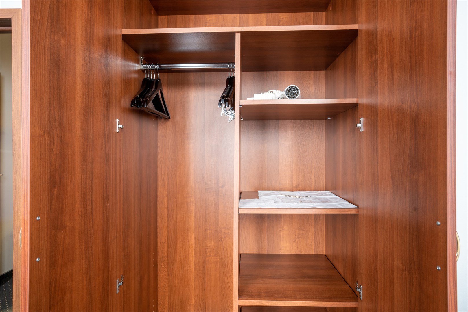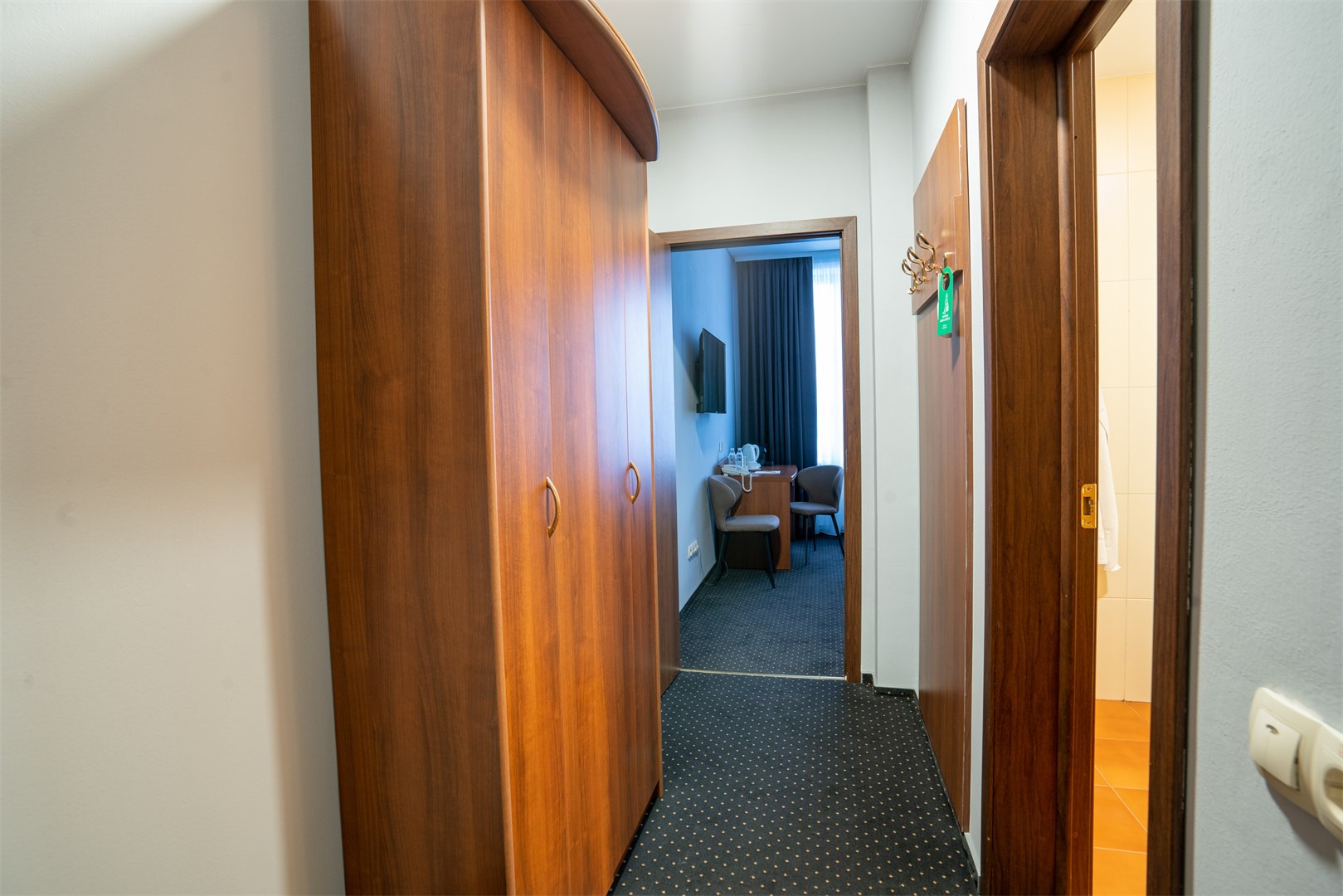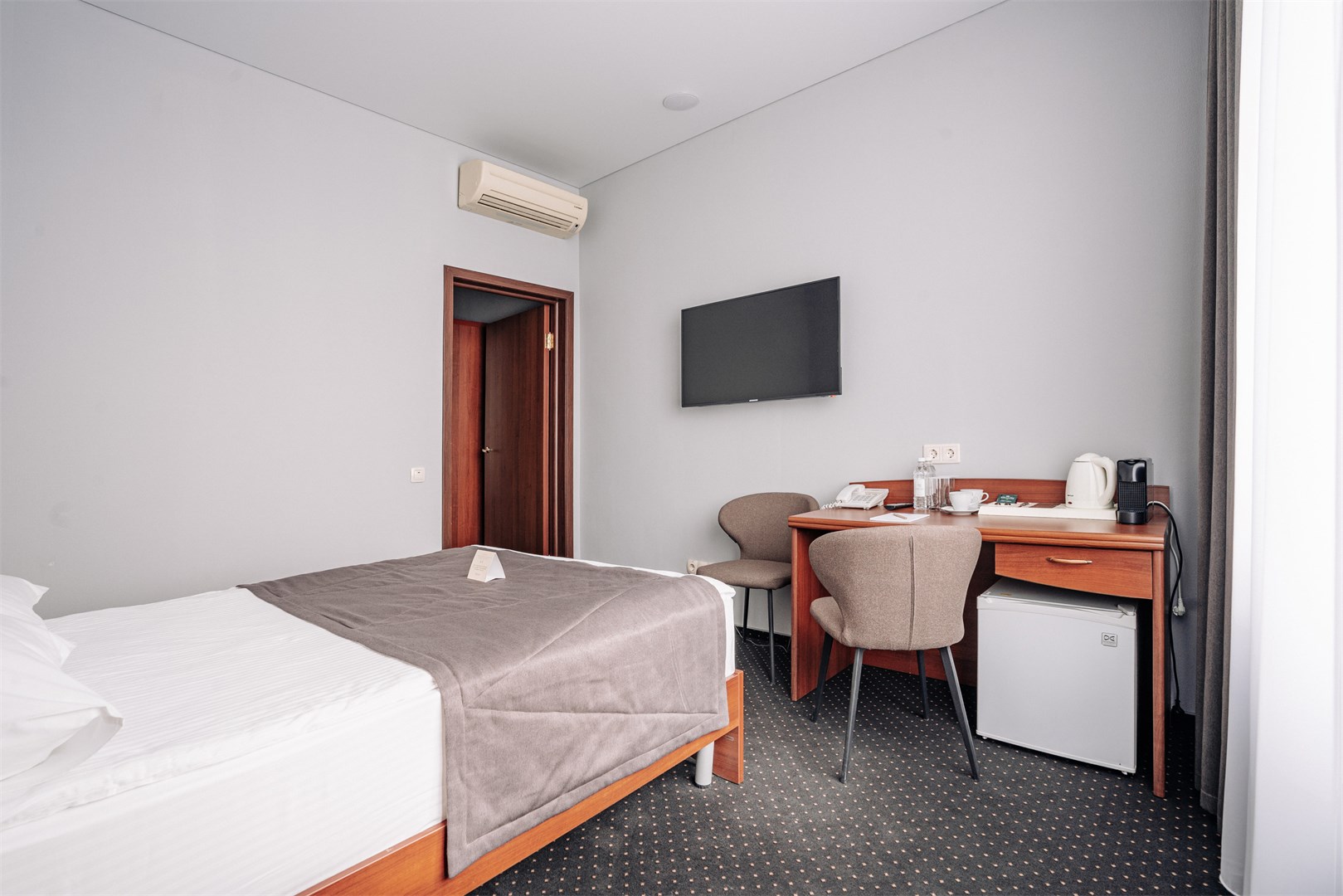 В номере: вешалка, зеркало, кровать полутороспальная, прикроватная тумбочка, стол, стул, шкаф, кондиционер, телевизор, телефон, холодильник