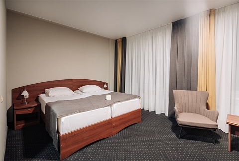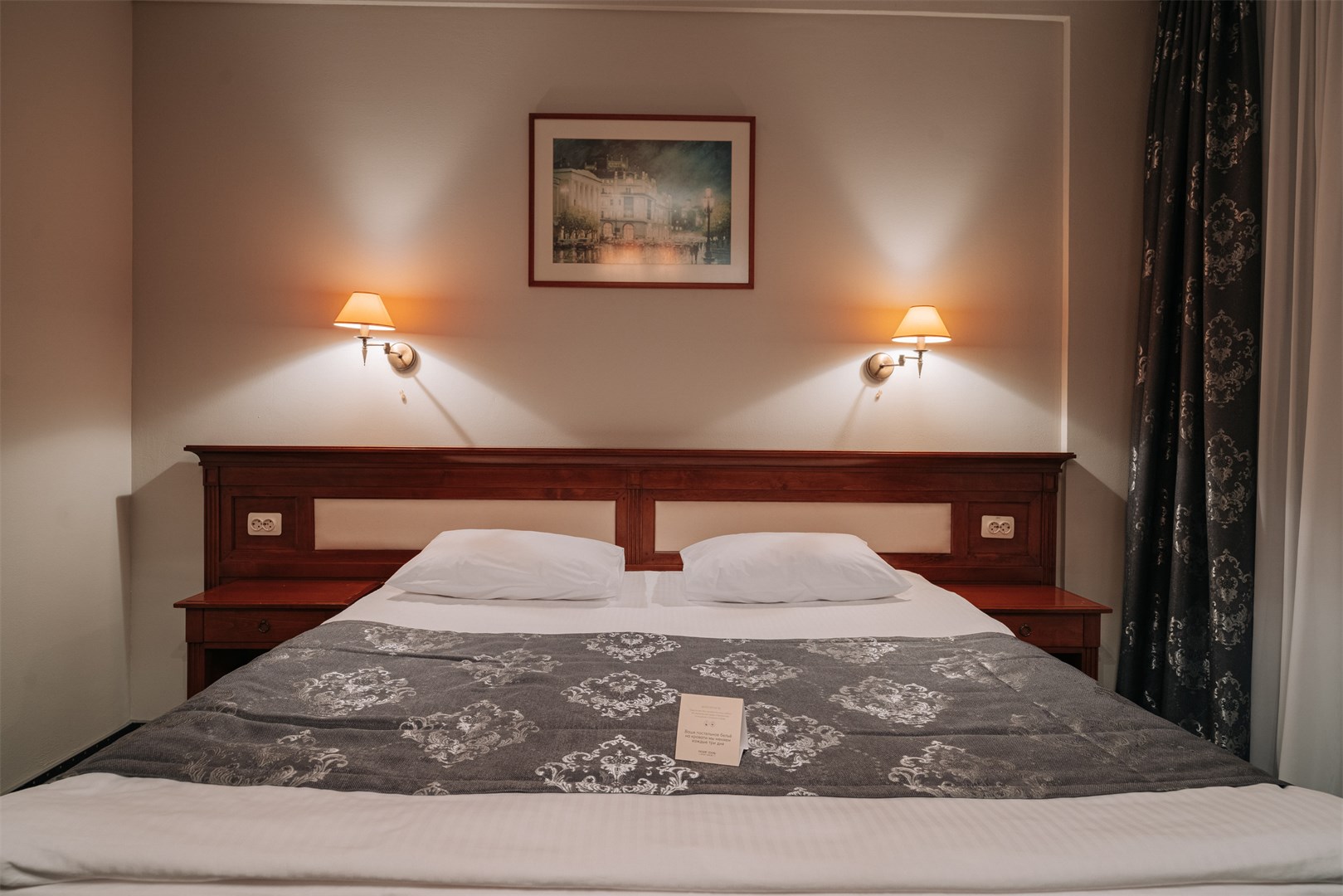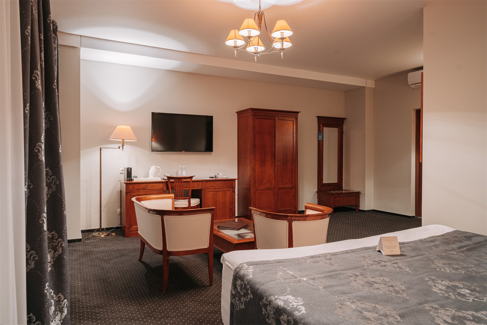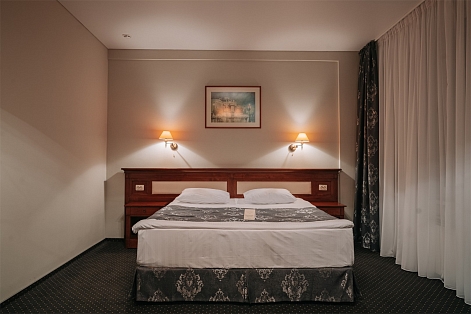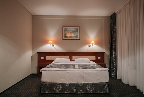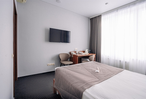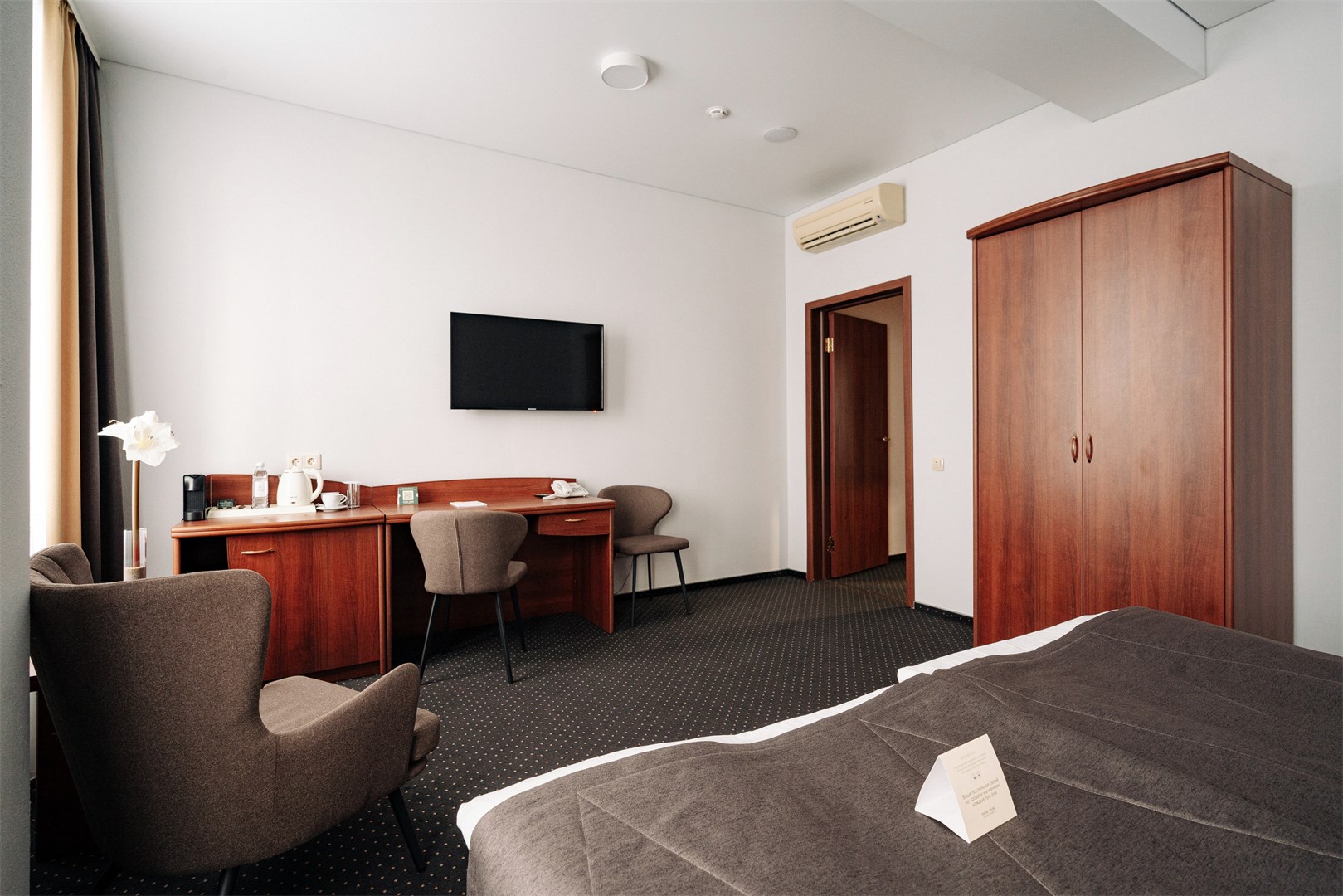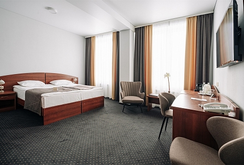 В номере: вешалка, зеркало, кровать двуспальная, прикроватные тумбочки, стол, стулья, шкаф, кондиционер, сейф, телевизор, телефон, холодильник