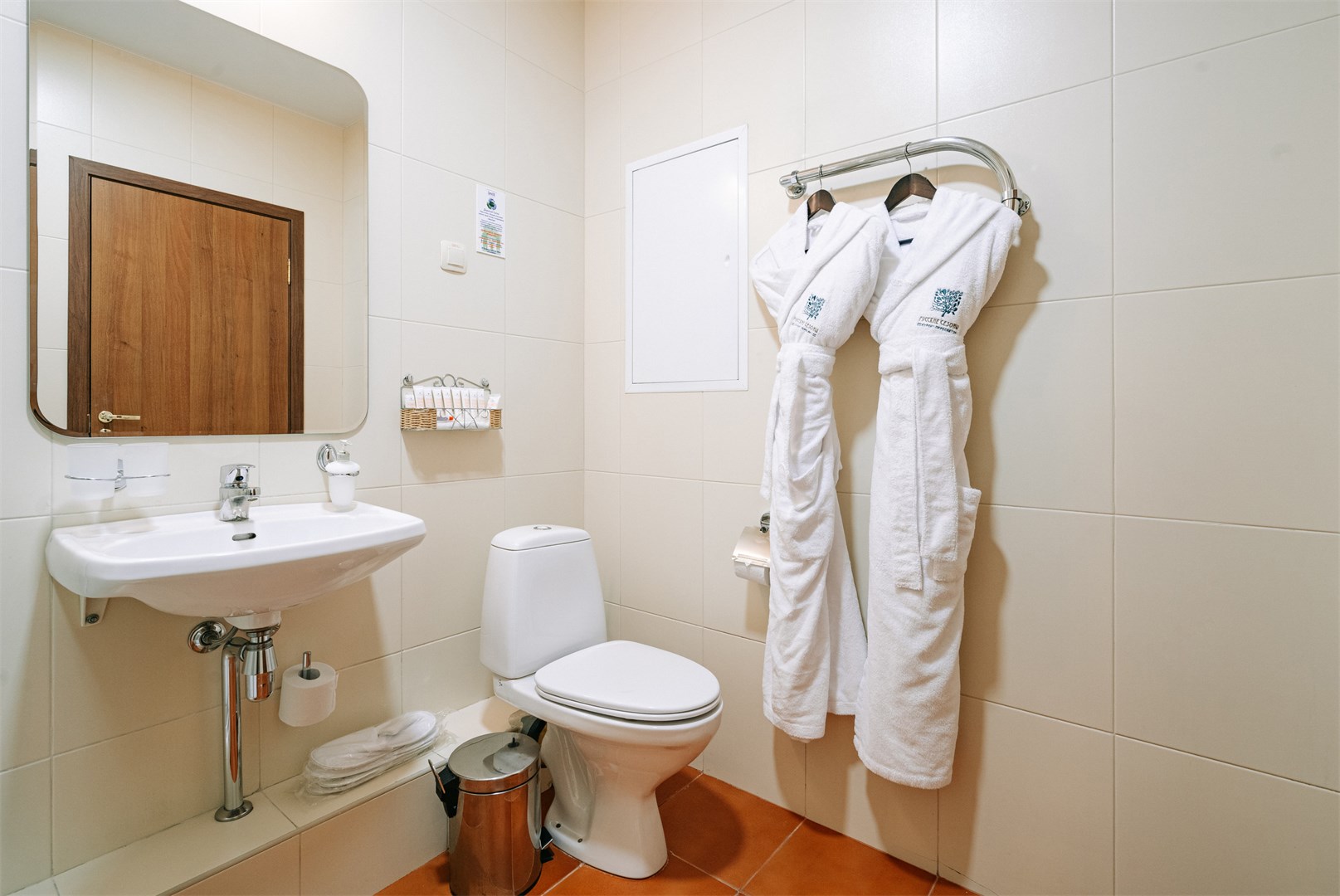 Санузел: с душевой кабиной, тапочки, туалетные принадлежности, фен, халат