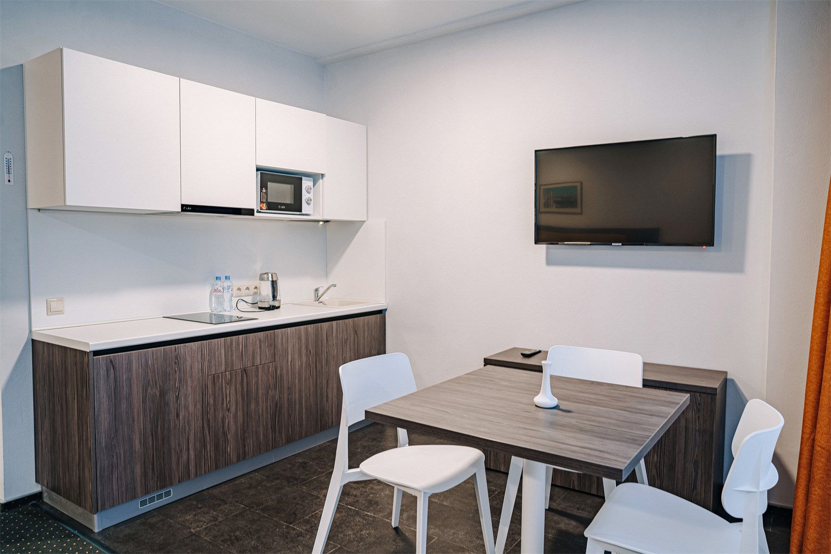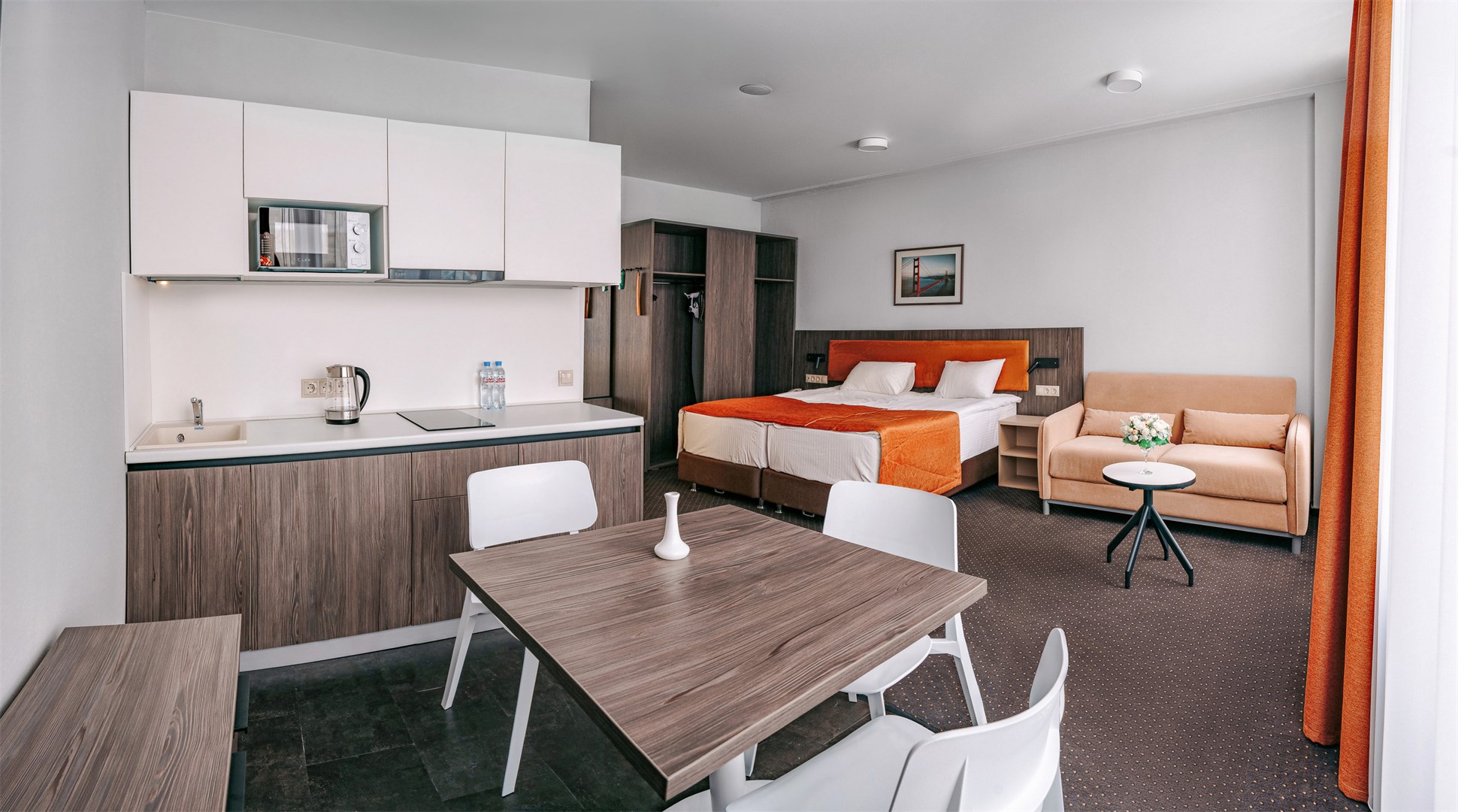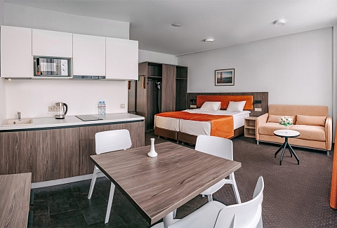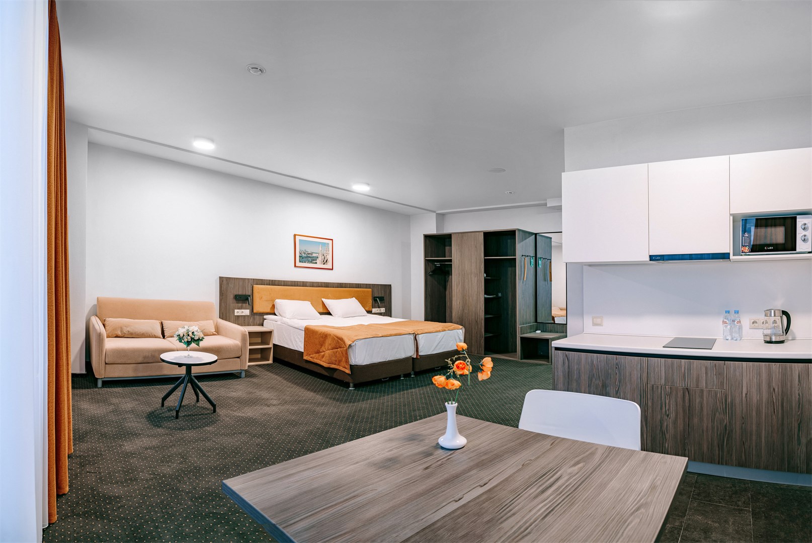 В номере: вешалка, диван, зеркало, кровать двуспальная, прикроватные тумбочки, стол, стулья, шкаф, гладильная доска, кондиционер, микроволновая печь, набор посуды, плита электрическая, стиральная машина, телевизор, телефон, утюг, холодильник, электрочайник