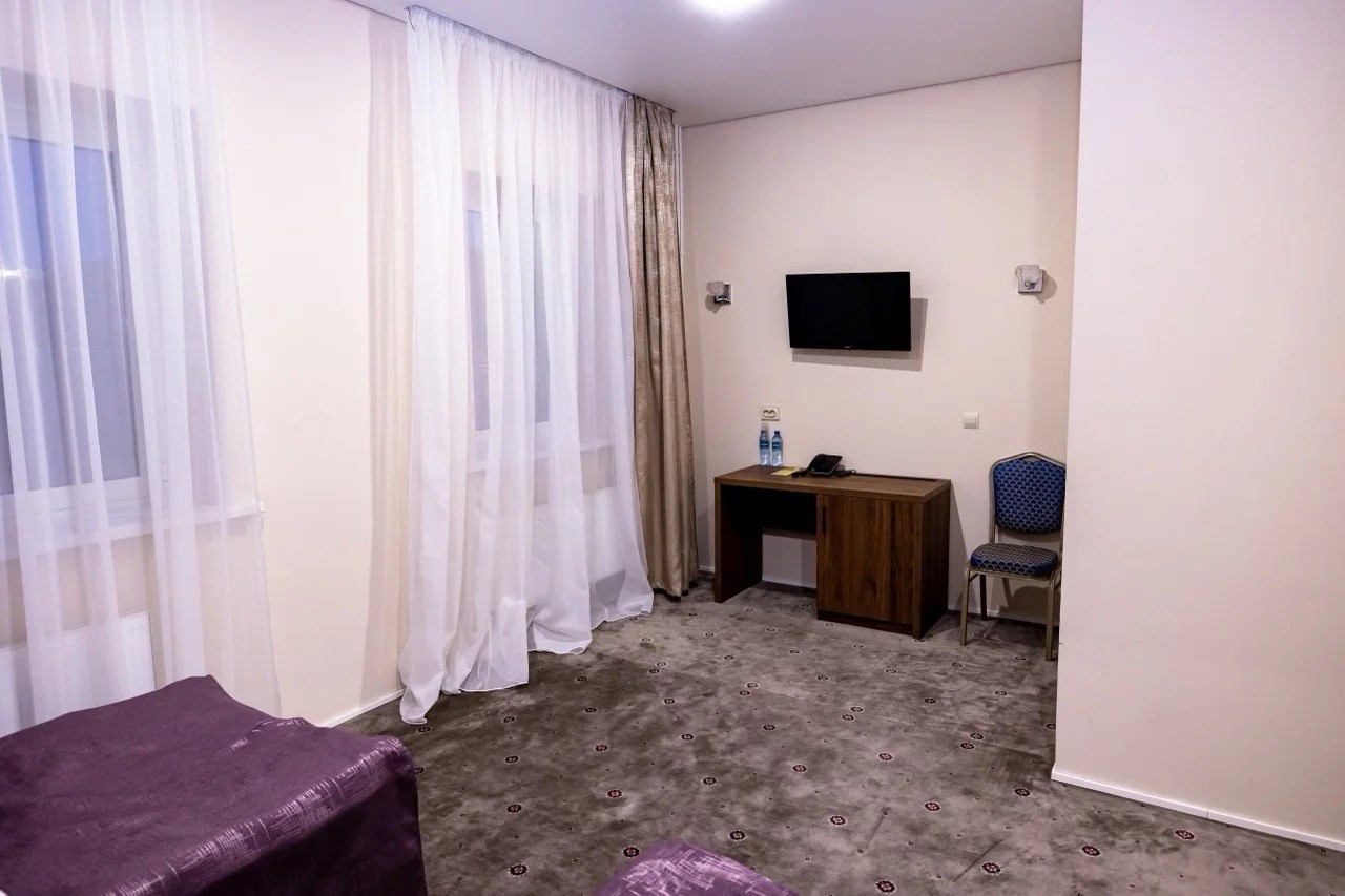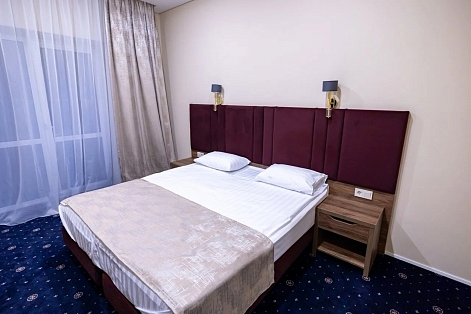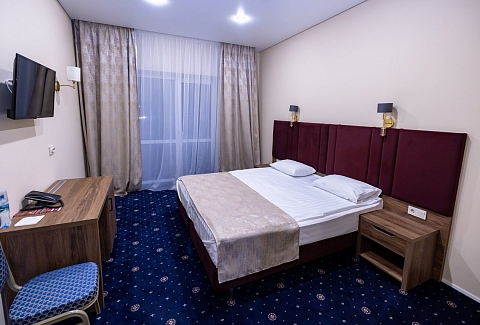 В номере: вешалка, зеркало, кровать двуспальная, прикроватные тумбочки, стол, стул, шкаф, кондиционер, мини-холодильник, набор посуды, телевизор ЖК, телефон