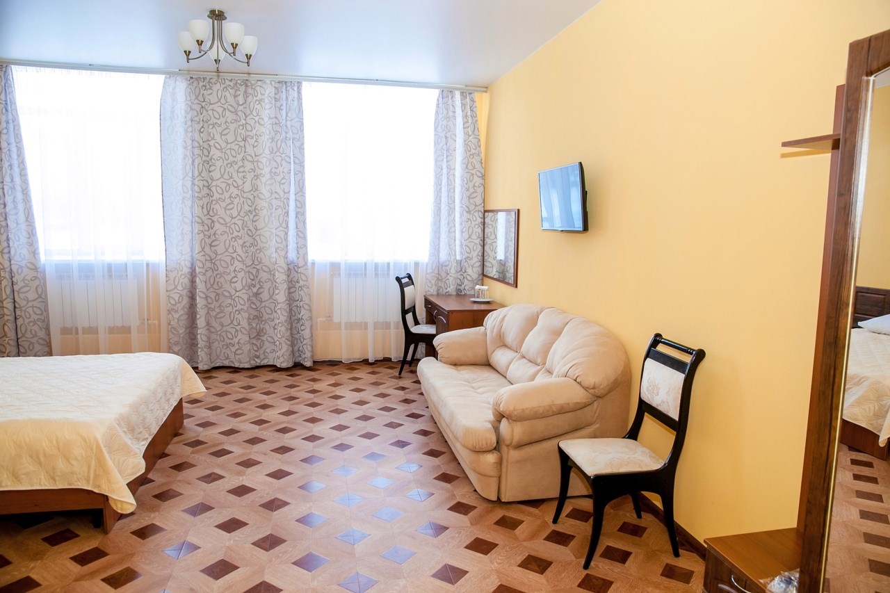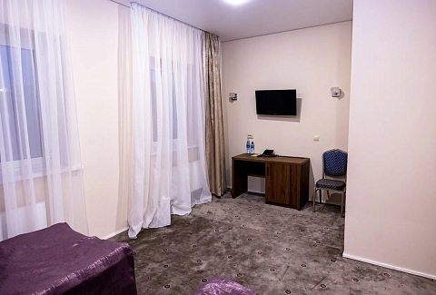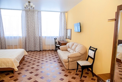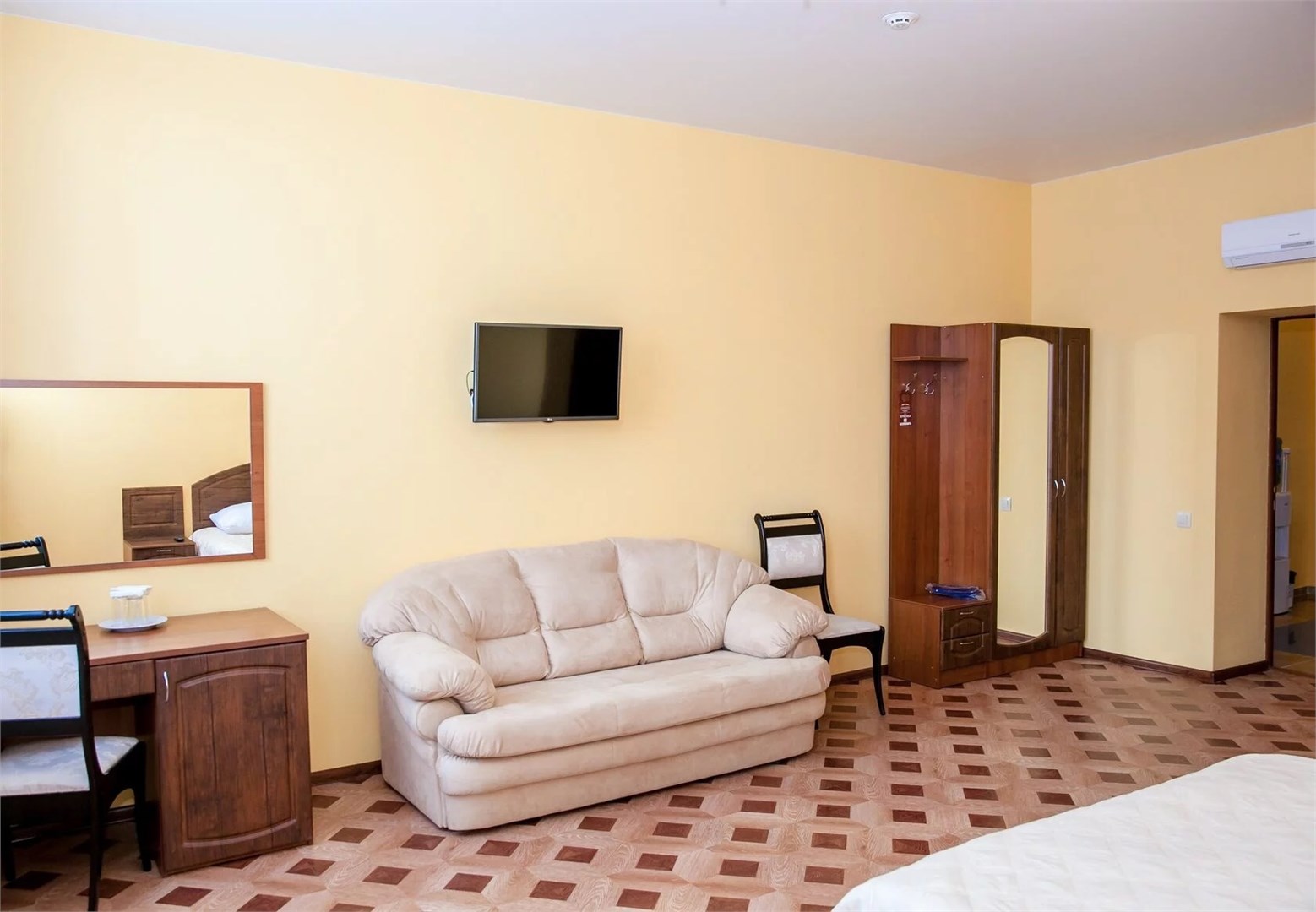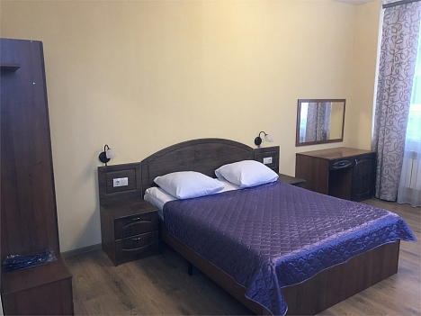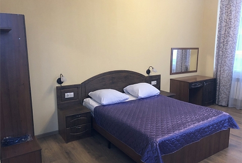 В номере: вешалка, диван, зеркало, кровать двуспальная, прикроватные тумбочки, столик туалетный, стулья, шкаф, кондиционер, мини-холодильник, набор посуды, телевизор ЖК, телефон
