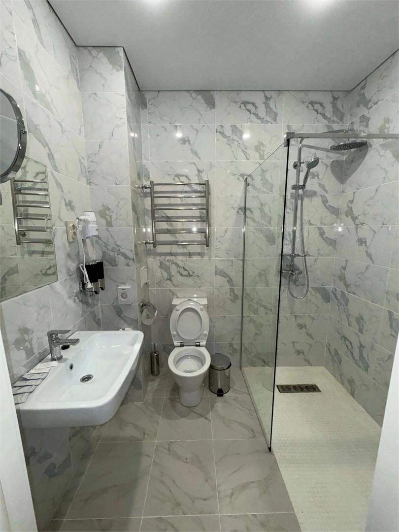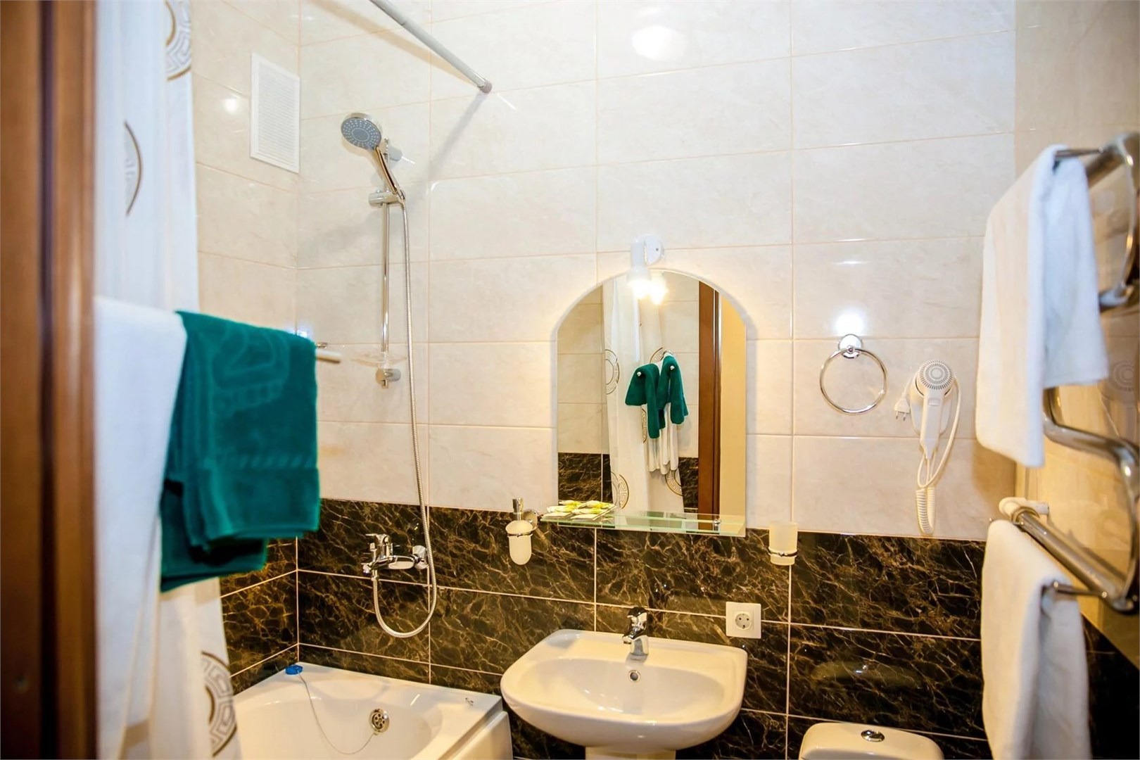 Санузел: с душем, тапочки, туалетные принадлежности, фен
