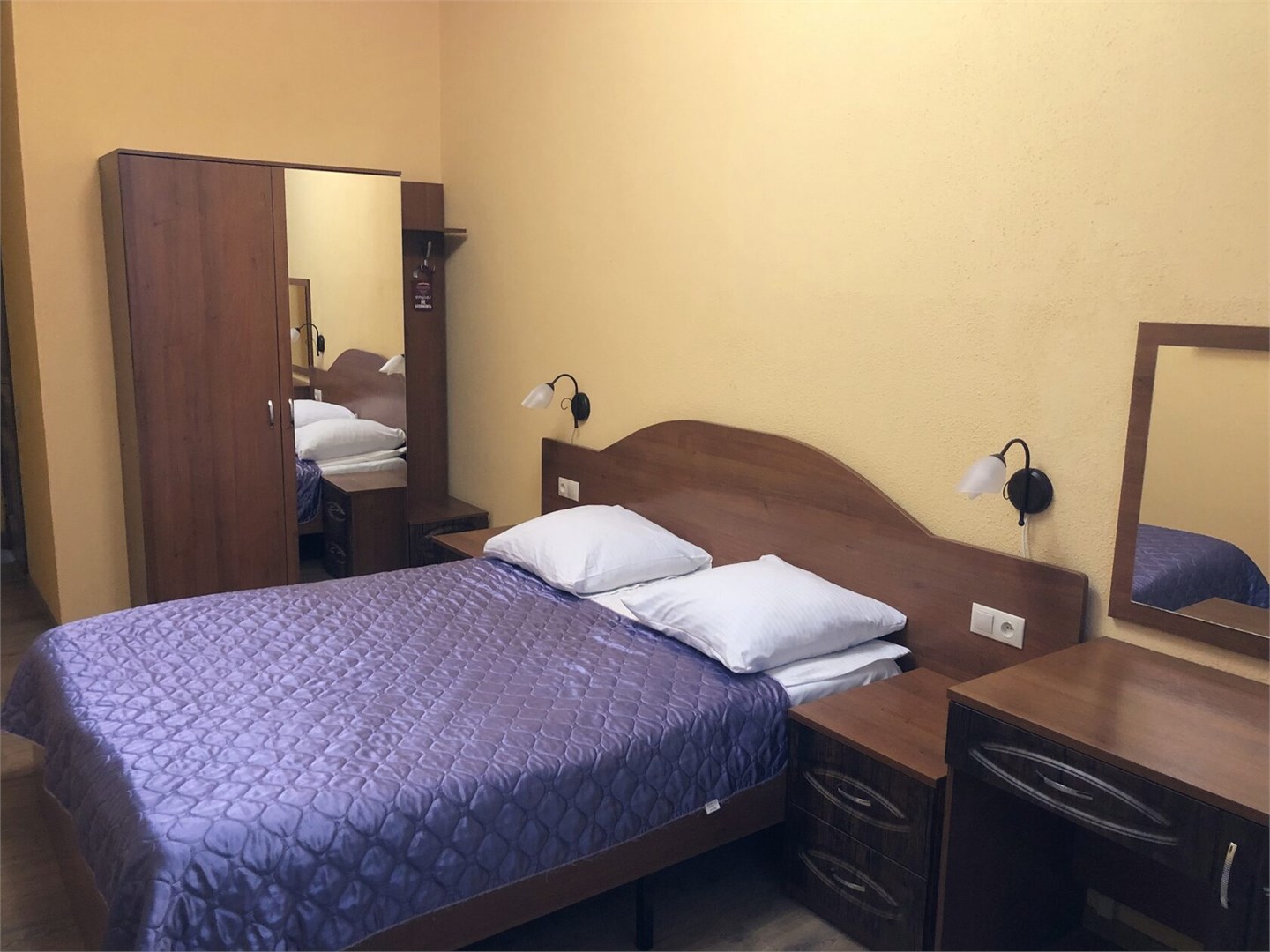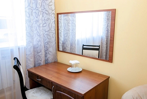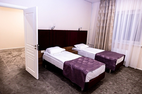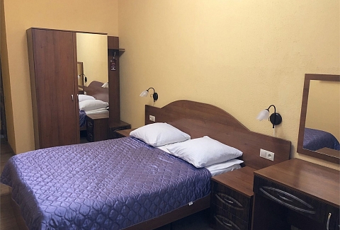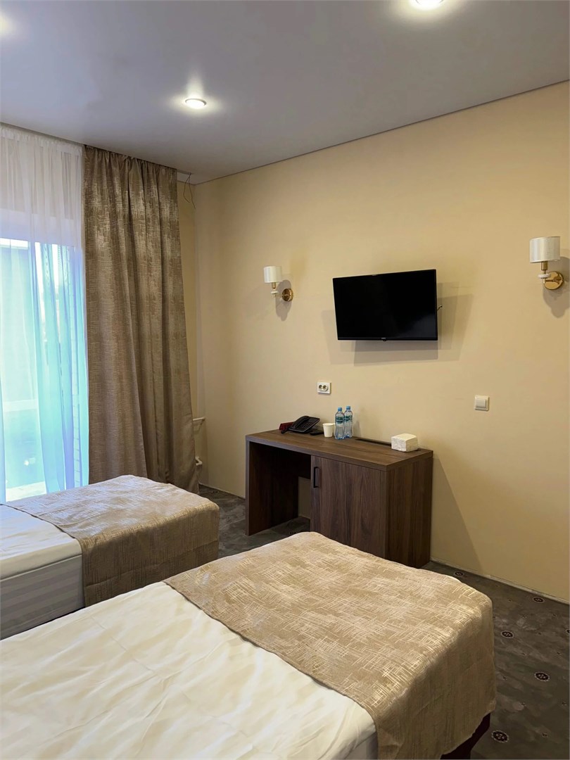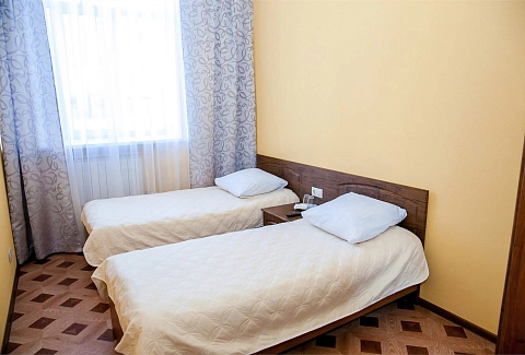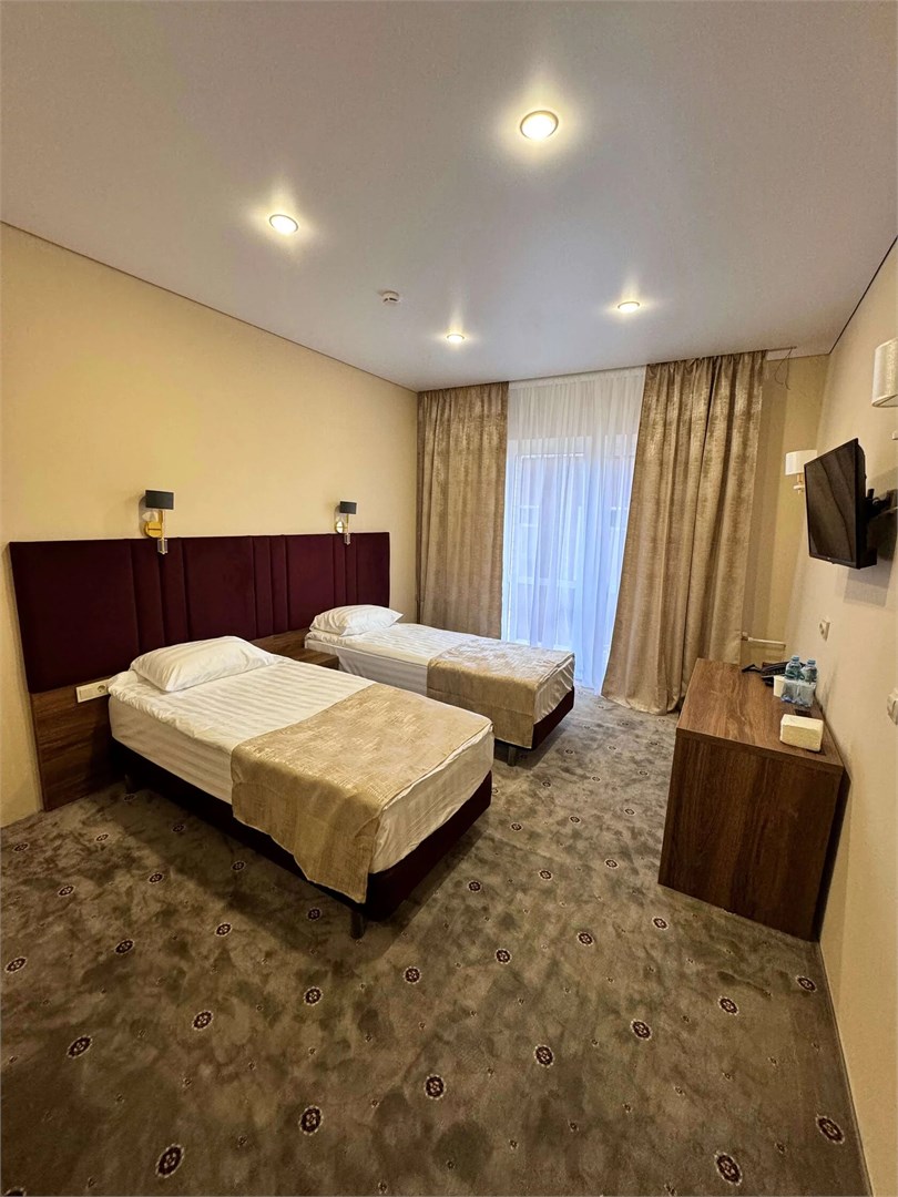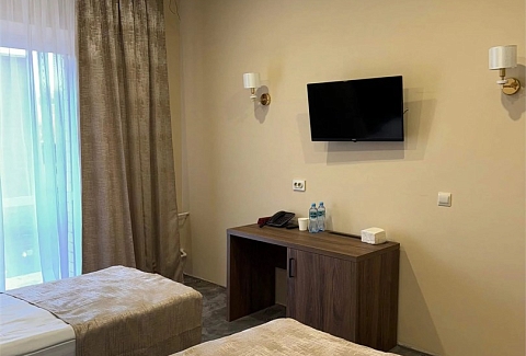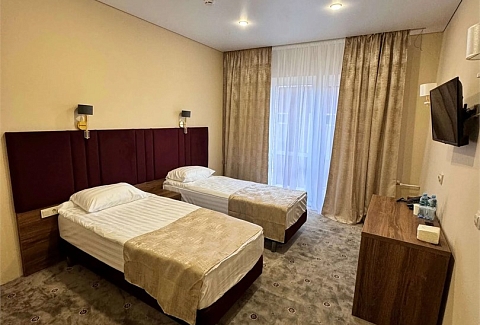 В номере: вешалка, зеркало, кровати односпальные, прикроватные тумбочки, стол, стул, шкаф, кондиционер, мини-холодильник, набор посуды, телевизор ЖК, телефон