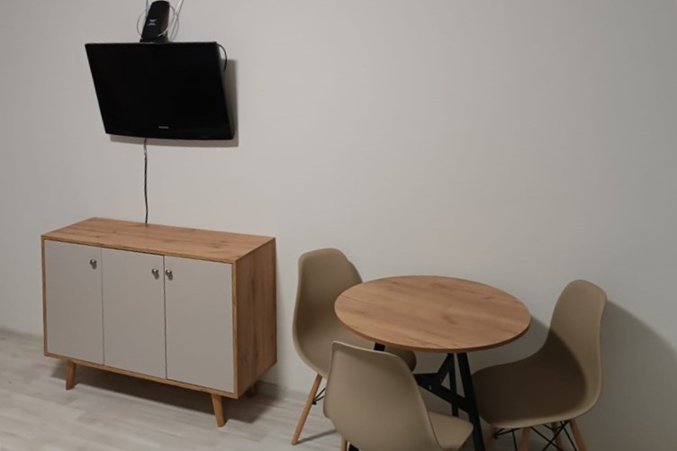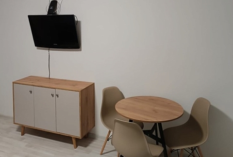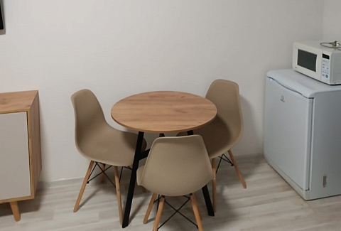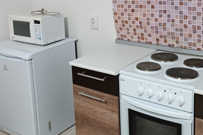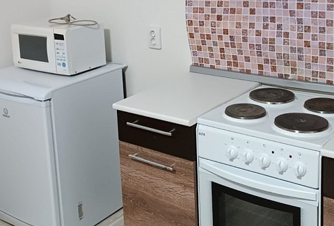 В номере: вешалка, диван раскладной, зеркало, комод, кровать двуспальная, стол, стулья, гладильная доска, микроволновая печь, мини-холодильник, набор посуды, плита электрическая, телевизор, утюг, электрочайник