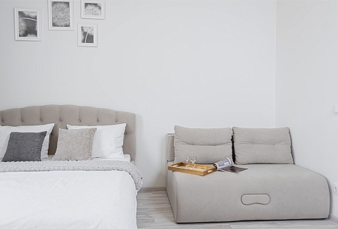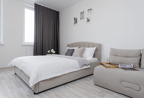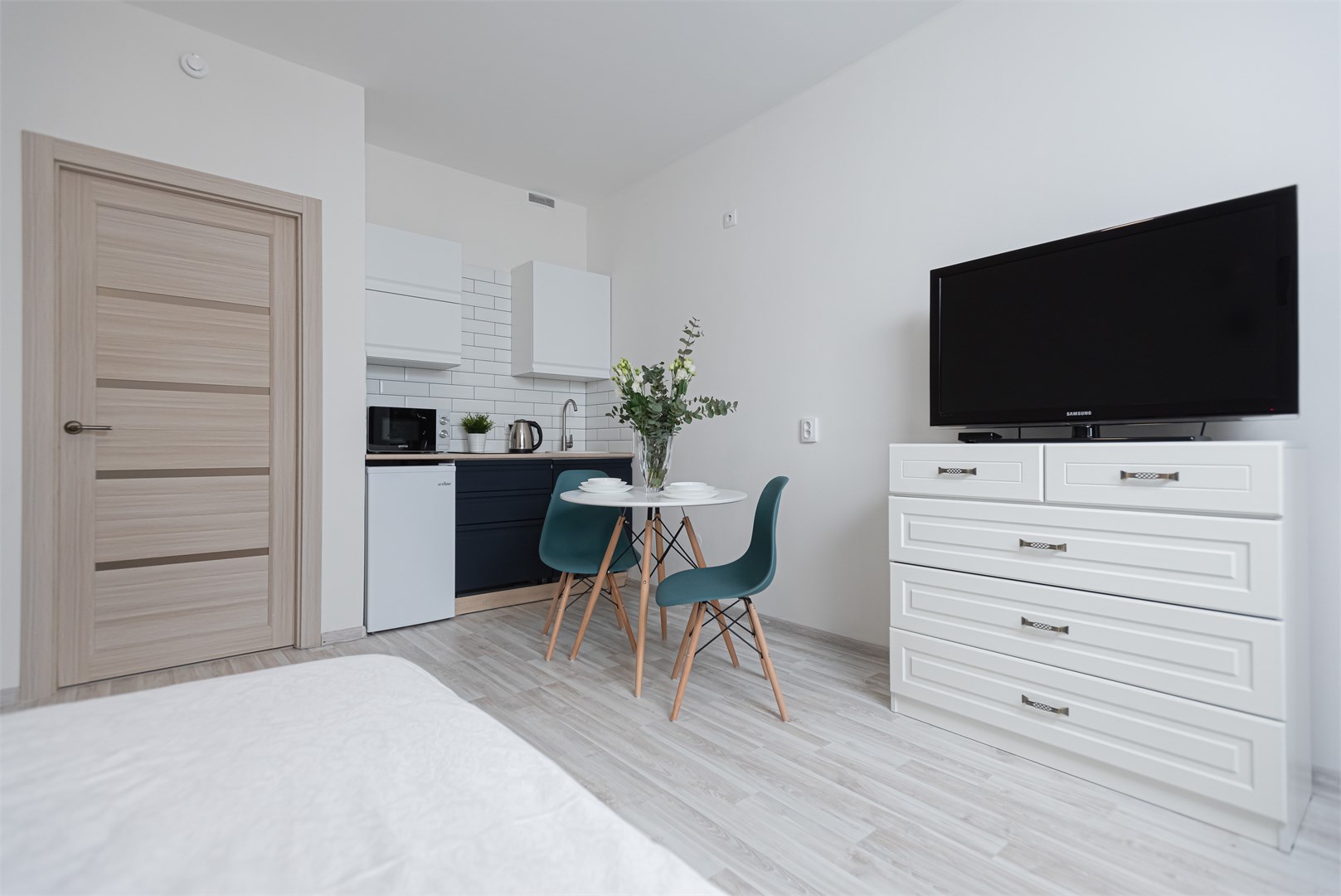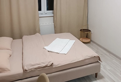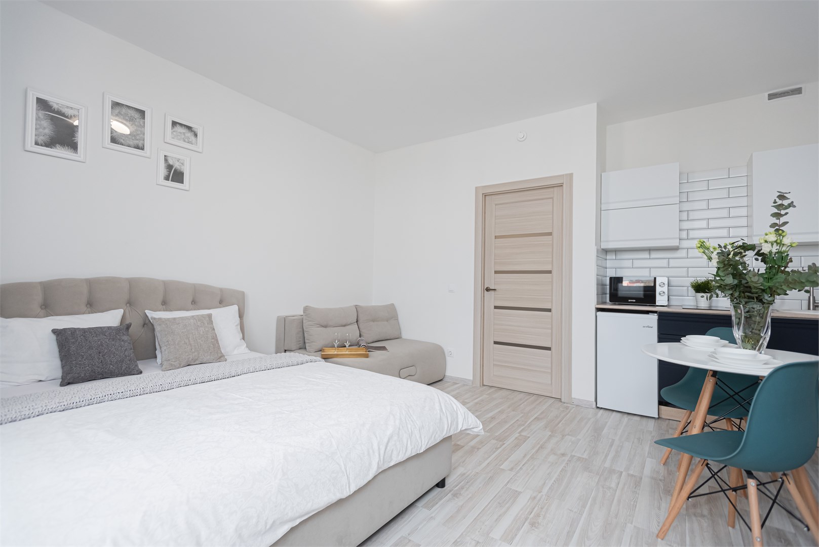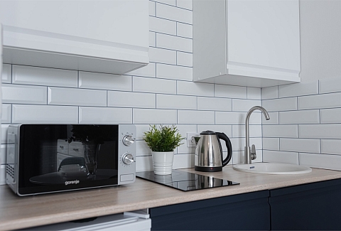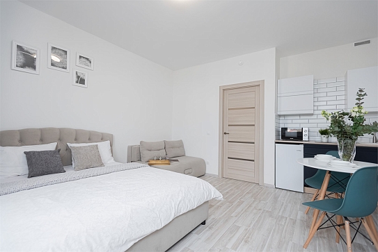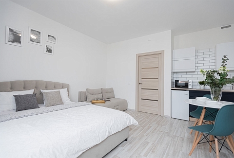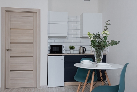 В номере: вешалка, диван раскладной, зеркало, кровать двуспальная, прикроватный столик, стол, столик туалетный, стулья, шкаф, гладильная доска, духовой шкаф, микроволновая печь, мини-холодильник, набор посуды, плита электрическая, стиральная машина, телевизор, утюг, электрочайник