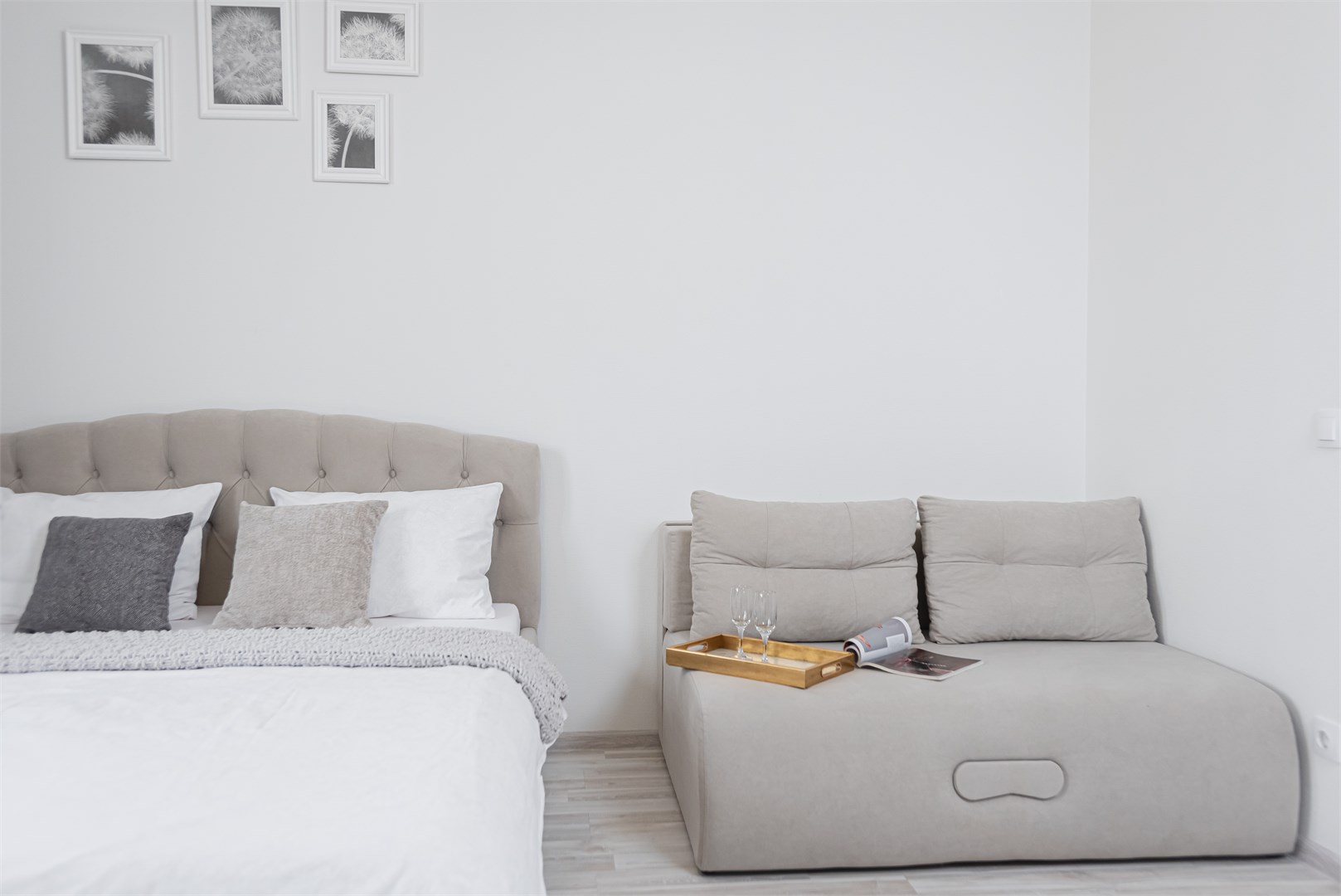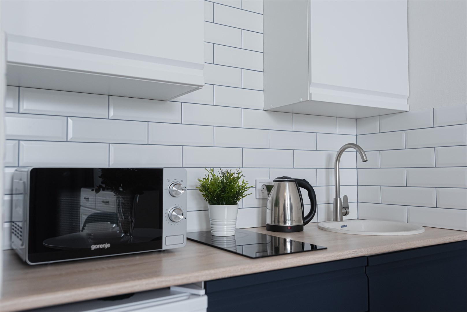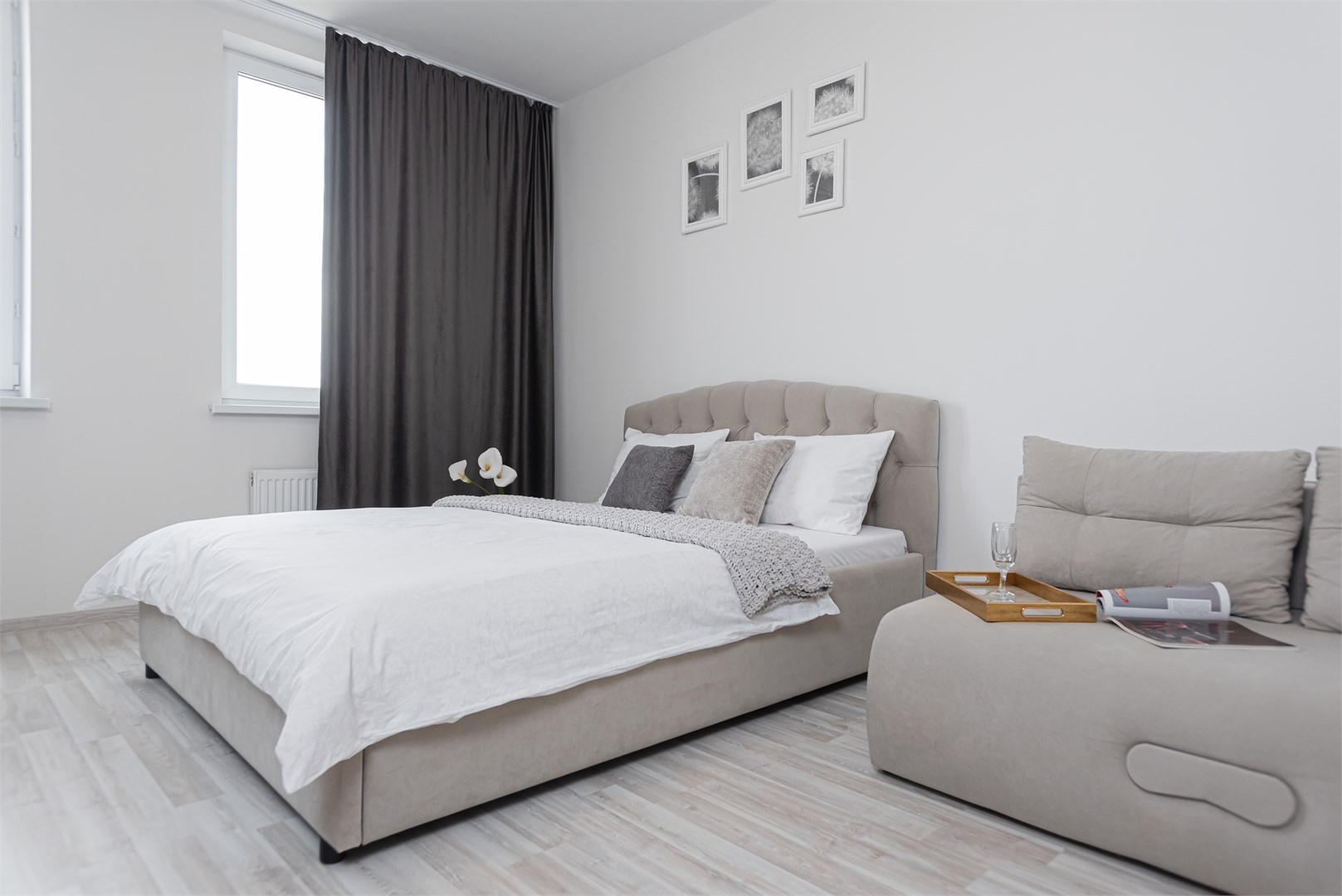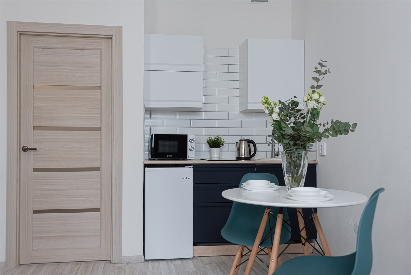 В номере: вешалка, диван раскладной, зеркало, кровать двуспальная, прикроватный столик, стол, столик туалетный, стулья, шкаф, гладильная доска, духовой шкаф, микроволновая печь, мини-холодильник, набор посуды, плита электрическая, стиральная машина, телевизор, утюг, электрочайник