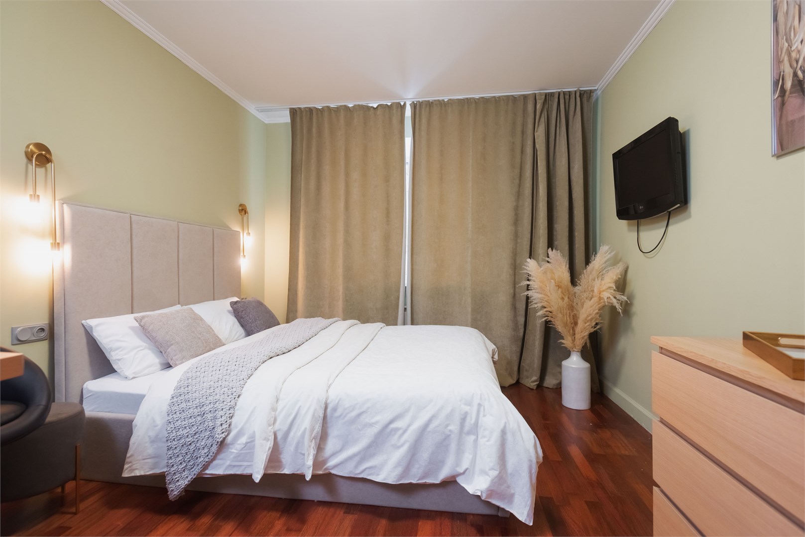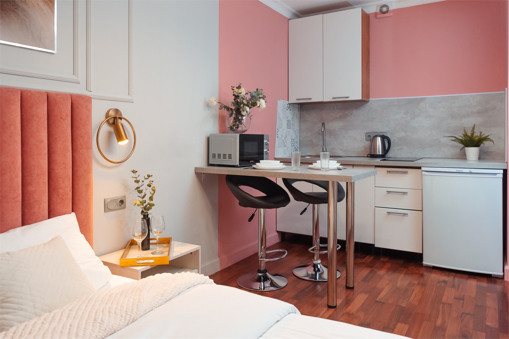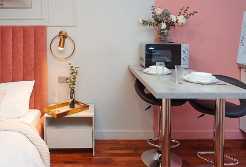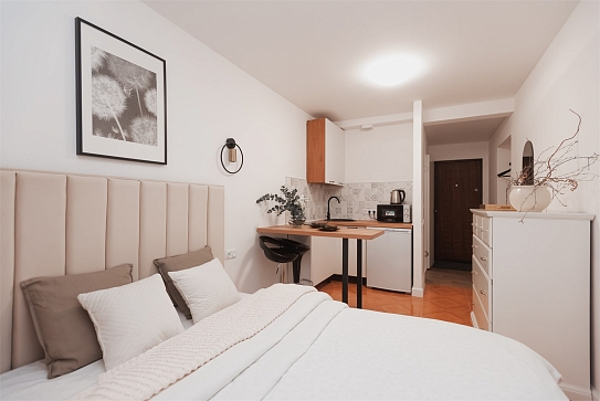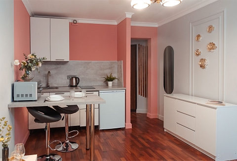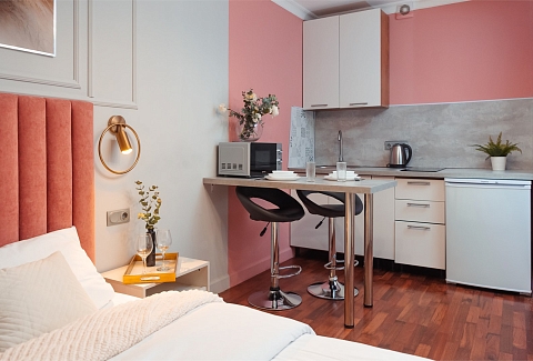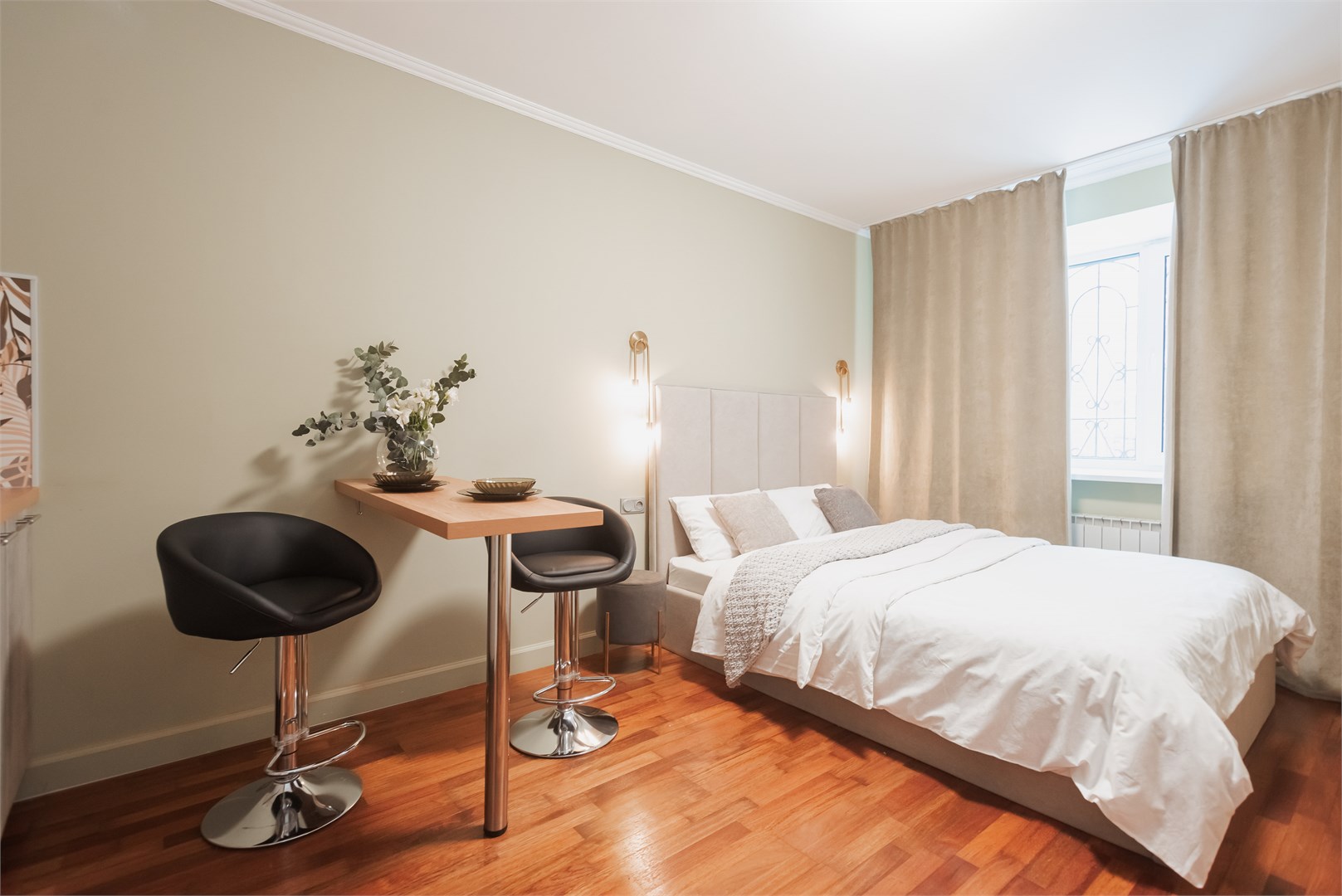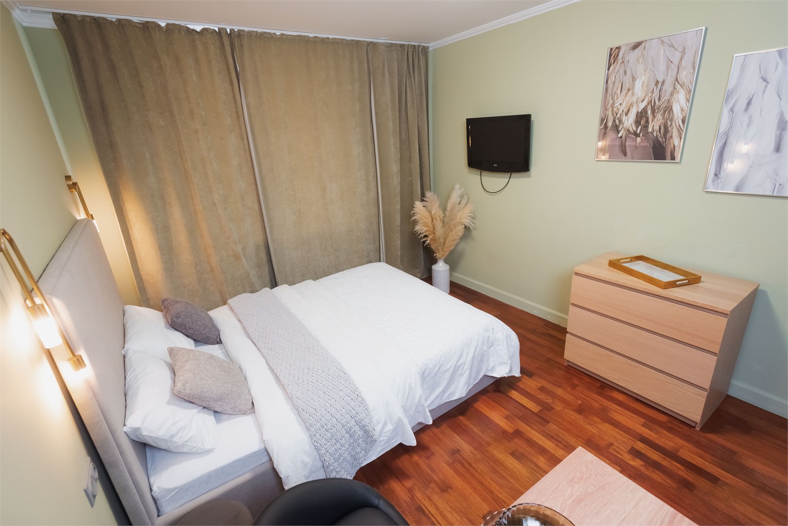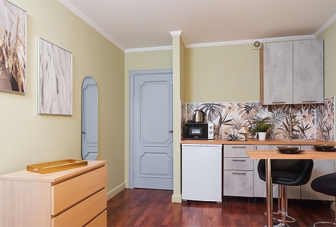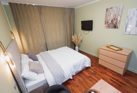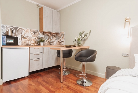 В номере: вешалка, зеркало, комод, кровать двуспальная, стол, стулья, шкаф, гладильная доска, микроволновая печь, мини-холодильник, набор посуды, плита электрическая, телевизор, утюг, электрочайник
