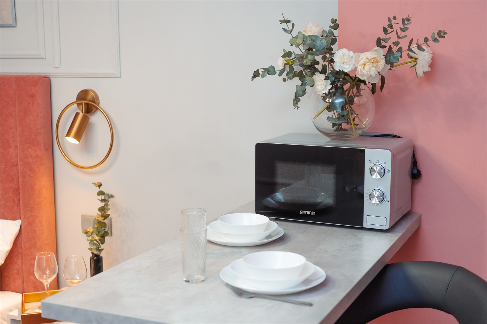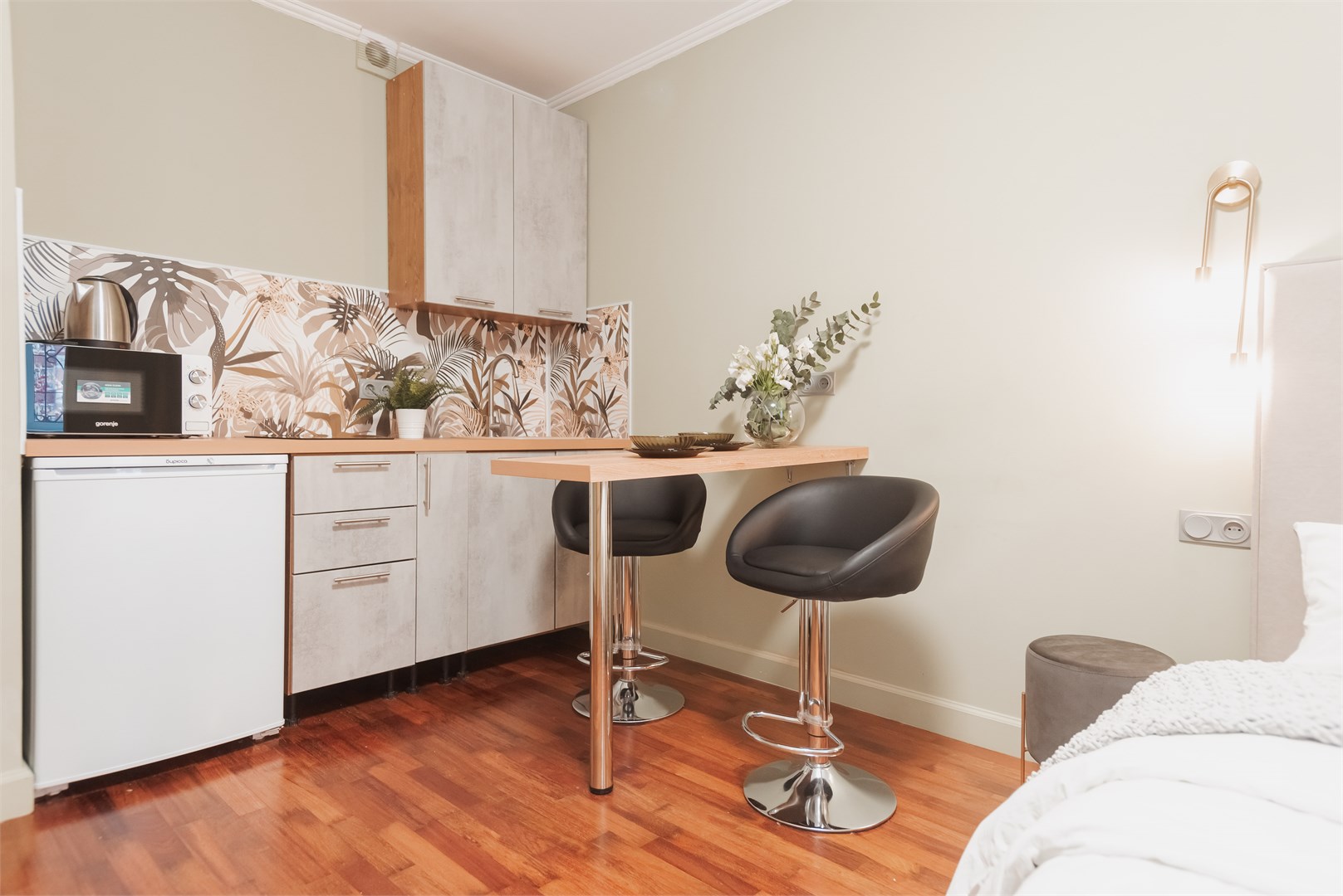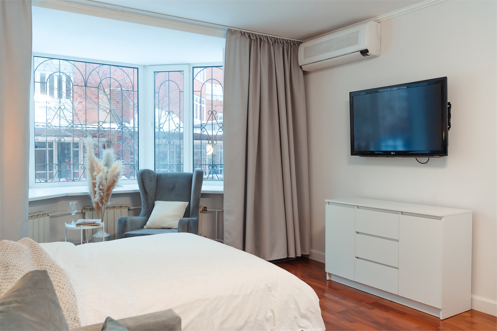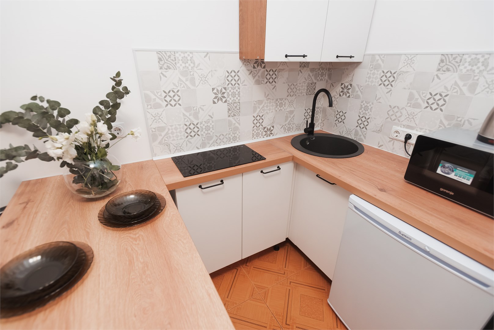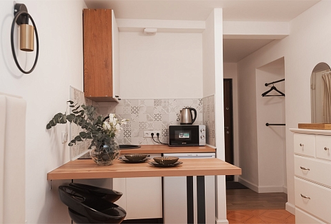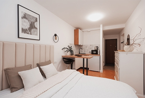 В номере: вешалка, зеркало, комод, кровать двуспальная, стол, стулья, шкаф, гладильная доска, микроволновая печь, мини-холодильник, набор посуды, плита электрическая, телевизор, утюг, электрочайник