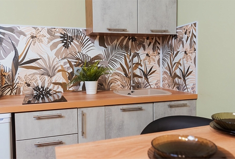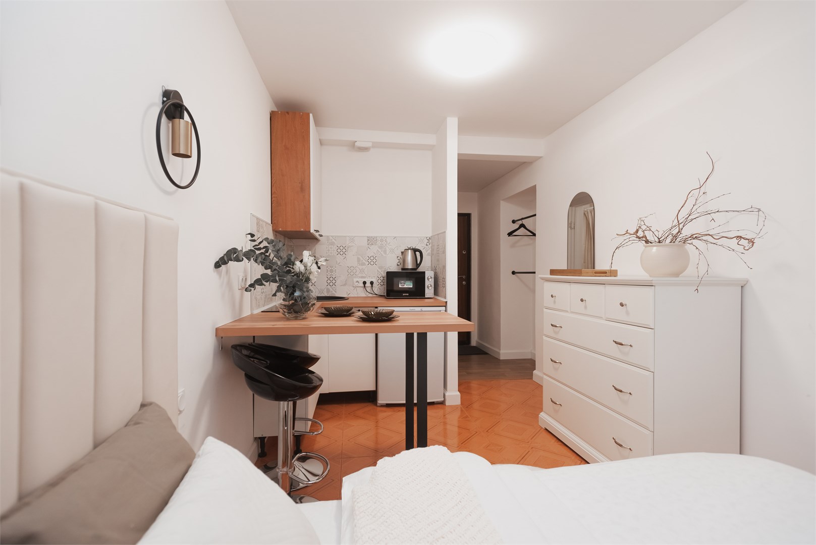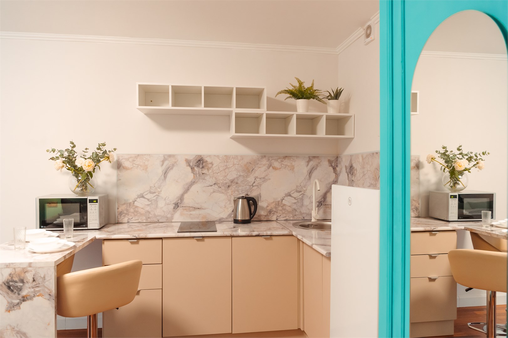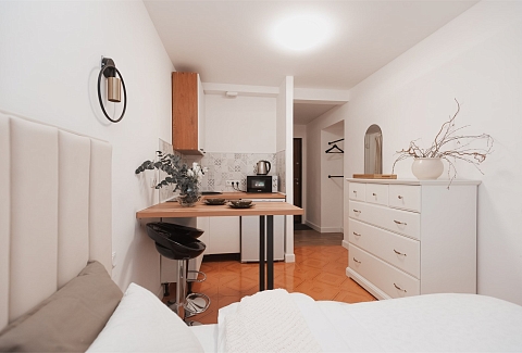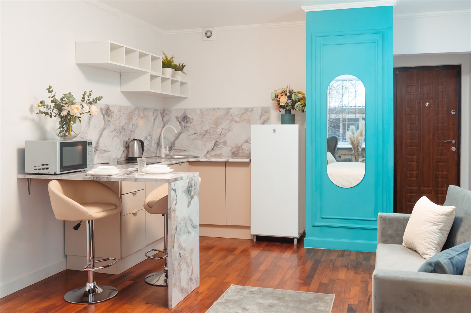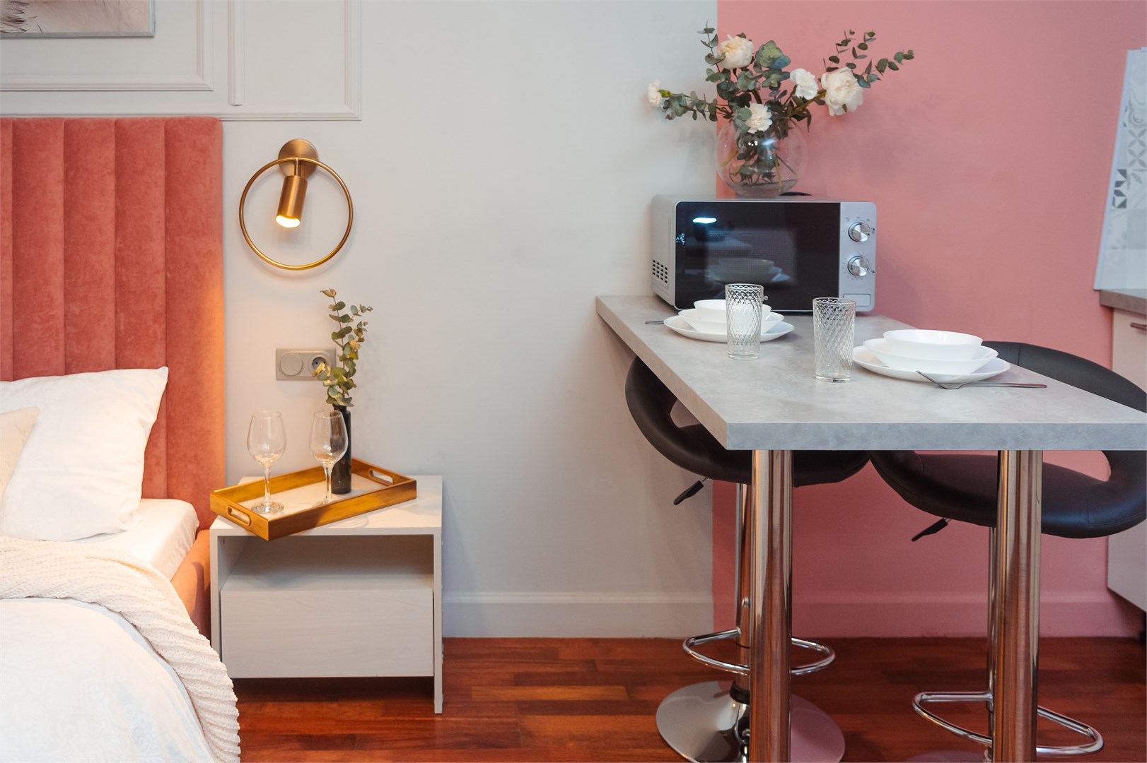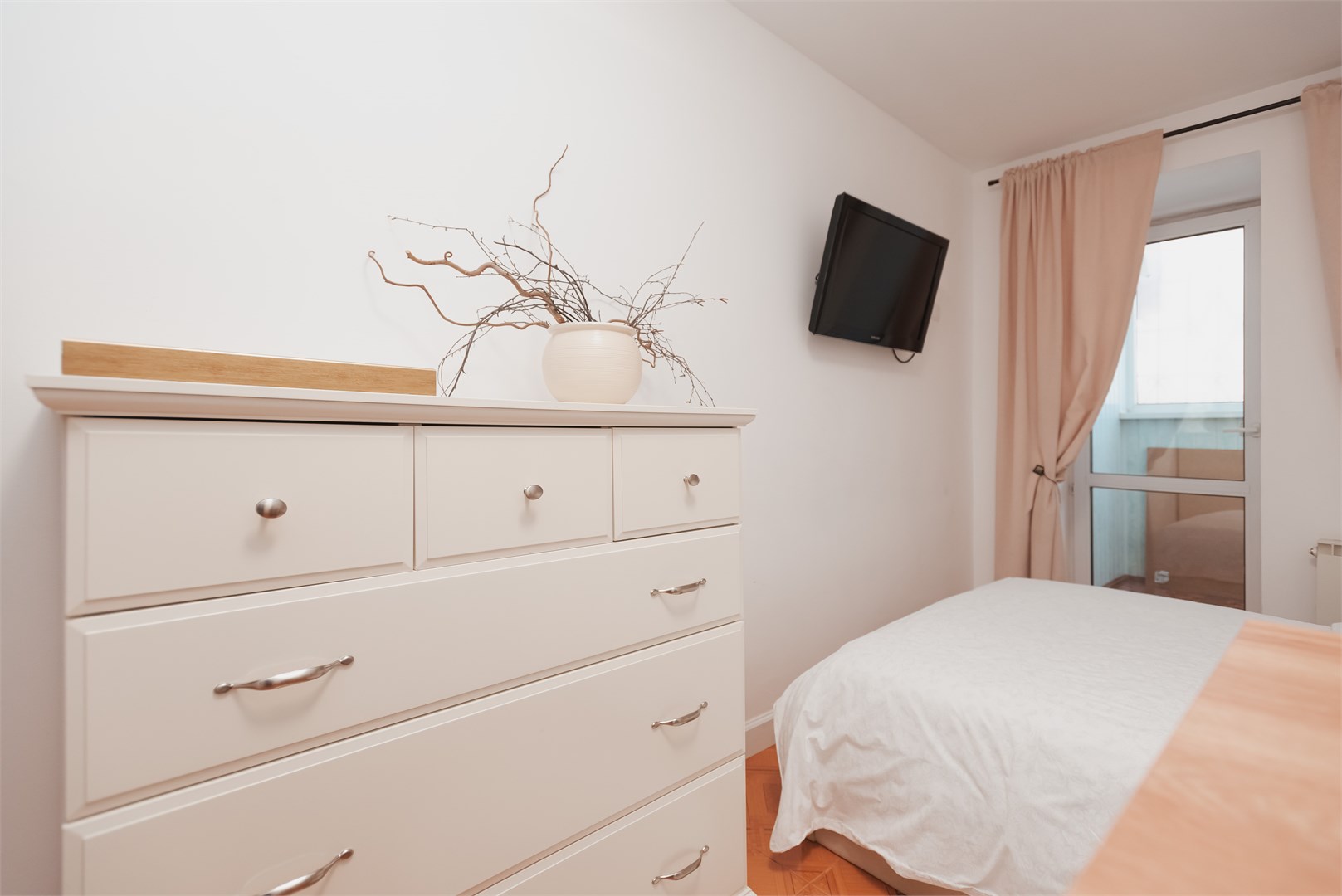 В номере: вешалка, зеркало, комод, кровать двуспальная, стол, стулья, шкаф, гладильная доска, микроволновая печь, мини-холодильник, набор посуды, плита электрическая, телевизор, утюг, электрочайник