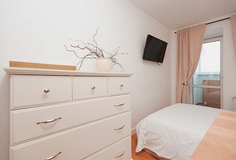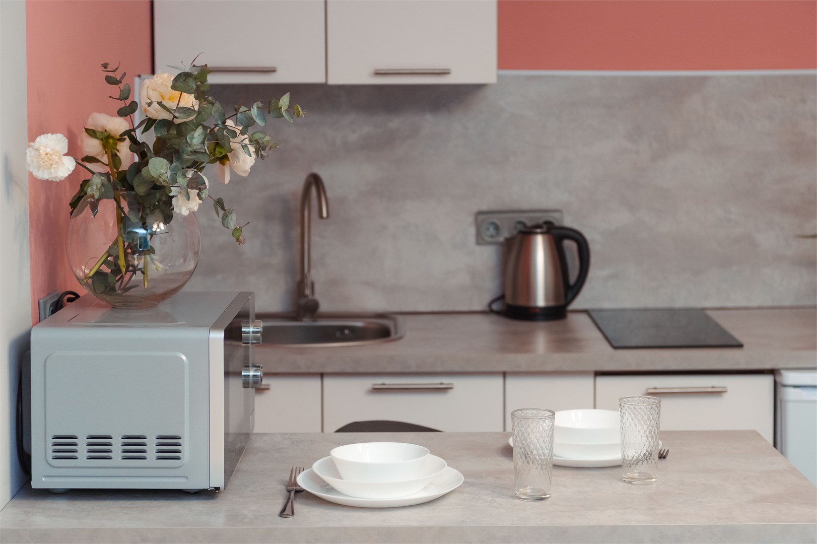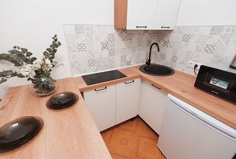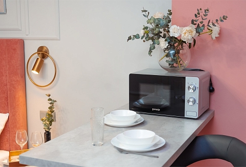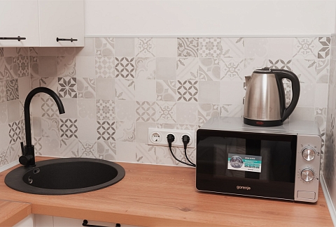 В номере: вешалка, зеркало, комод, кровать двуспальная, прикроватная тумбочка, стол, стулья, гладильная доска, микроволновая печь, мини-холодильник, набор посуды, плита электрическая, телевизор, утюг, электрочайник