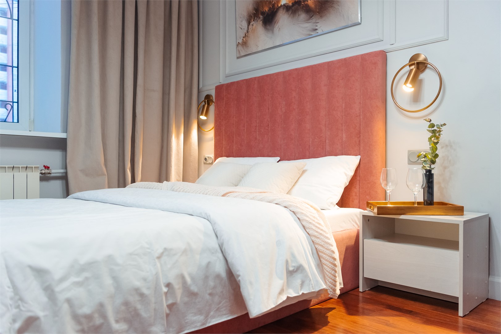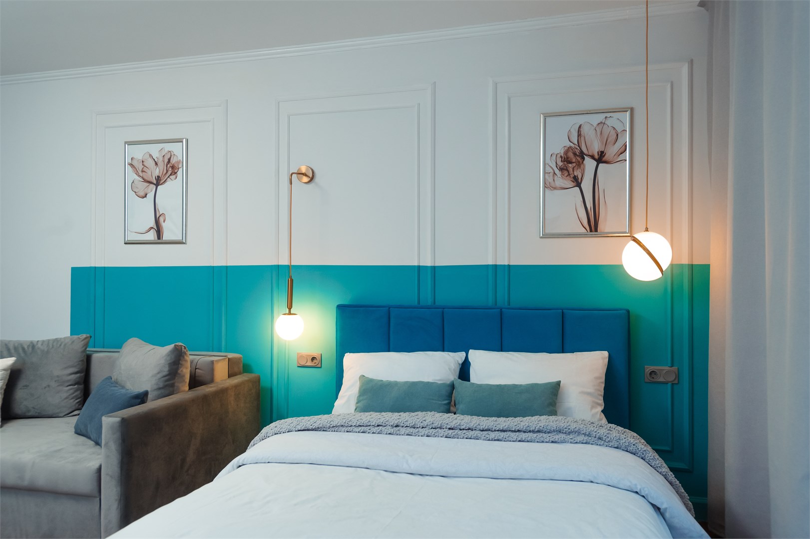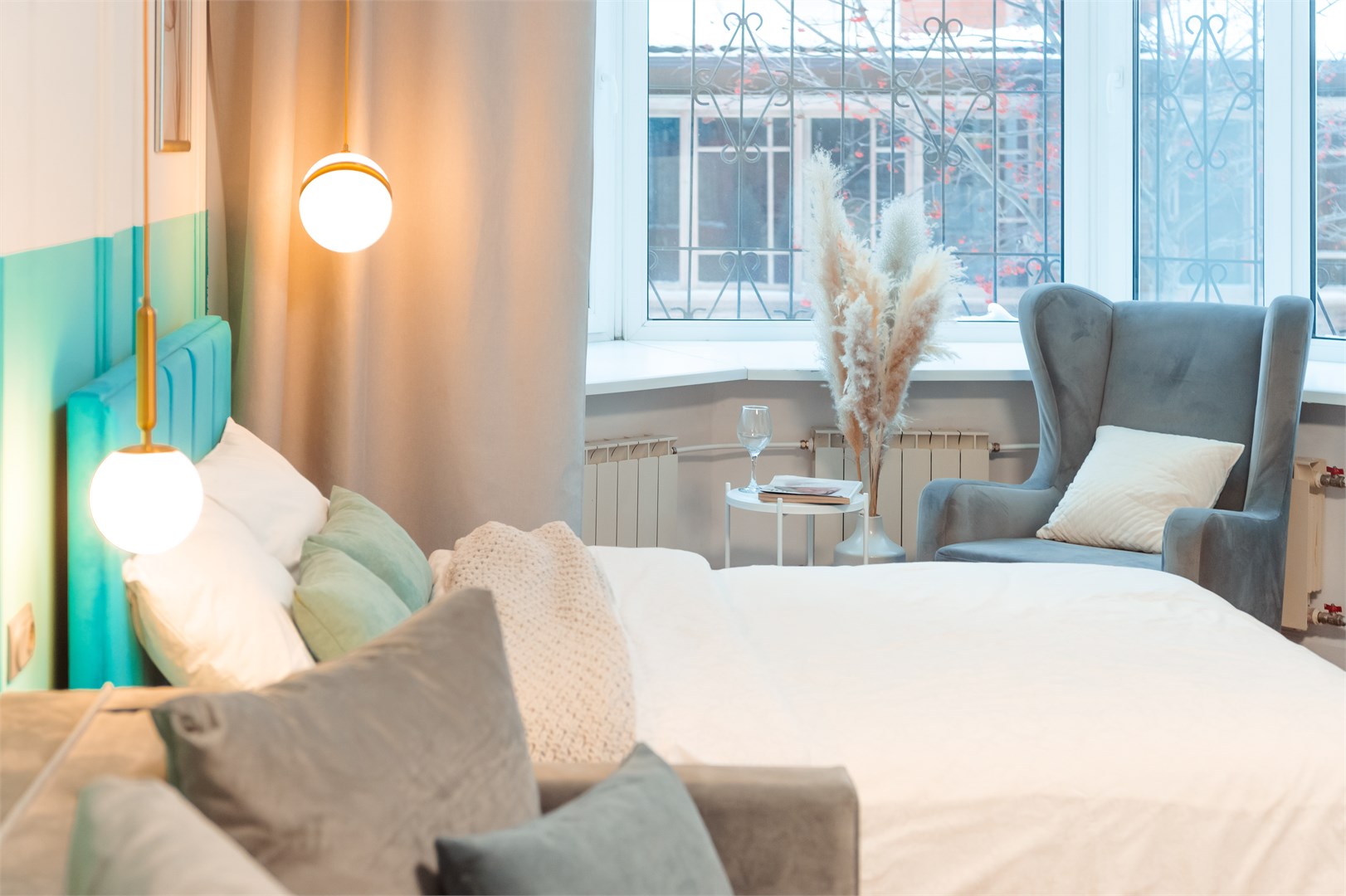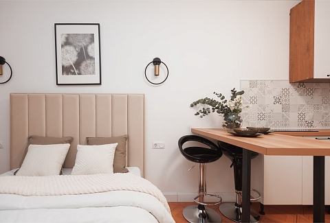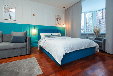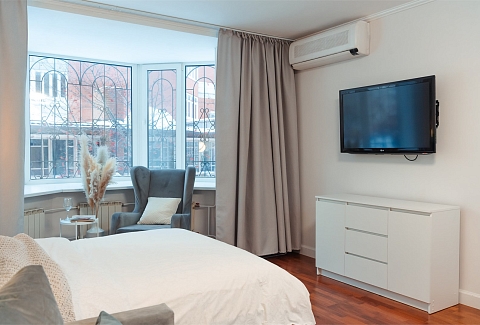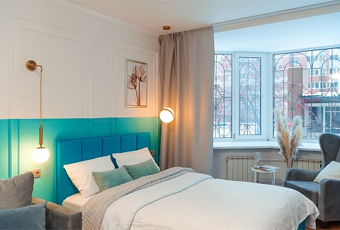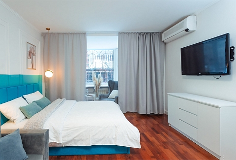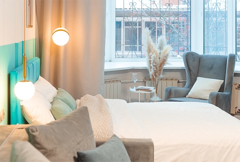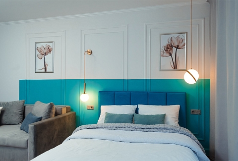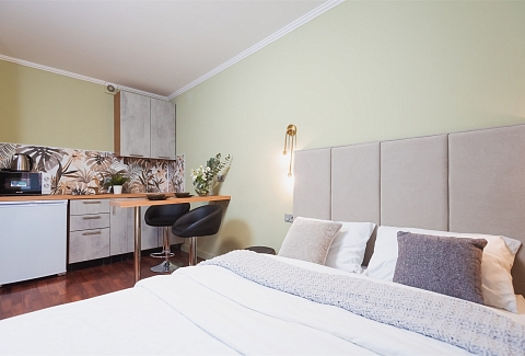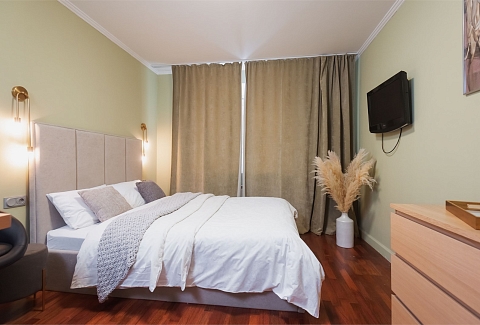 В номере: вешалка, диван раскладной, зеркало, комод, кресло, кровать двуспальная, стол, столик кофейный, стулья, гладильная доска, кондиционер, микроволновая печь, мини-холодильник, набор посуды, плита электрическая, телевизор, утюг, электрочайник