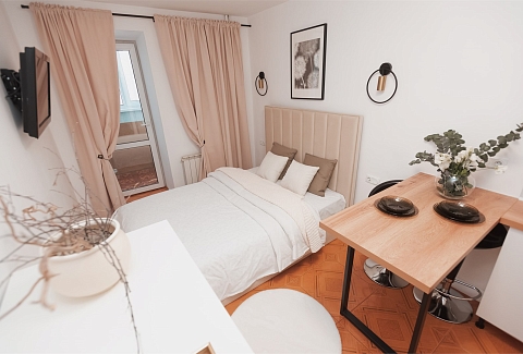 В номере: вешалка, зеркало, комод, кровать двуспальная, стол, стулья, гладильная доска, микроволновая печь, мини-холодильник, плита электрическая, телевизор, утюг, электрочайник