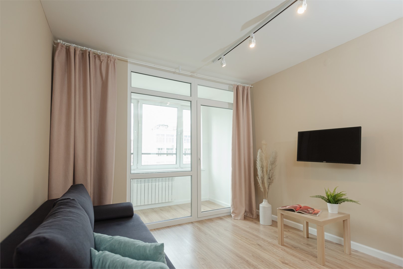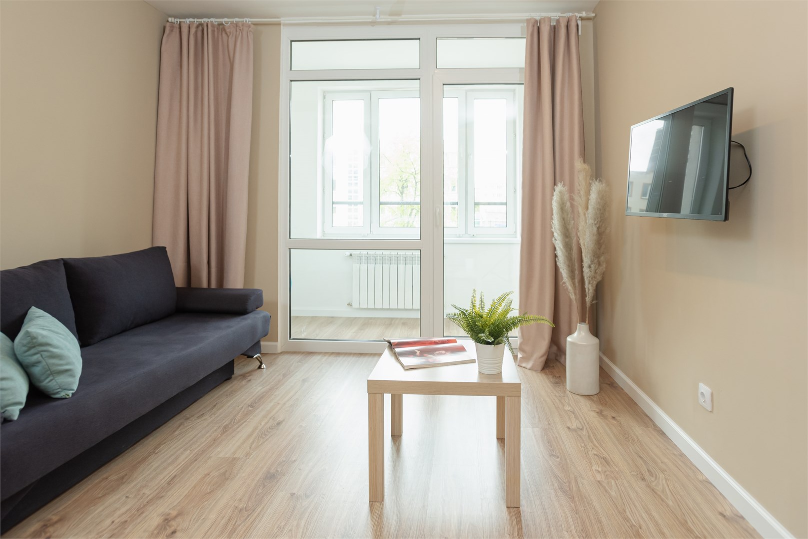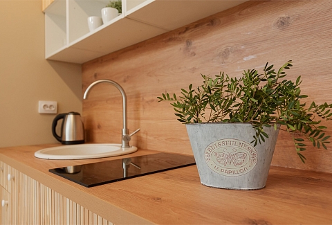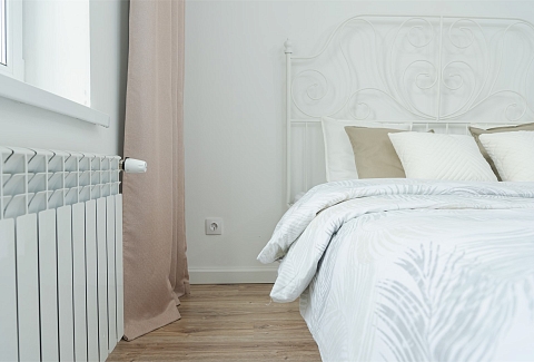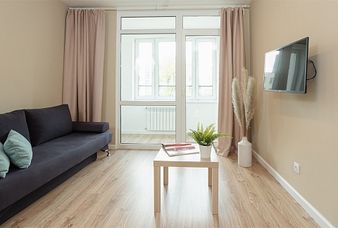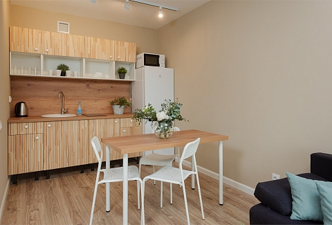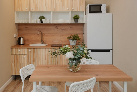 В номере: вешалка, диван раскладной, зеркало, кровать двуспальная, прикроватный столик, стол, стулья, шкаф, гладильная доска, микроволновая печь, набор посуды, плита электрическая, стиральная машина, телевизор, утюг, холодильник, электрочайник