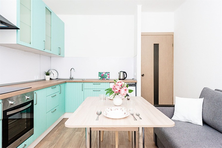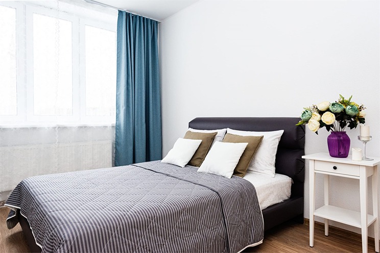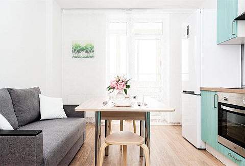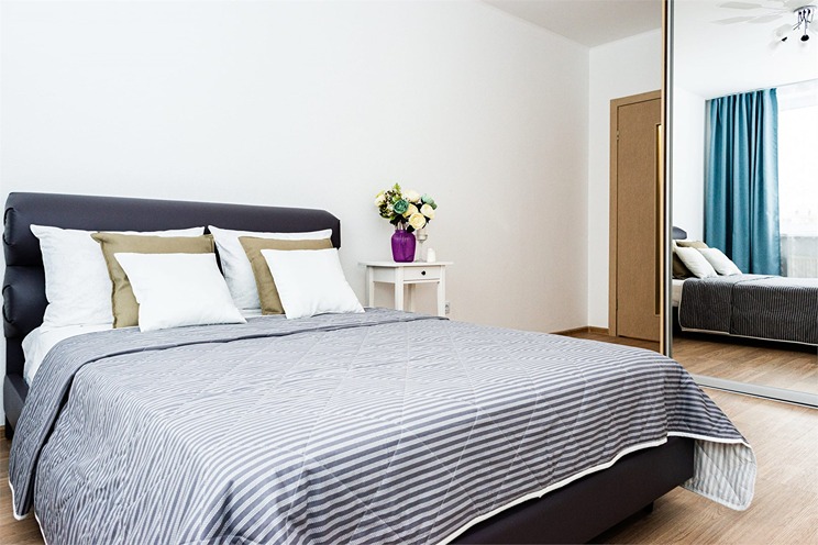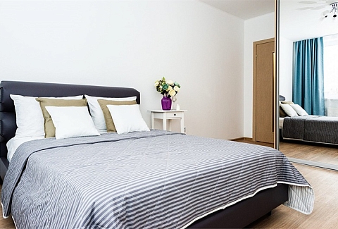 В номере: вешалка, диван раскладной, зеркало, кровать двуспальная, прикроватные тумбочки, стол, стулья, шкаф, гладильная доска, духовой шкаф, микроволновая печь, набор посуды, плита электрическая, стиральная машина, телевизор, утюг, холодильник, электрочайник