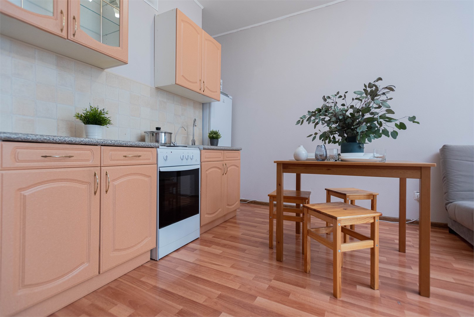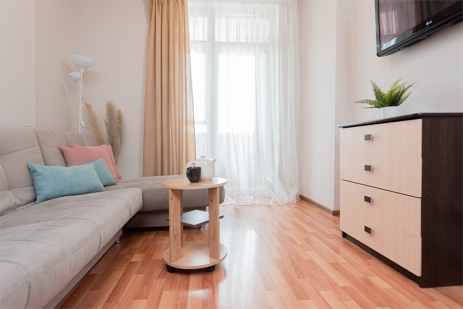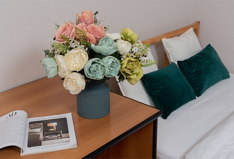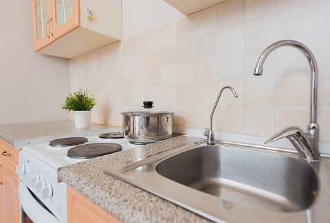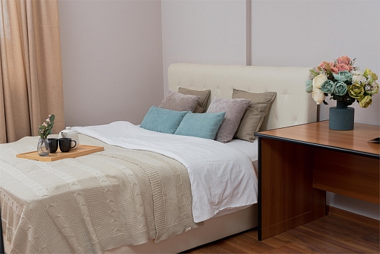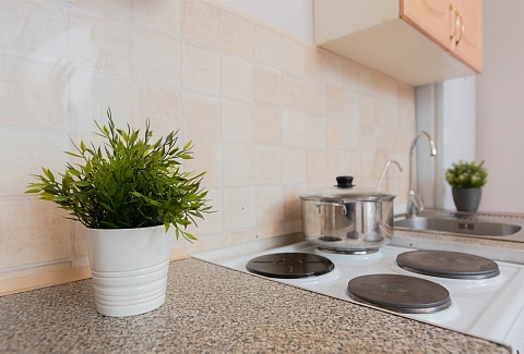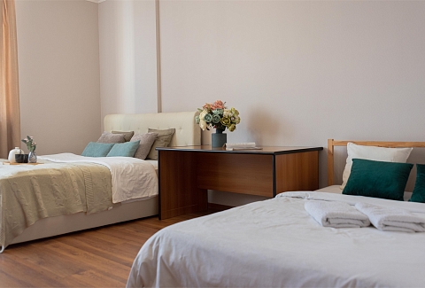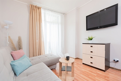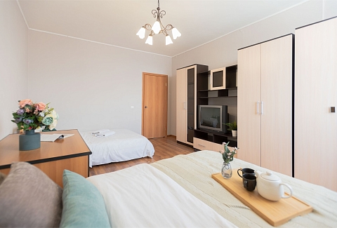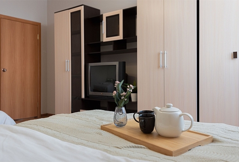 В номере: вешалка, диван раскладной, зеркало, кровать двуспальная, стол, стулья, шкаф, гладильная доска, духовой шкаф, микроволновая печь, набор посуды, плита электрическая, стиральная машина, сушилка для белья, телевизор, утюг, холодильник, электрочайник