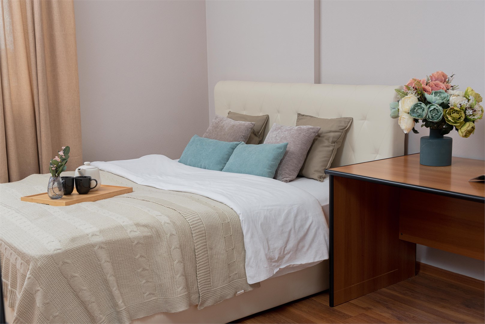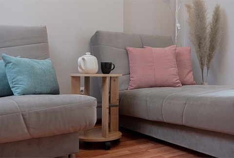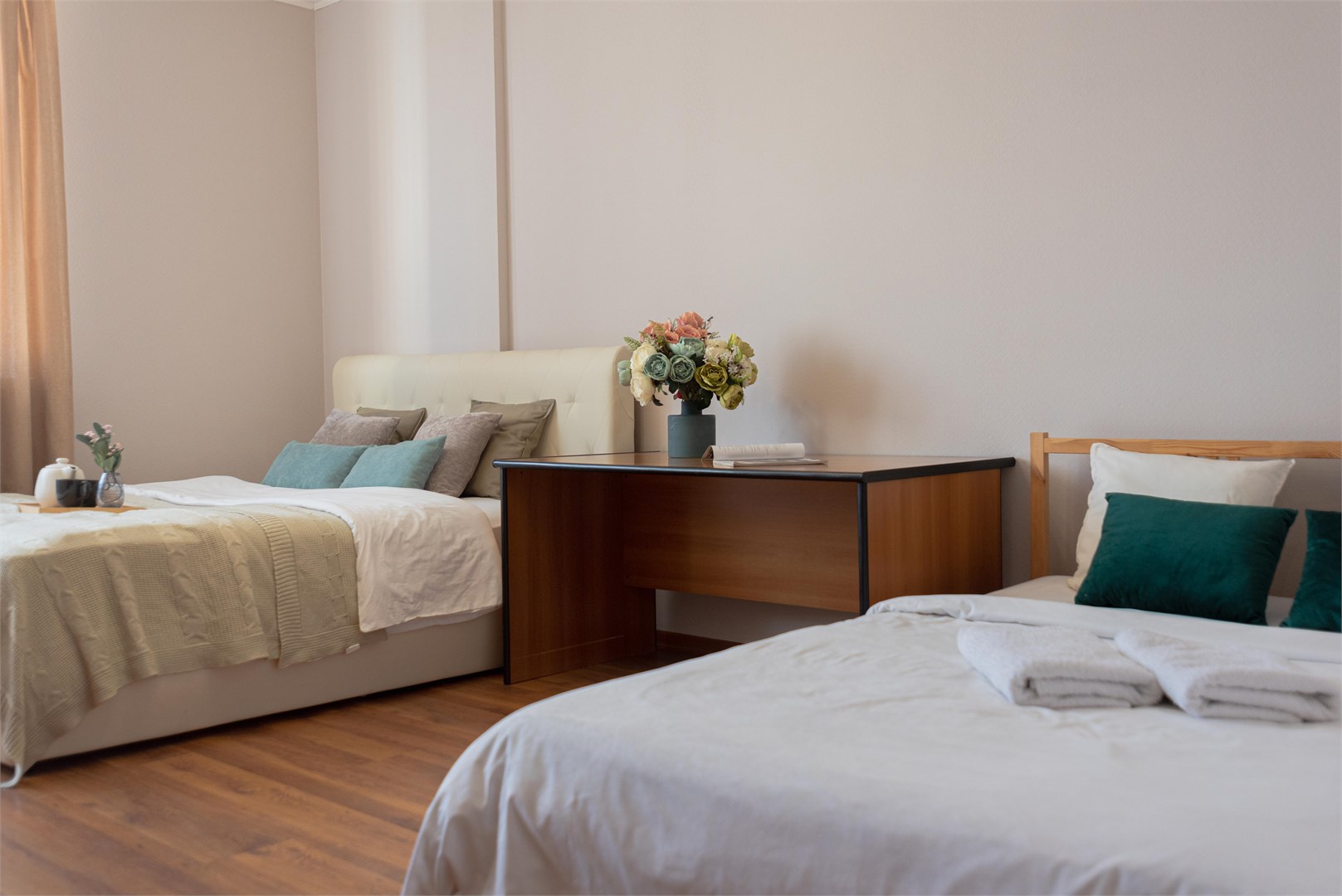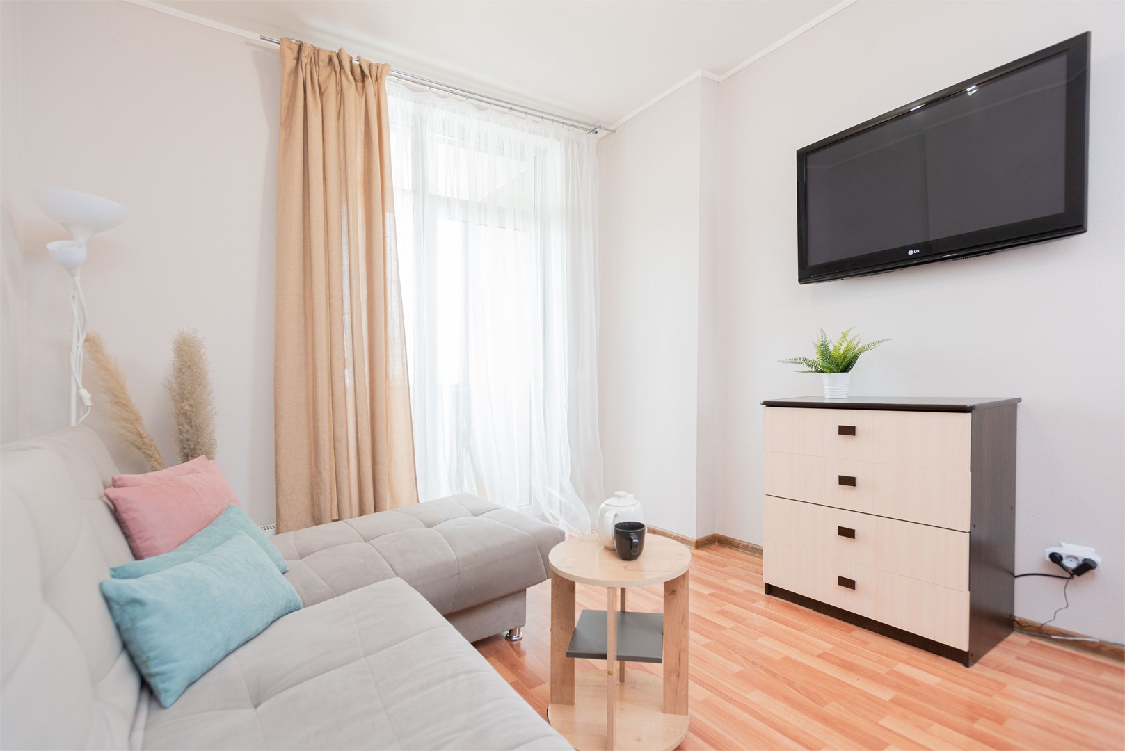В номере: вешалка, диван раскладной, зеркало, кровать двуспальная, стол, стулья, шкаф, гладильная доска, духовой шкаф, микроволновая печь, набор посуды, плита электрическая, стиральная машина, сушилка для белья, телевизор, утюг, холодильник, электрочайник