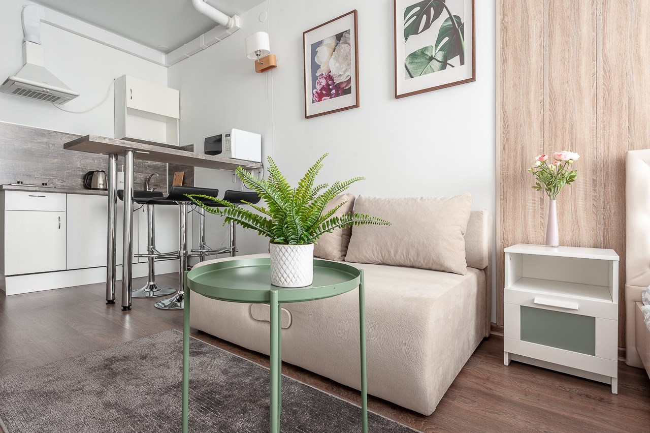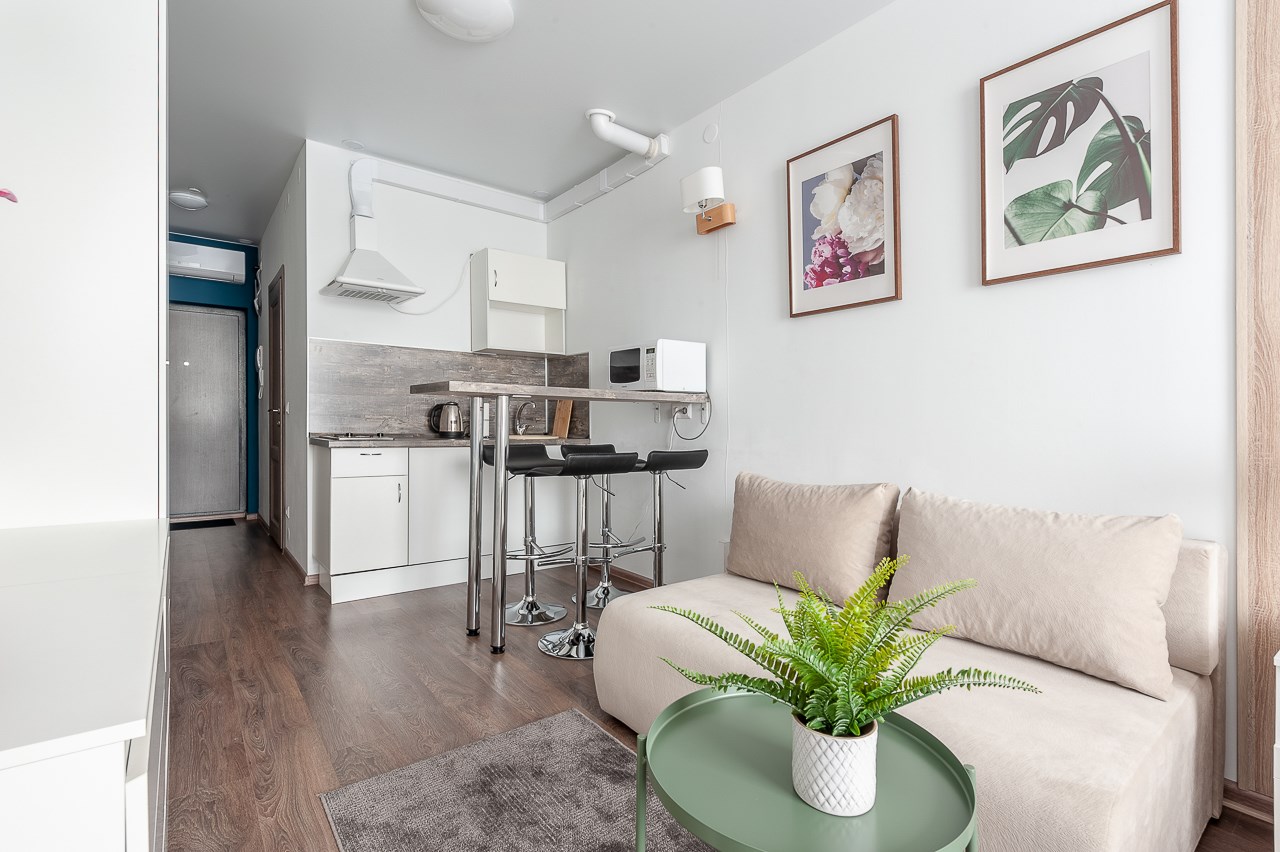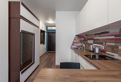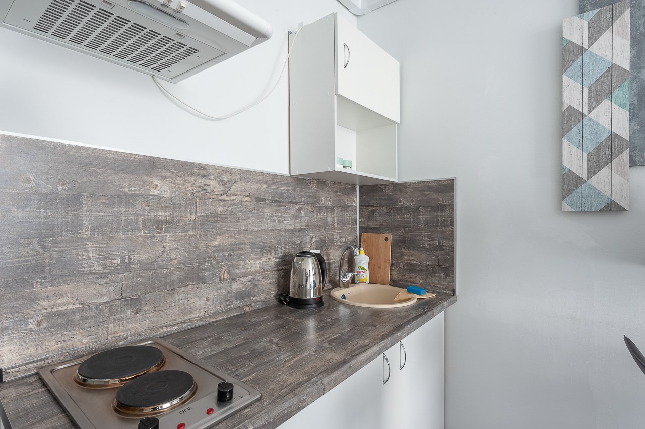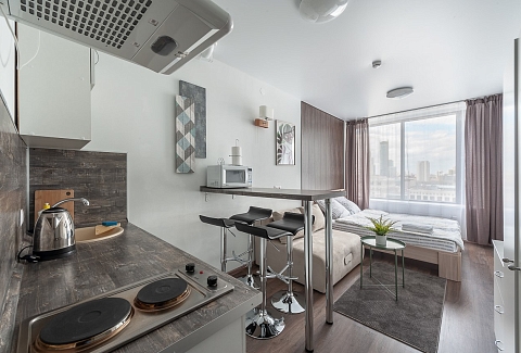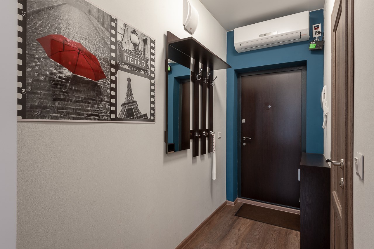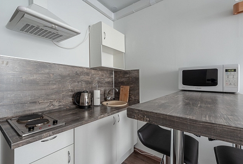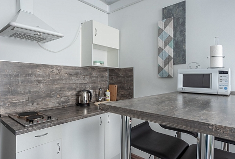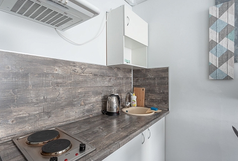 В номере: вешалка, диван раскладной, зеркало, кровать двуспальная, стол, стулья, шкаф, гладильная доска, кондиционер, микроволновая печь, мини-холодильник, плита электрическая, стиральная машина, сушилка для белья, телевизор, утюг, электрочайник