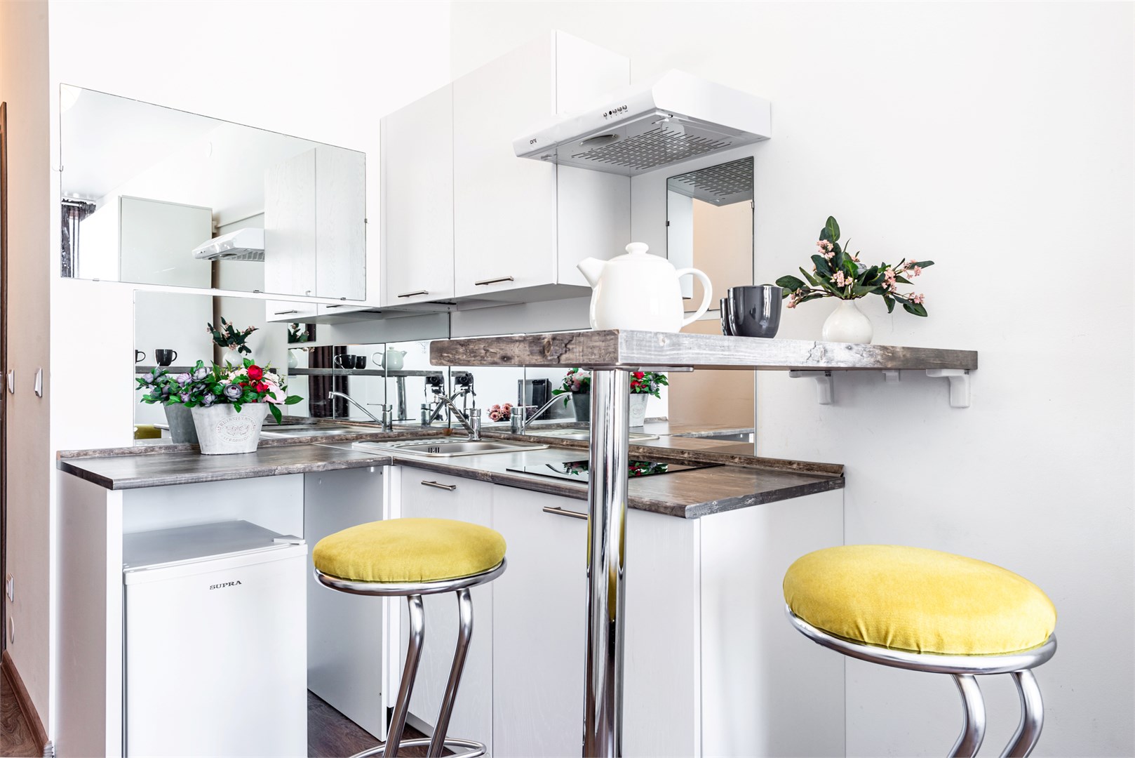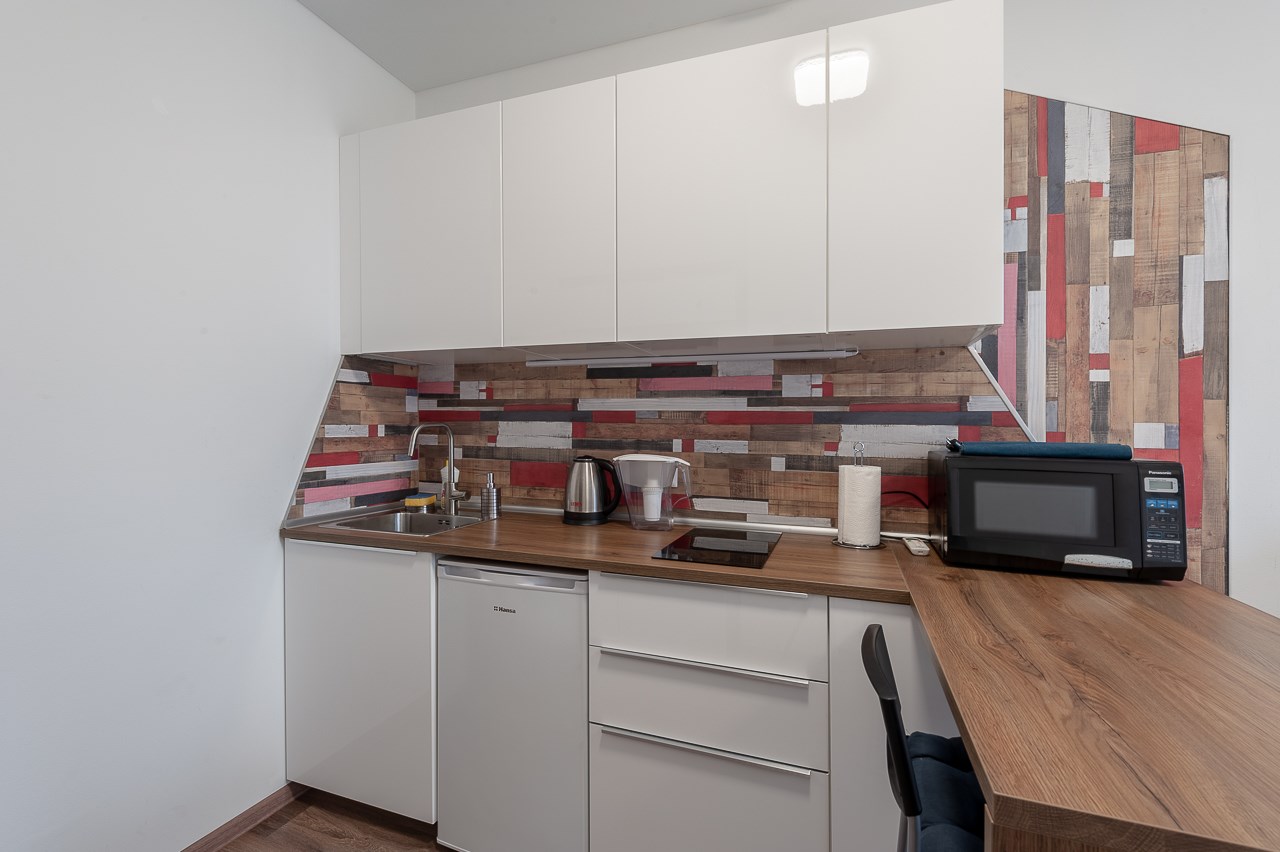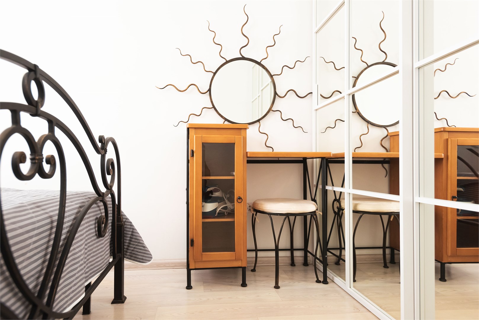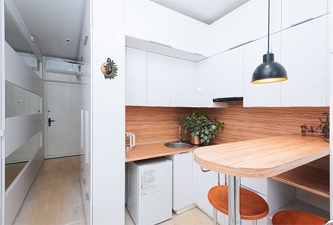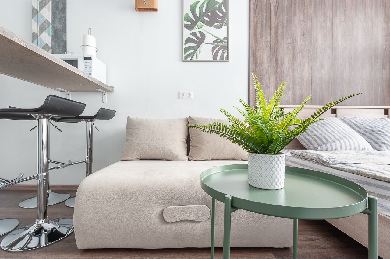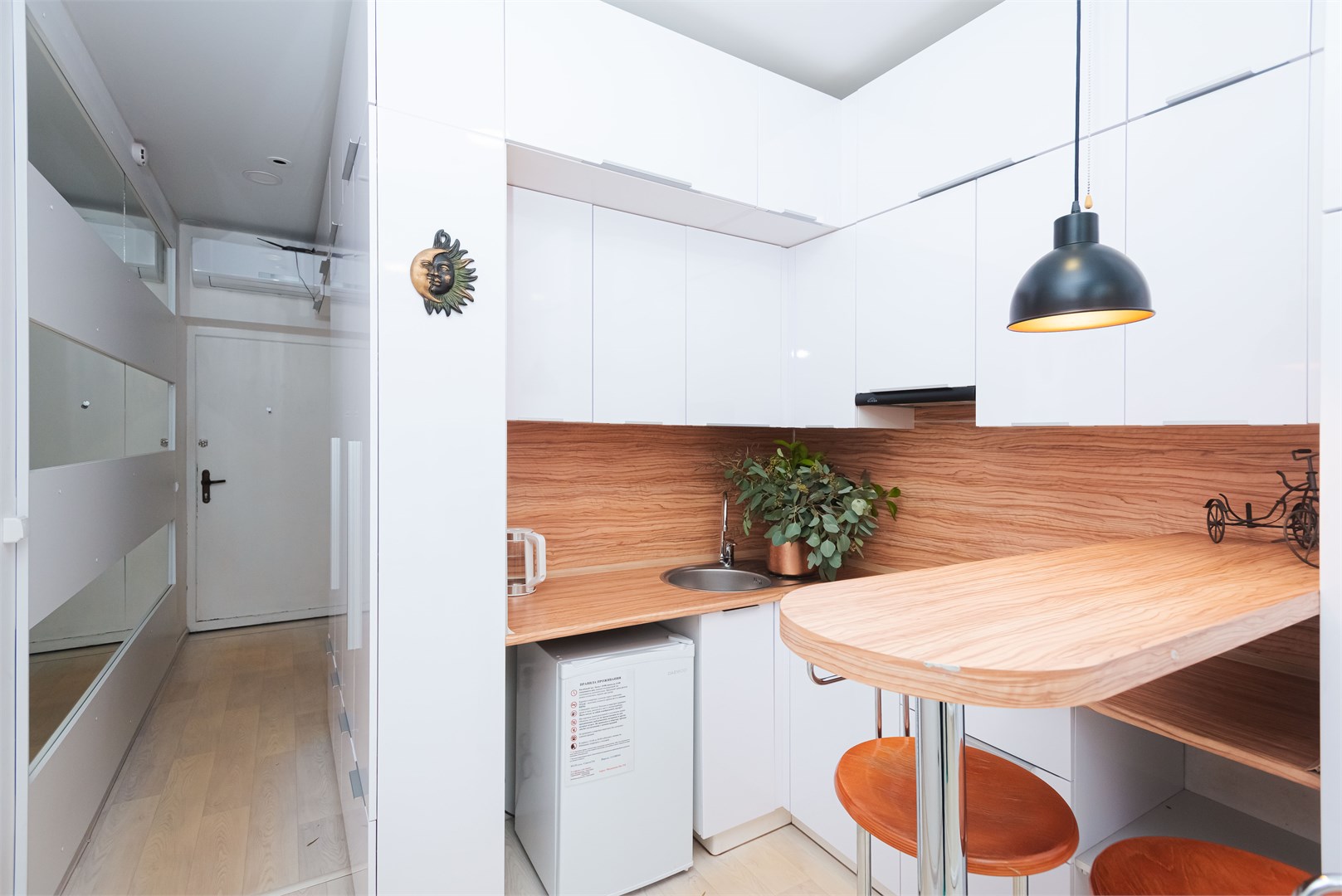 В номере: вешалка, диван раскладной, зеркало, кровать двуспальная, стол, стулья, шкаф, гладильная доска, кондиционер, микроволновая печь, мини-холодильник, плита электрическая, стиральная машина, сушилка для белья, телевизор, утюг, электрочайник