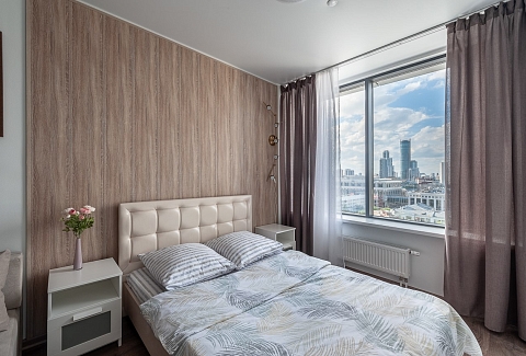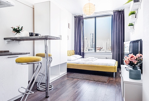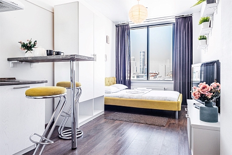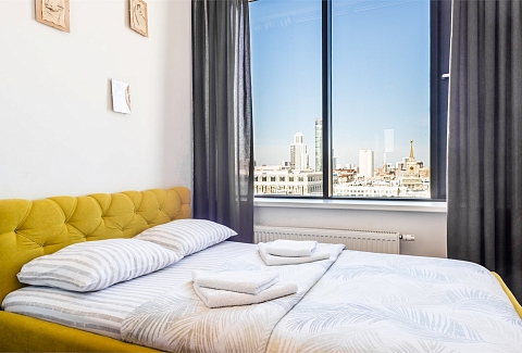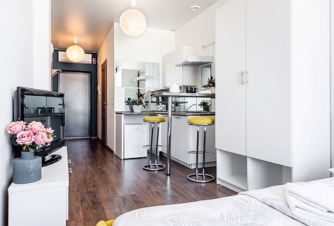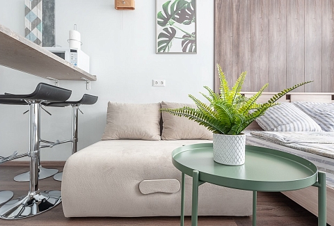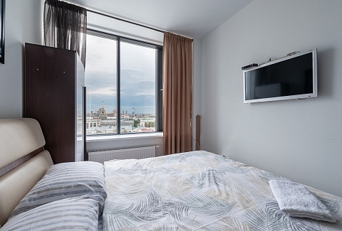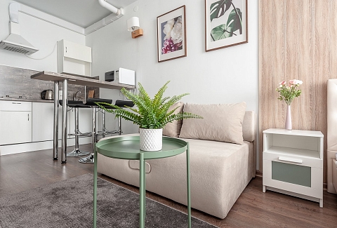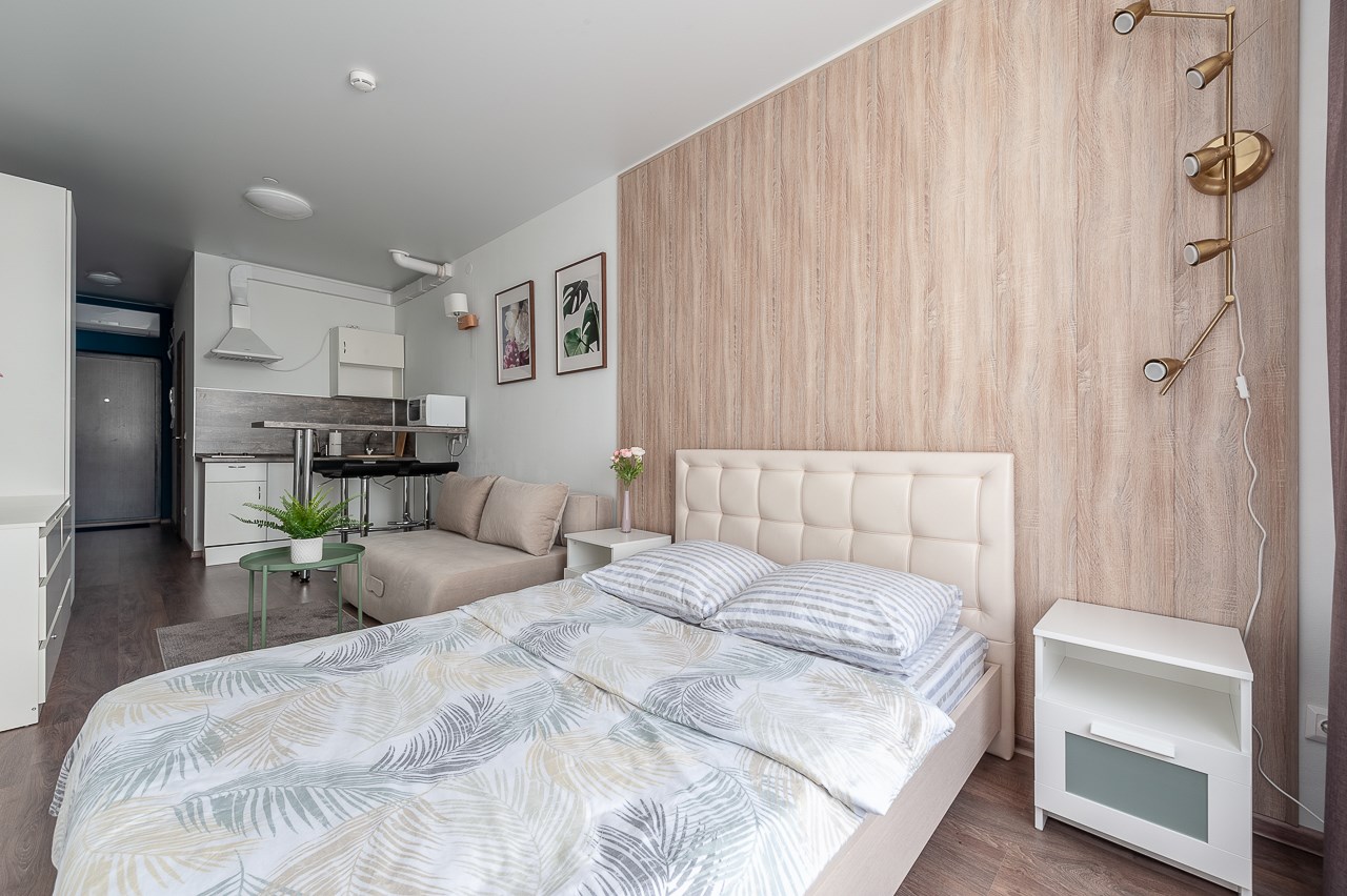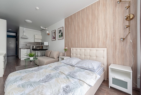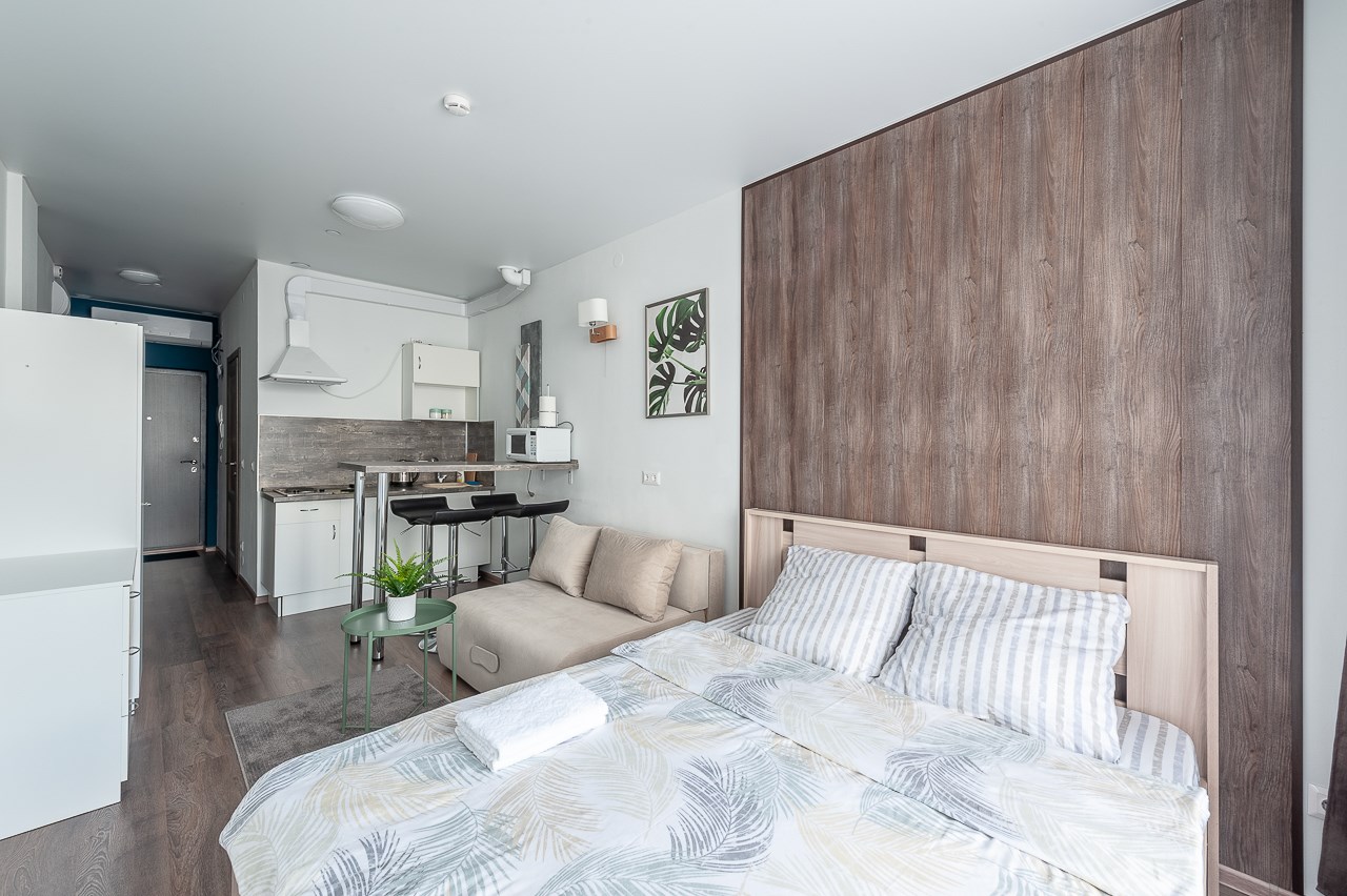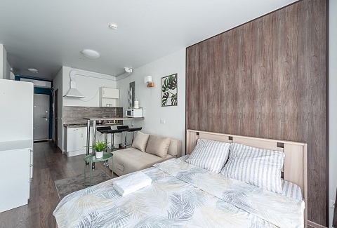 В номере: вешалка, диван раскладной, зеркало, кровать двуспальная, прикроватная тумбочка, стол, стулья, шкаф, гладильная доска, кондиционер, микроволновая печь, мини-холодильник, набор посуды, плита электрическая, стиральная машина, сушилка для белья, телевизор, утюг, электрочайник
