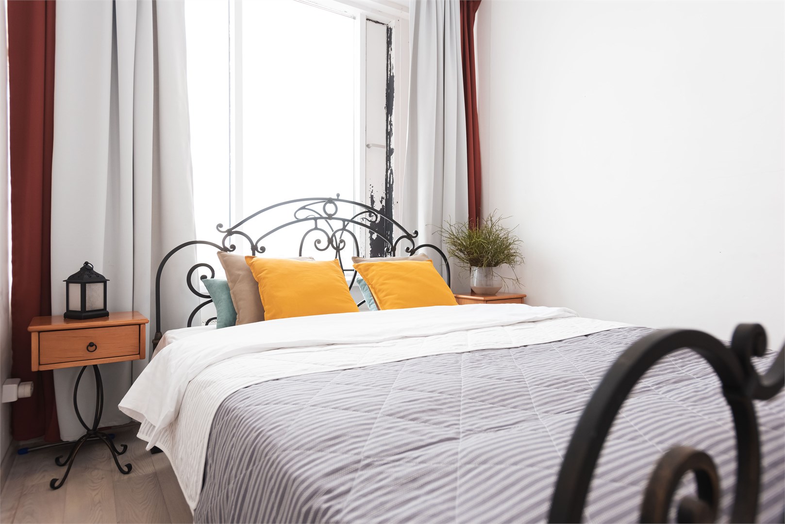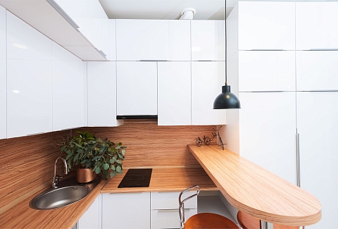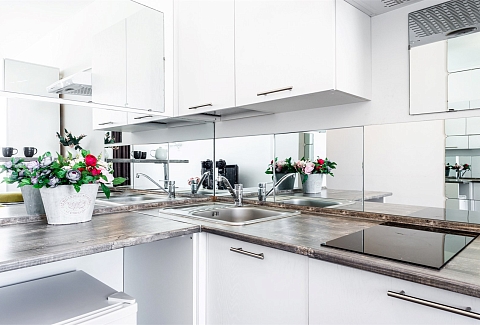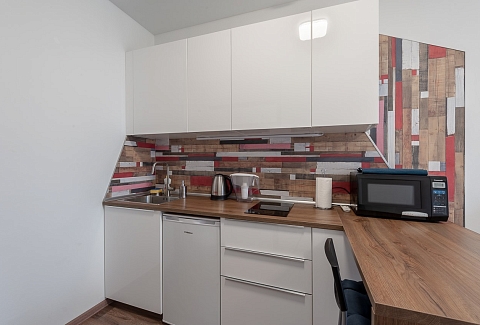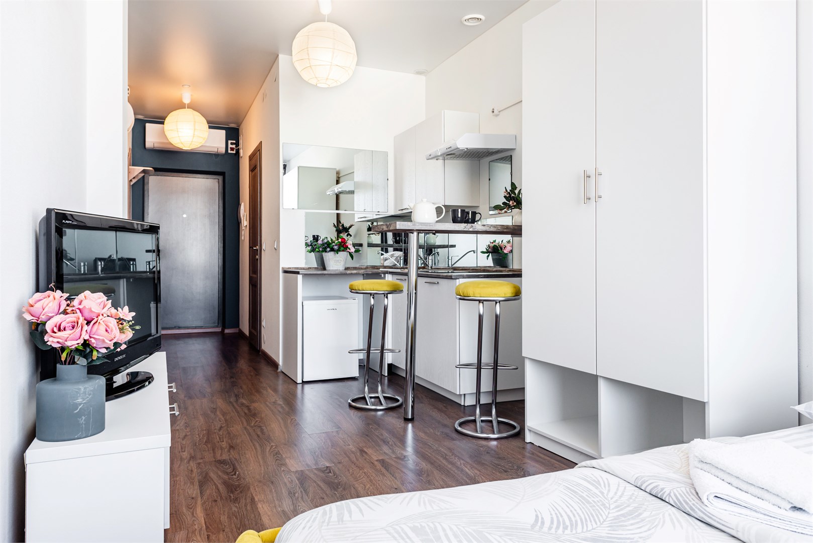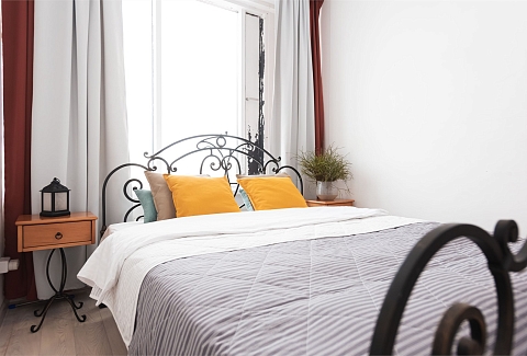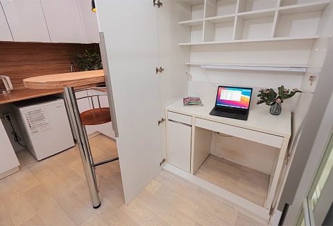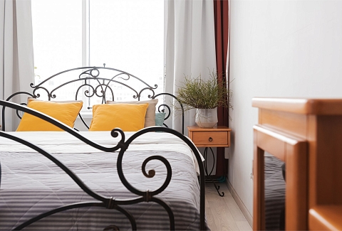 В номере: вешалка, зеркало, кровать двуспальная, прикроватные тумбочки, стол, стол для компьютера, стулья, шкаф, гладильная доска, кондиционер, микроволновая печь, мини-холодильник, набор посуды, плита электрическая, стиральная машина, сушилка для белья, телевизор, утюг, электрочайник