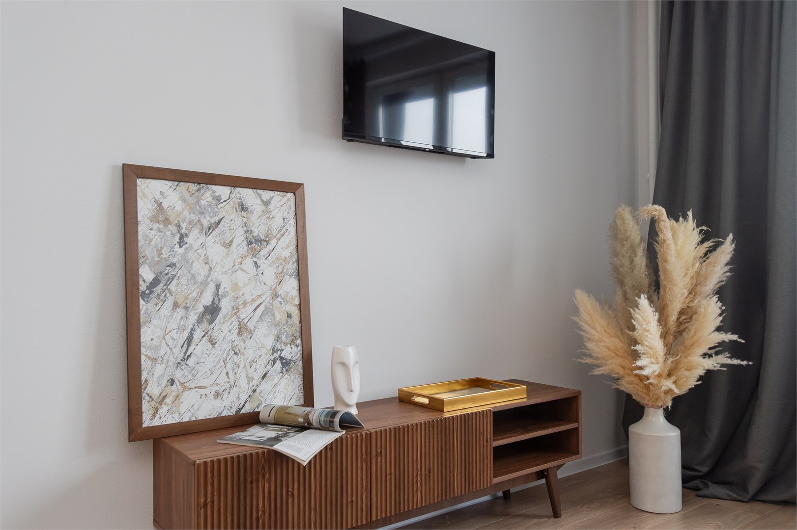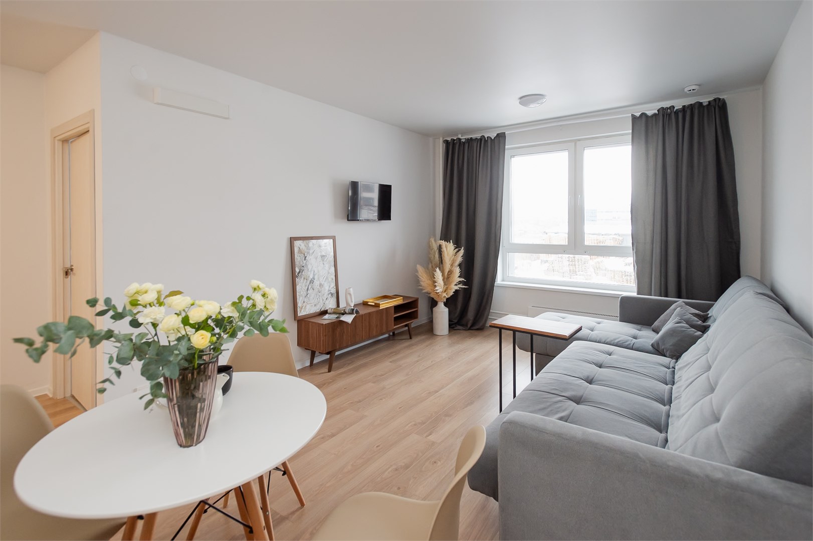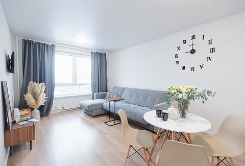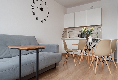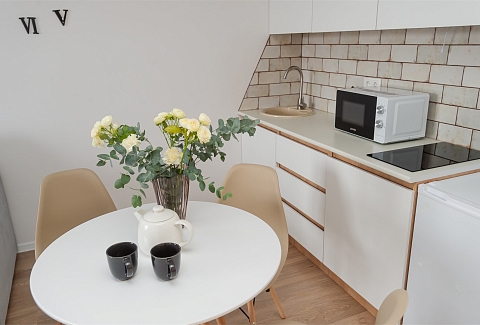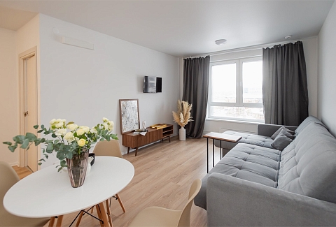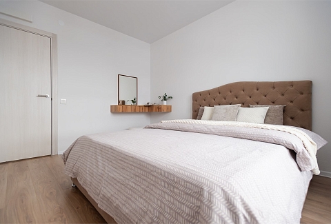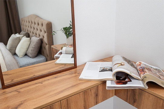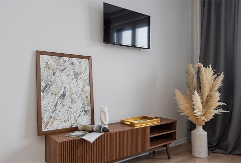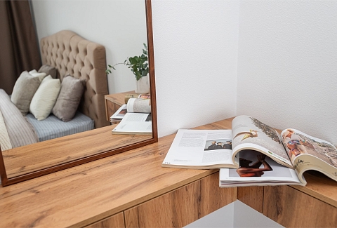 В номере: вешалка, диван раскладной, зеркало, кровать двуспальная, пуфик, стол, столик туалетный, шкаф, гладильная доска, микроволновая печь, мини-холодильник, набор посуды, плита электрическая, стиральная машина, сушилка для белья, телевизор, утюг, электрочайник
