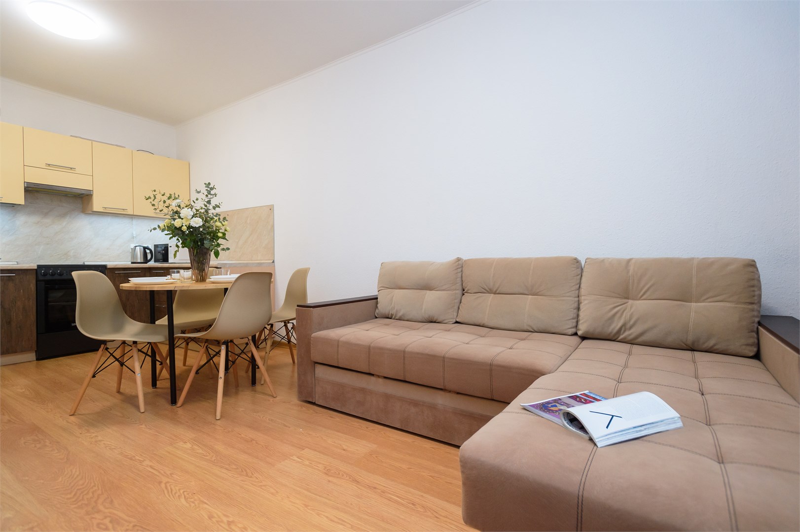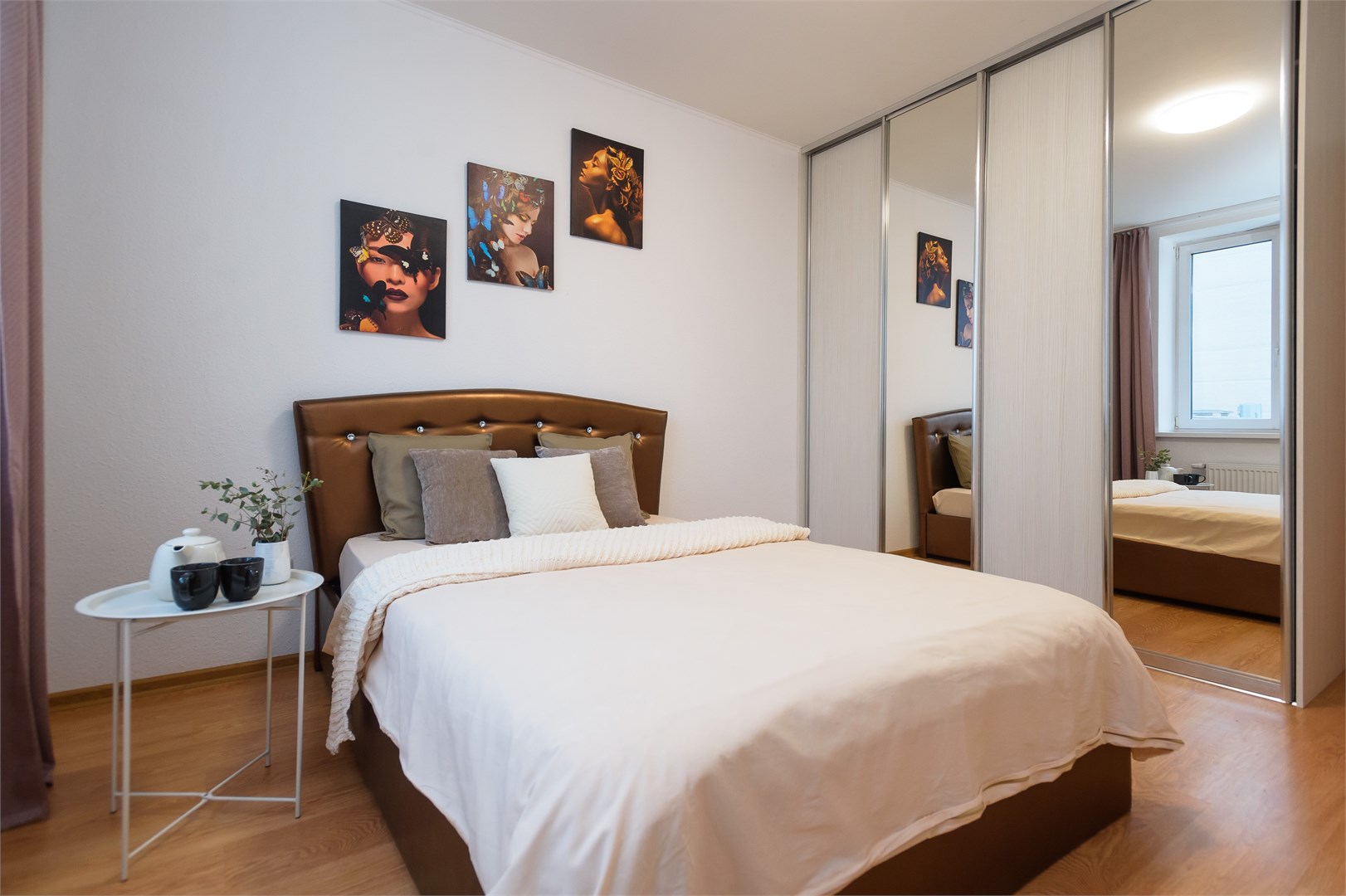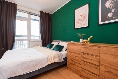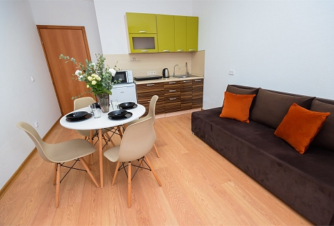В номере: вешалка, диван раскладной, зеркало, кровать двуспальная, прикроватный столик, стол, стулья, шкаф-купе, гладильная доска, микроволновая печь, набор посуды, плита электрическая, стиральная машина, сушилка для белья, телевизор, утюг, холодильник, электрочайник